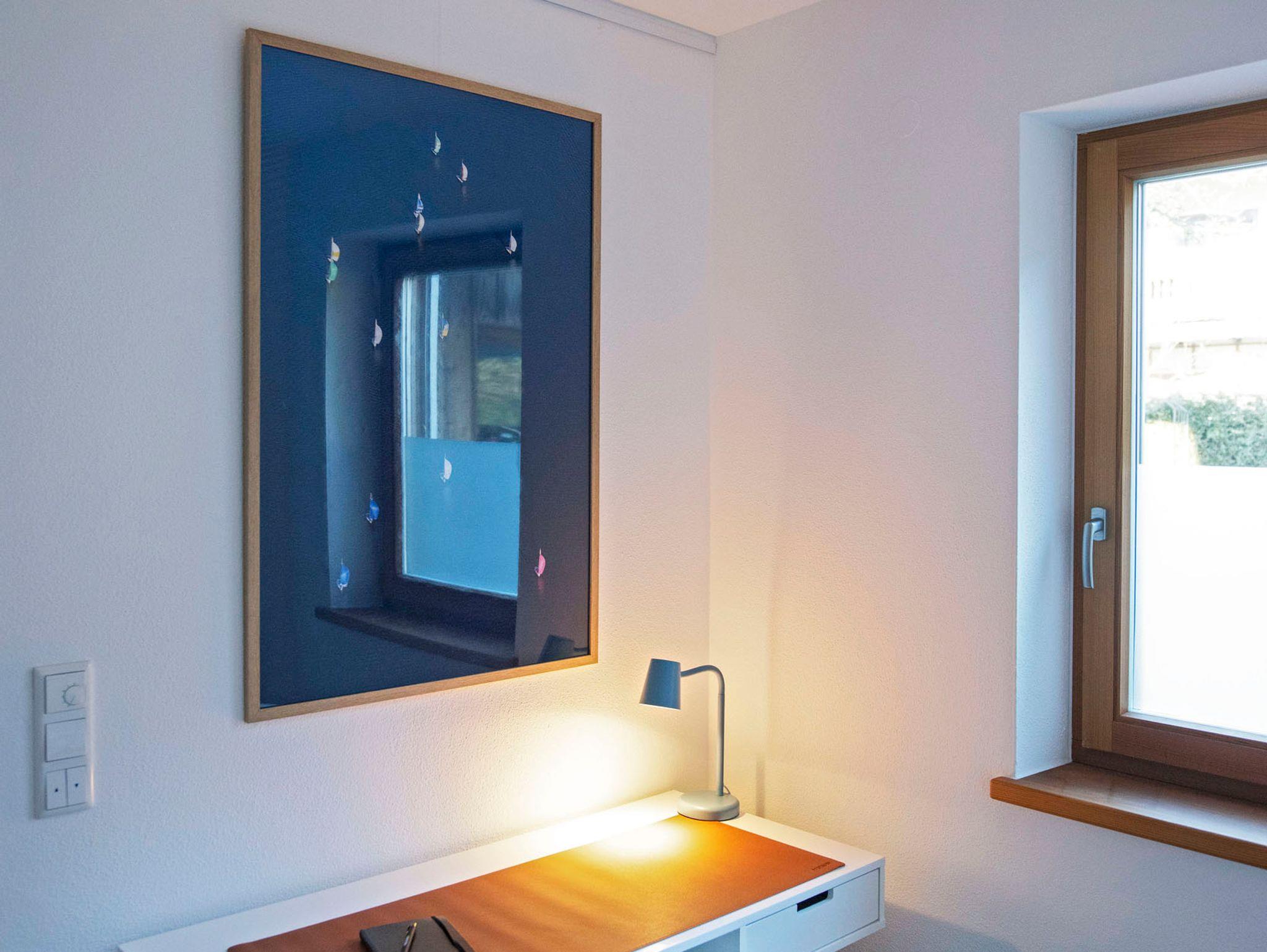 Die Wohnung liegt im hinteren Teil des Grundstücks, der Blick zeigt in die Berge und Richtung See.