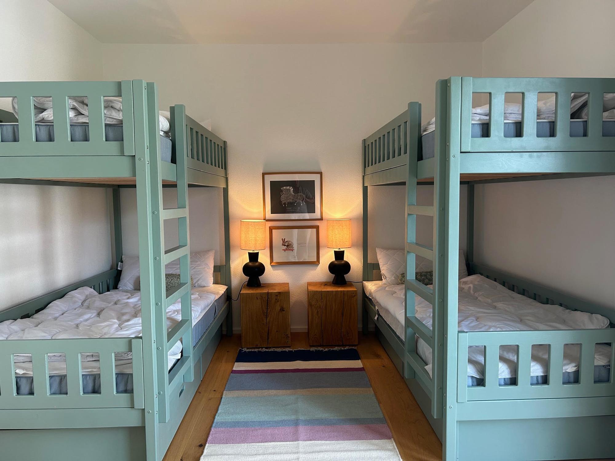 Das Schlafzimmer ist mit einem gemütlichen Doppelbett ausgestattet, während das zweite Schlafzimmer mit zwei Stockbetten ideal für Kinder ist. Das Arbeitszimmer bietet die Möglichkeit, ungestört zu arbeiten. Die beiden Bäder sind modern eingerichtet: eins mit Badewanne und Dusche, das andere mit einer Dusche.