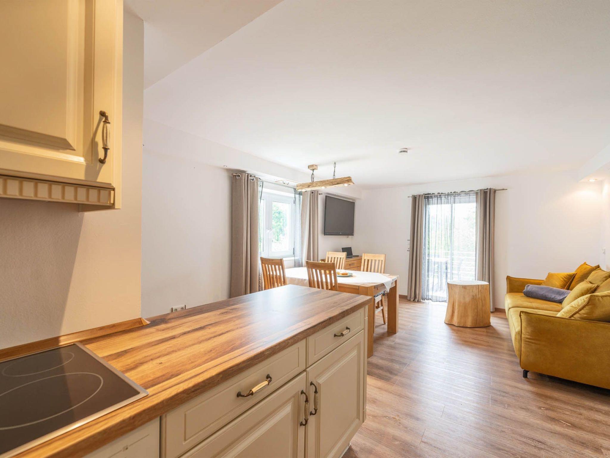 The apartment provides 80m² of living space and exudes charm and homeliness with its generosity, cosiness and comfort. There is a separate entrance. You can sleep comfortably in a big double bed with two extra-long mattresses (each 90 x 220cm), with bedside tables and reading lamps on either side, a dresser and a double-door wardrobe, providing ample storage space for your luggage. The bathroom has under-floor heating and a corner bath, as well as an open shower, a washbasin with a cupboard and mirror, and a hairdryer. You can relax in the living room after a day trip on the big sofa, with a wall-mounted TV with satellite channels and a DVD player. There is also a stereo system with a USB port for your entertainment. Free wireless Internet access is available. You go past the dining table with three chairs to the fully-equipped country kitchen, which enables comprehensive self-catering with a four-zone ceramic hob, a fridge and freezer, a dishwasher, a microwave, a coffee machine, a kettle and a toaster. Owing to the additional room, it is possible to accommodate two further people. There is a separate WC and there is also generous cloakroom space.