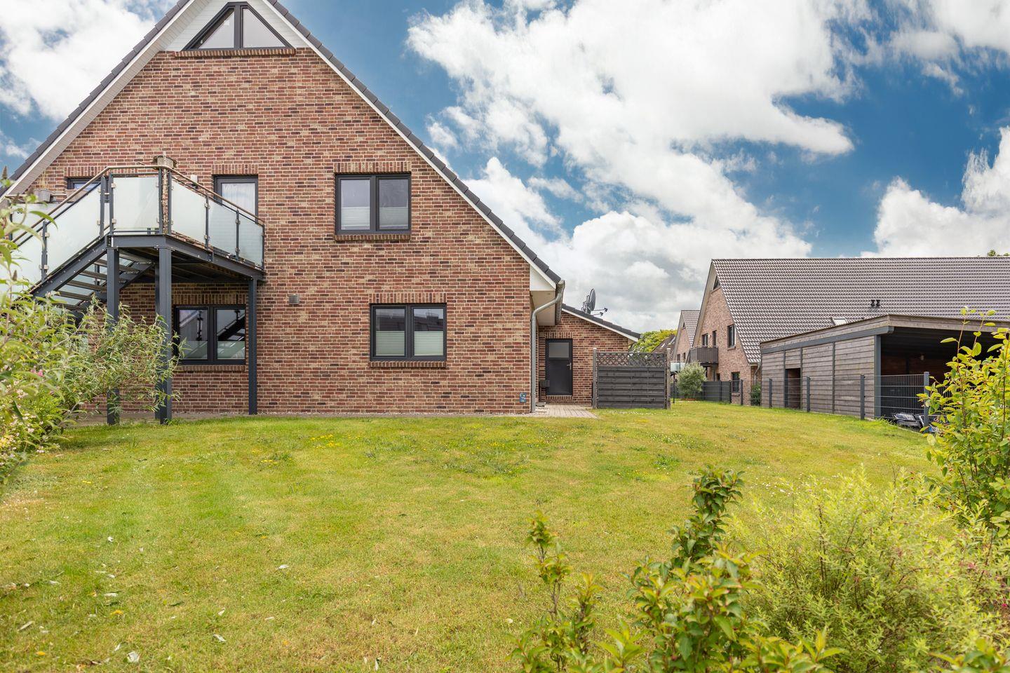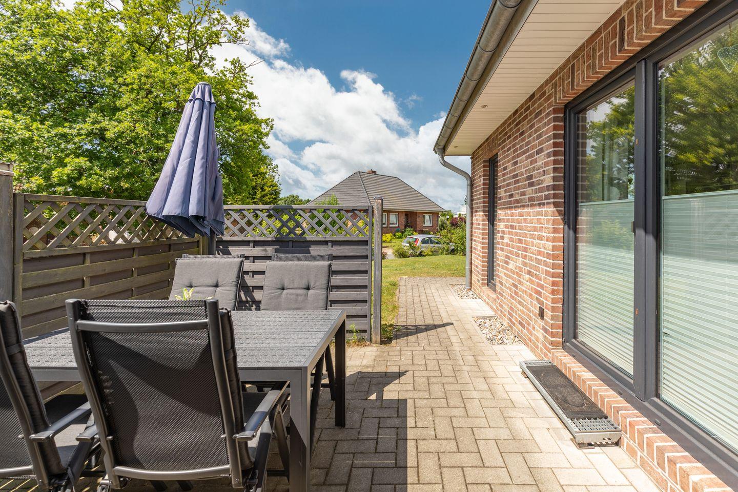 Draußen erwartet Sie ein wunderschön gestalteter Garten mit einer gemütlichen Terrasse – ausgestattet mit Gartenmöbeln und einem Grill, der zu geselligen Stunden im Freien einlädt.