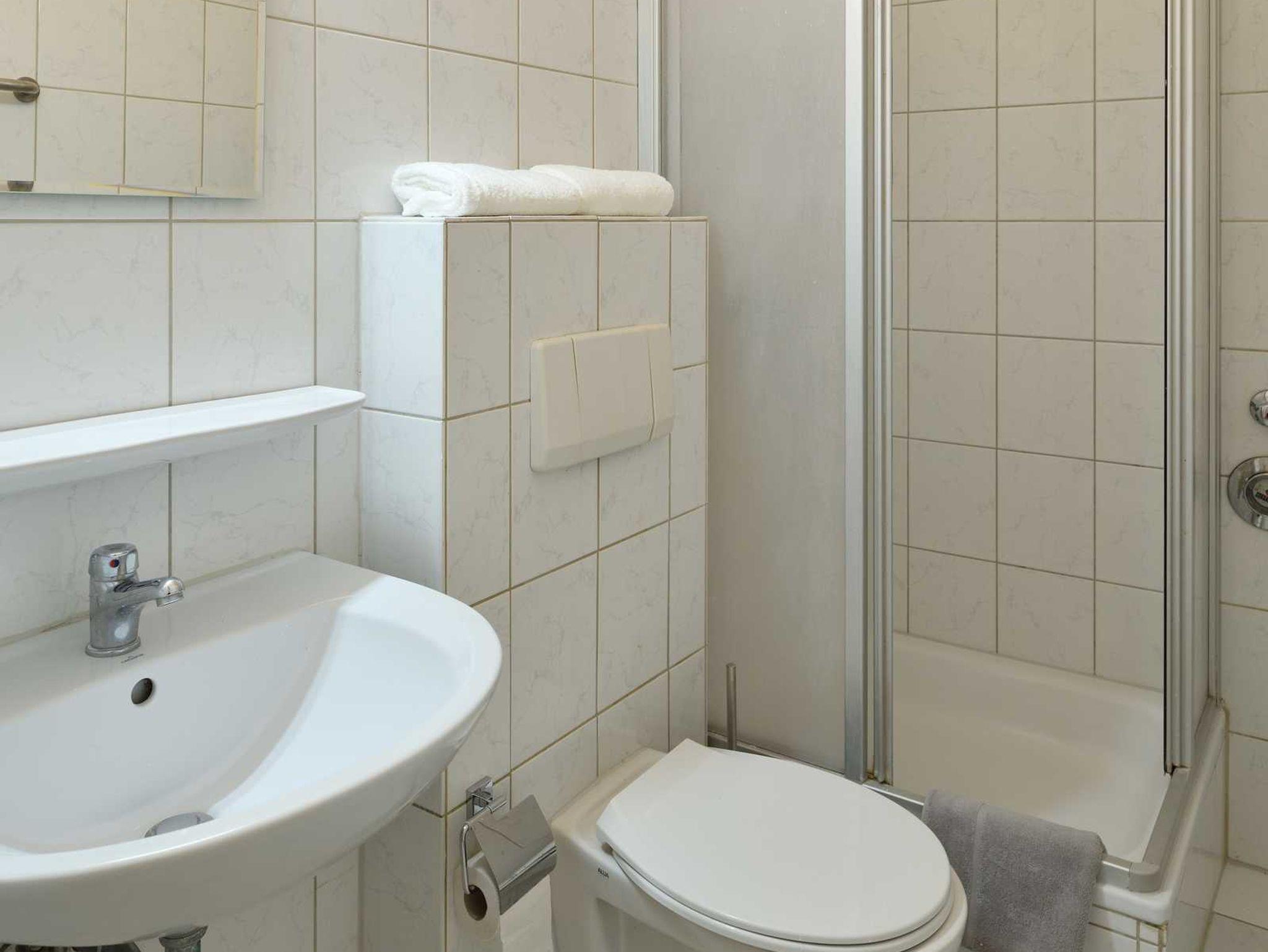 - Badezimmer mit Dusche, Waschbecken und WC