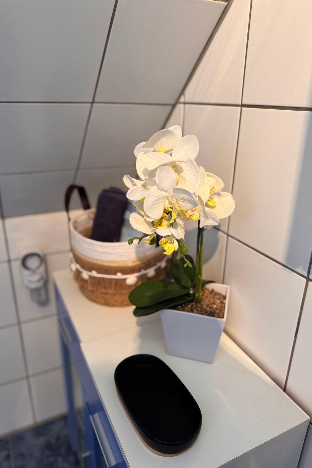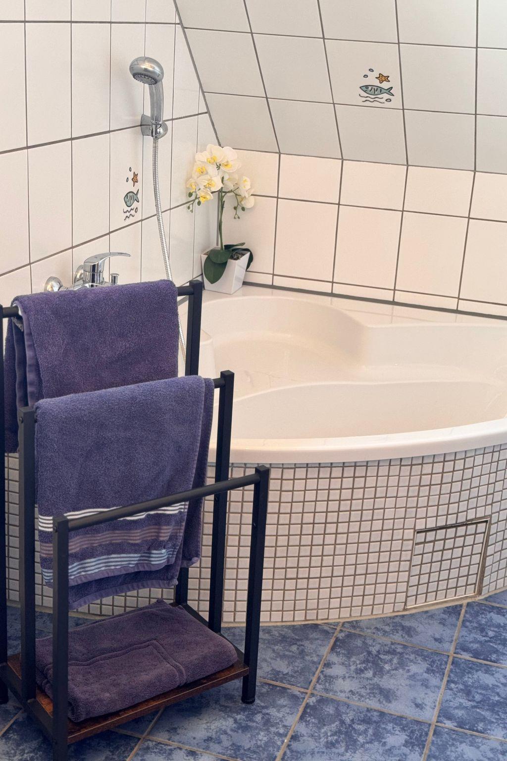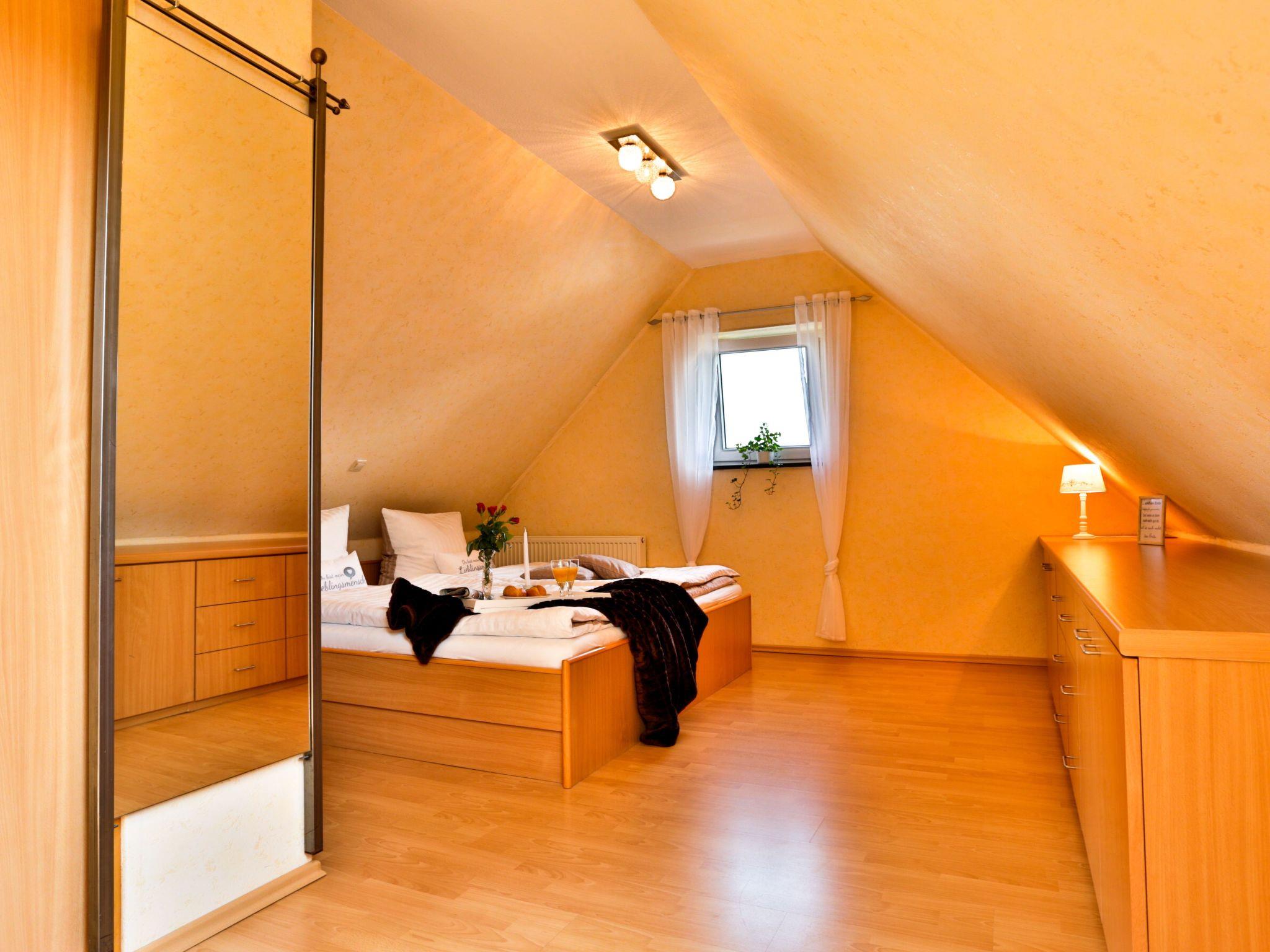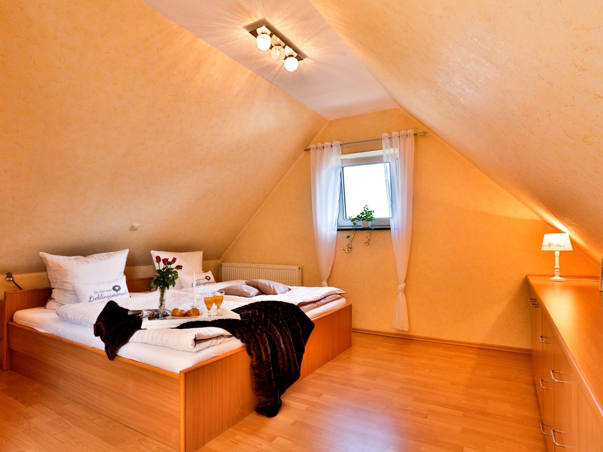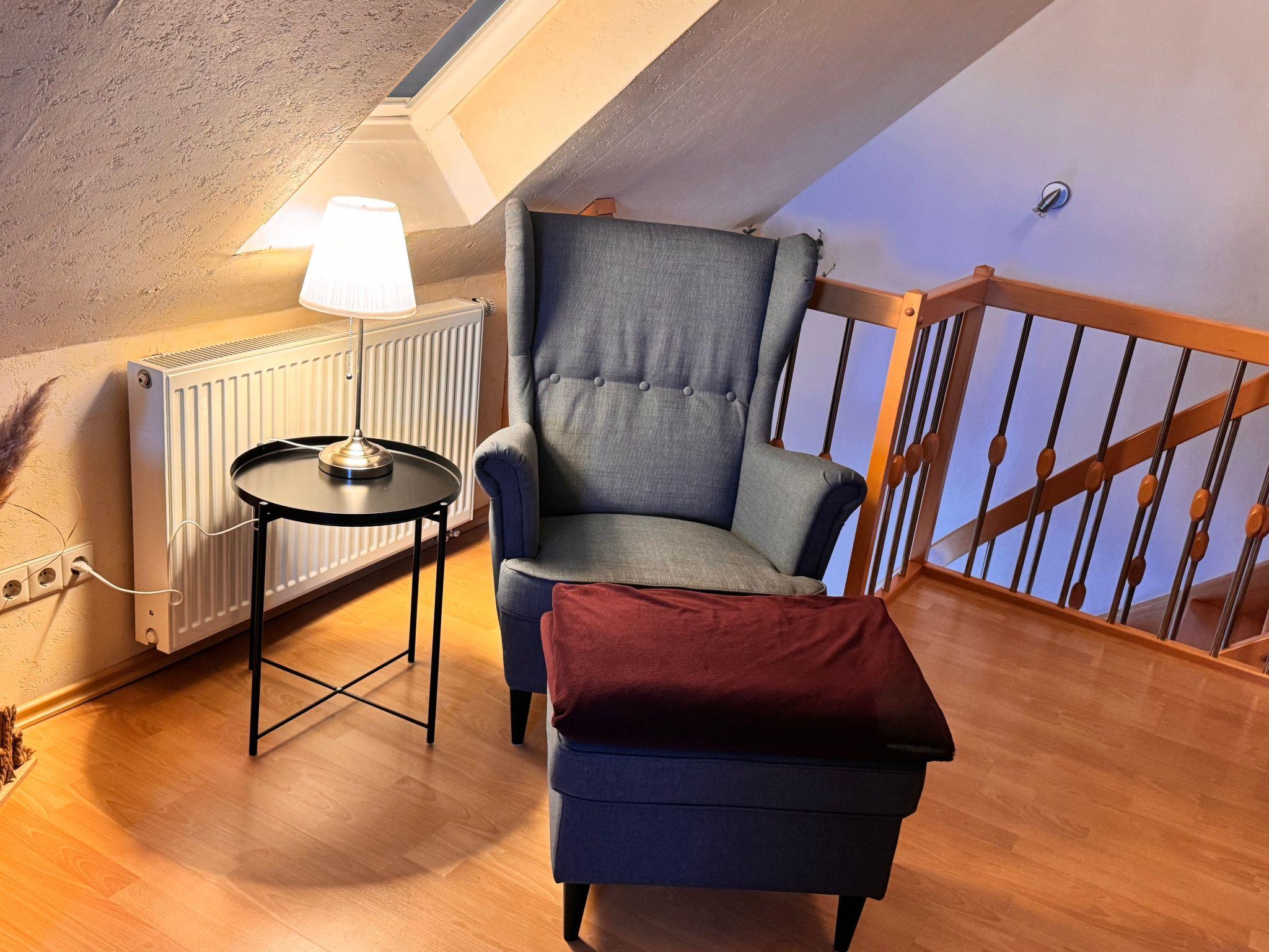 The accommodation provides and ample ca. 60m² of living space for two to four people. The house with a special flair was built with an open layout and provides everything you need. It is detached, comfortable and fully-equipped. A little hallway with stairs leads to the spacious lower floor with a lovely open built-in kitchen in an American style, equipped with an oven, a ceramic hob, an electric stove, a fridge, dishwasher, microwave, toaster, kettle and coffee machine. The modern living room provides a pull-out sofa bed for two people (140cm wide), a coffee table, a TV for leisurely evenings and a dining table with chairs. Large windows allow plenty of daylight into the generous room. Beautiful wooden stairs lead to the upper floor. The generous bedroom is light, inviting and open towards the living room. It is furnished with a double bed (180cm wide) and built-in cupboards with plenty of storage space. There is also enough space for your own supplementary bed. The generously fitted bathroom has a corner bath, shower, WC, washbasin and hairdryer. A washing machine (for use free of charge) and board games are also available. All the rooms have heating and free Wi-Fi.