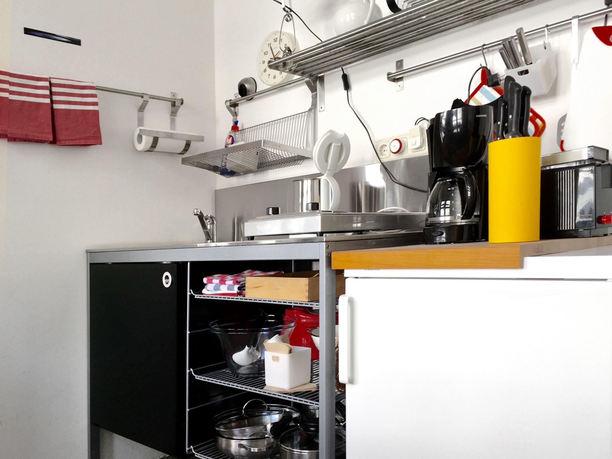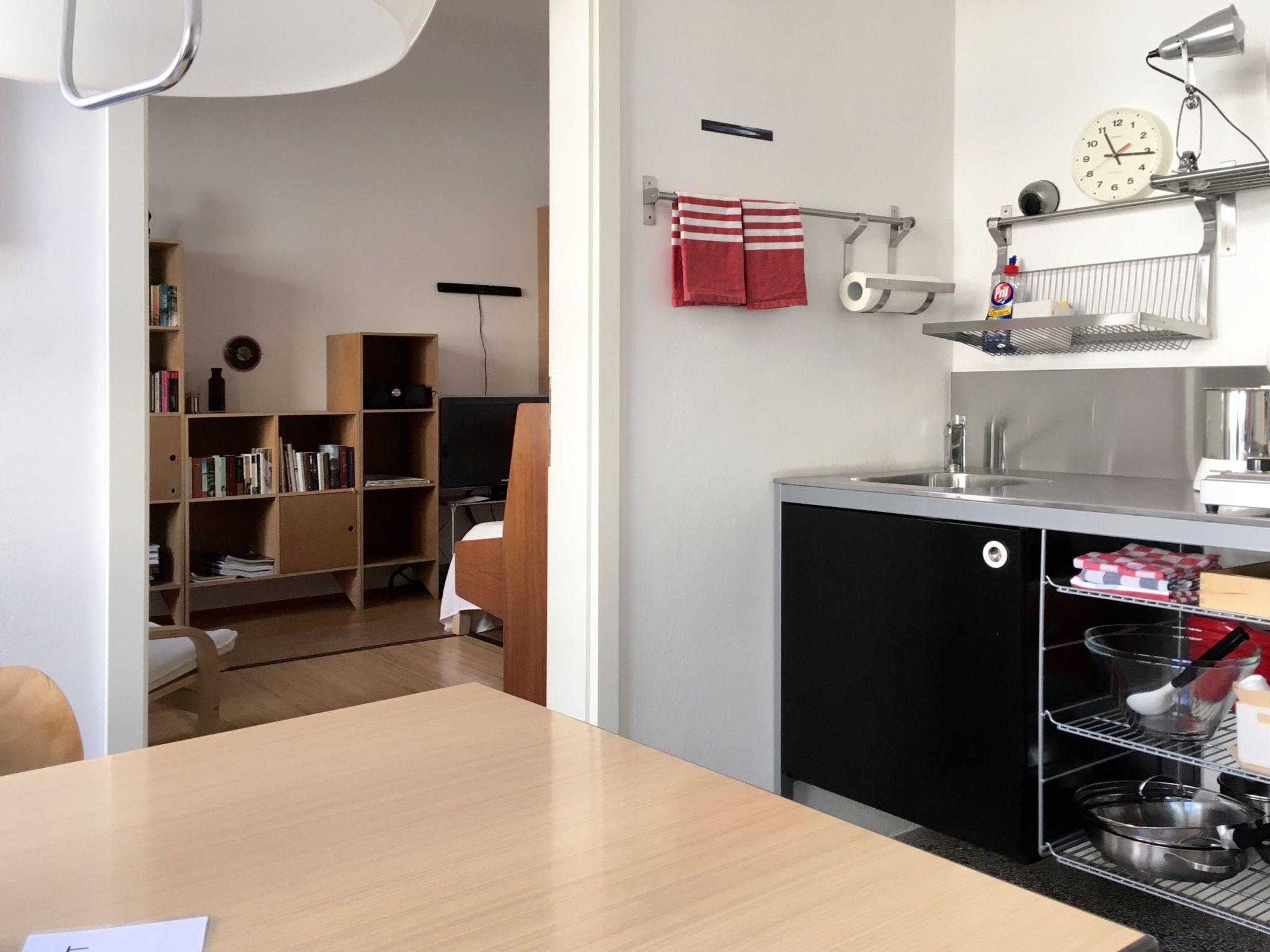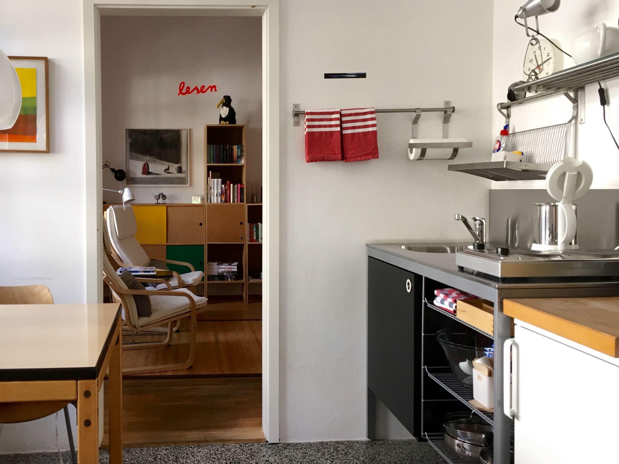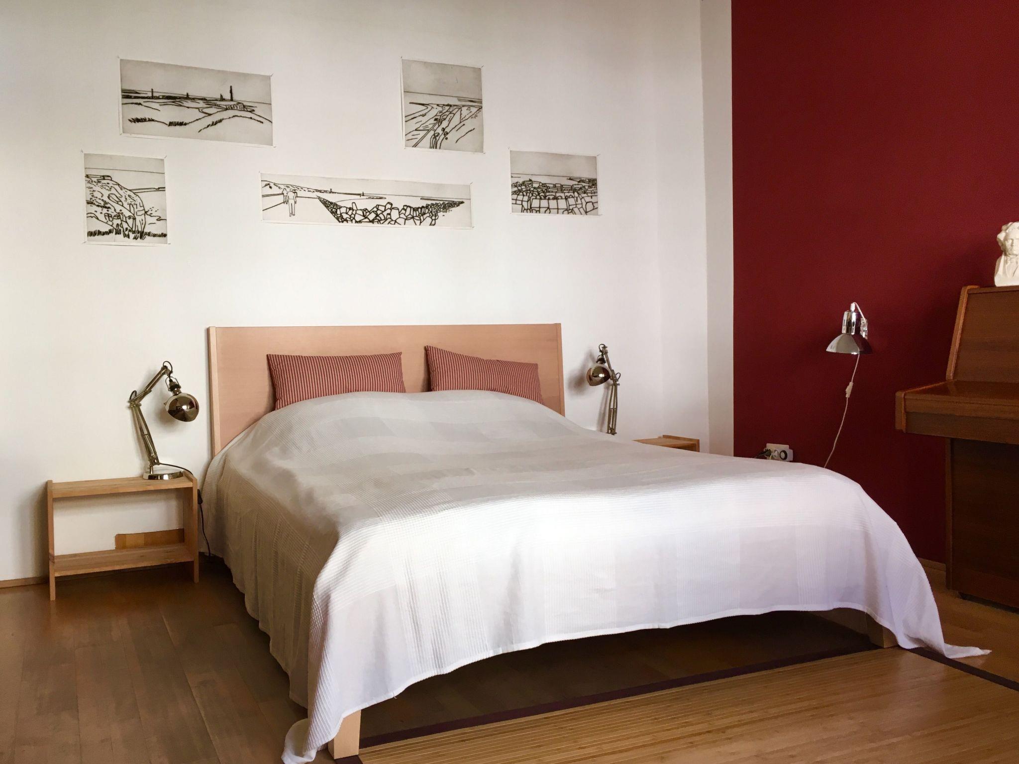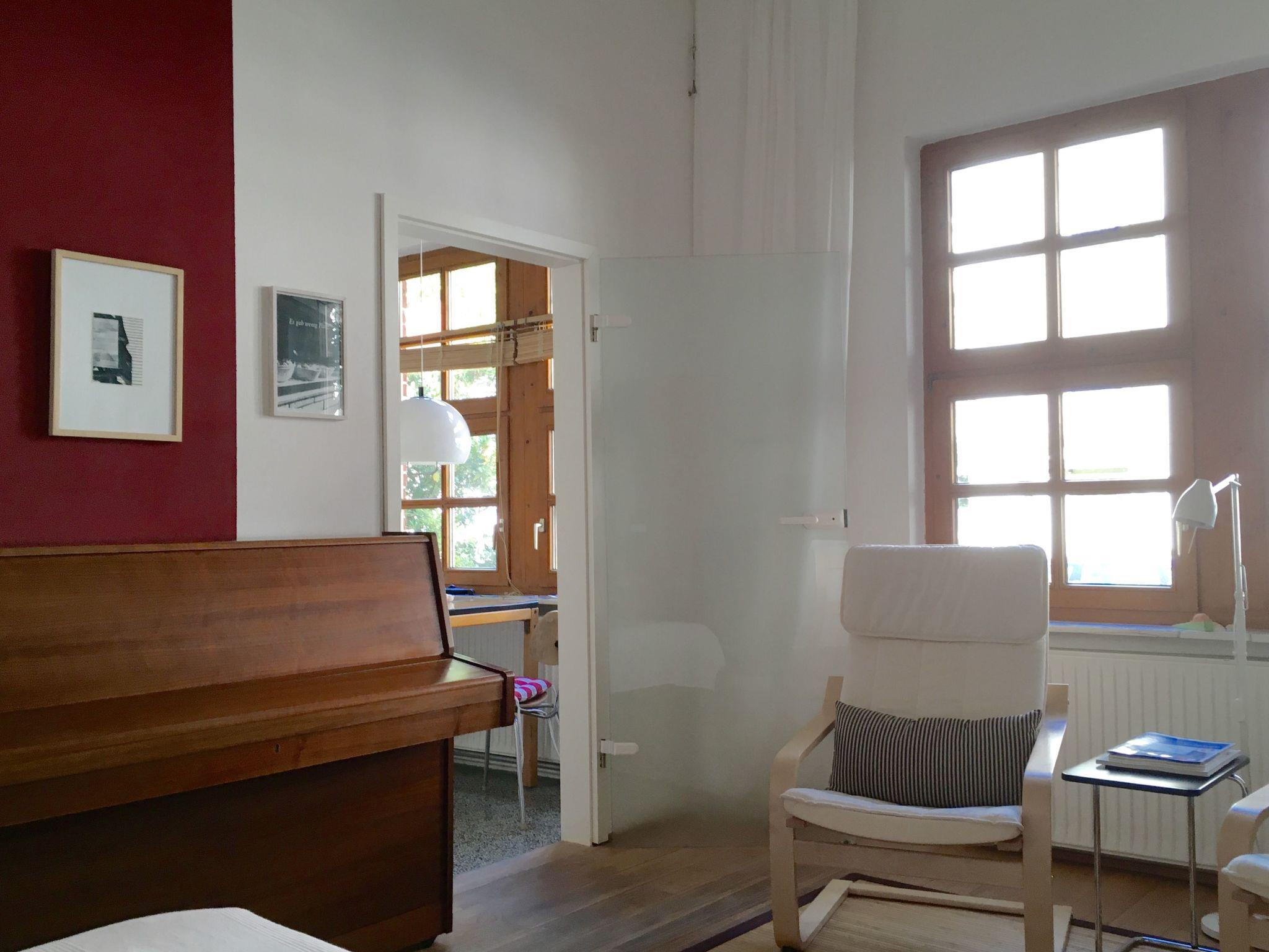The apartment of around 37m² is on the ground floor of a single-family house with a separate entrance. We offer you an original one-room apartment with an individual design, featuring contemporary art and a piano. The sleeping area has a double bed for a relaxing and pleasant night’s sleep. There is a separate kitchen equipped with a fridge, a two-ring hob, a kettle, a coffee machine, an espresso machine, a toaster and all accessories, in order to prepare simple meals. The dining space in the kitchen affords an interesting view over the front garden. The new bathroom has a rain shower and has quality fittings and materials. Wireless Internet access is available.