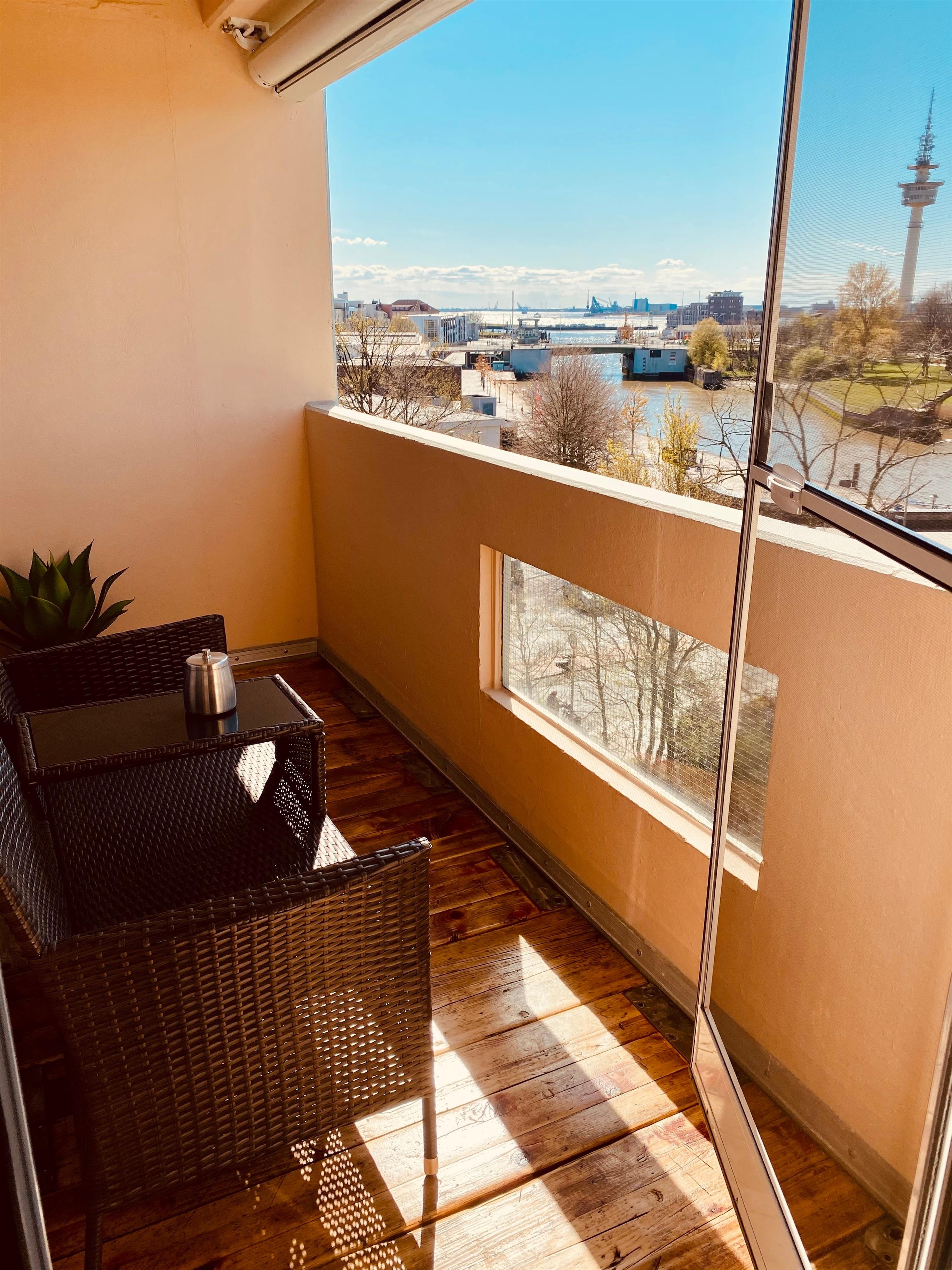 Die Ferienwohnung RIVER DOCKS bietet Ihnen von einem offenen Balkon und der zusätzlichen verglasten Loggia einen Panoramablick auf die Geeste (direkt am Haus), die Weser mit ihren Hochseeschiffen und die Skyline Bremerhavens.