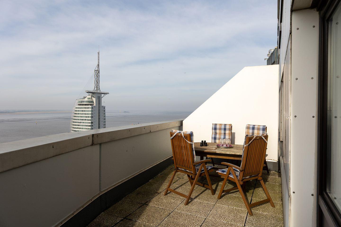 Hafenstadt. Aus dem siebten Himmel mit Balkon hoch über den Dächern