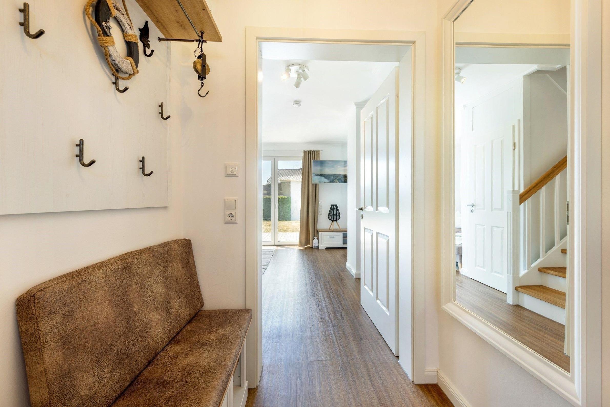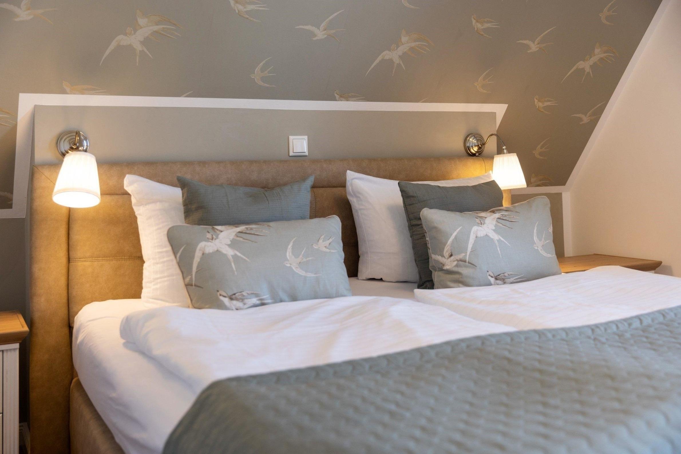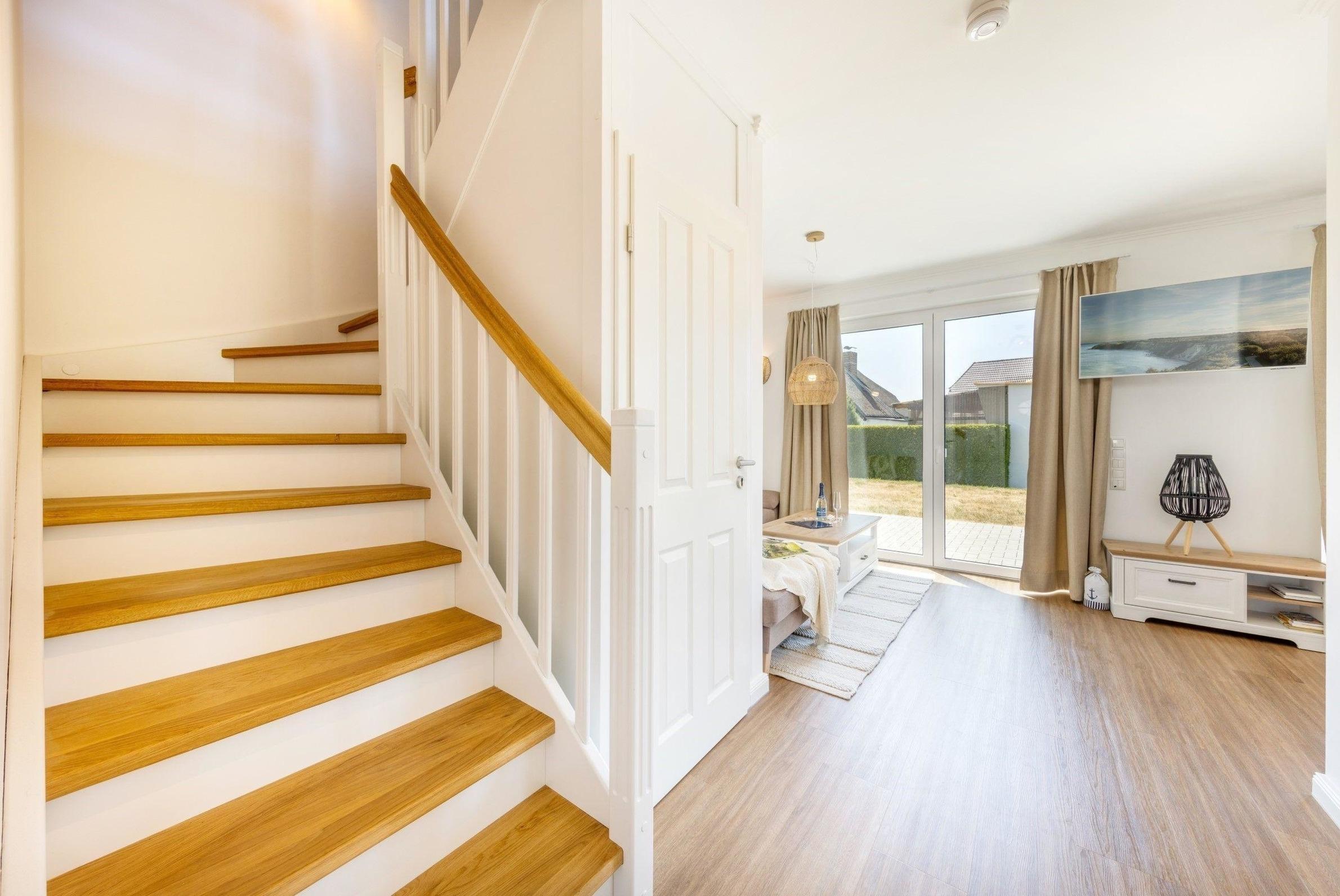 Die Ferienwohnung bietet durchdachte Räume und eine umfassende Ausstattung für einen unbeschwerten Aufenthalt. Mit drei Schlafzimmern, darunter zwei Doppelbetten und zwei Einzelbetten, ist ausreichend Platz für bis zu sechs Personen gegeben. Die offene Küche überzeugt mit modernen Geräten wie Geschirrspüler, Elektro-/Gasherd, Backofen, Mikrowelle und Kühlschrank. Barrierefreiheit und Allergikergeeignetheit sorgen für zusätzlichen Komfort. Ein großzügiges Badezimmer mit Fenster und bodengleicher Dusche sowie ein weiteres Badezimmer mit Badewanne bieten Annehmlichkeiten für die ganze Familie. Das helle Wohnzimmer, ausgestattet mit Sofa, Sessel und Kamin, lädt zum Entspannen ein. WLAN, HiFi-Anlage und TV gewährleisten moderne Unterhaltung. Praktische Extras wie Waschmaschine, Parkplatz und Fahrräder runden das Angebot ab. Gemütliche Brettspiele und ein Sonnenschirm stehen ebenfalls zur Verfügung. Sicherheit wird durch Rauchmelder und Feuerlöscher gewährleistet.