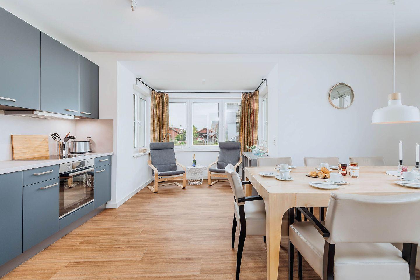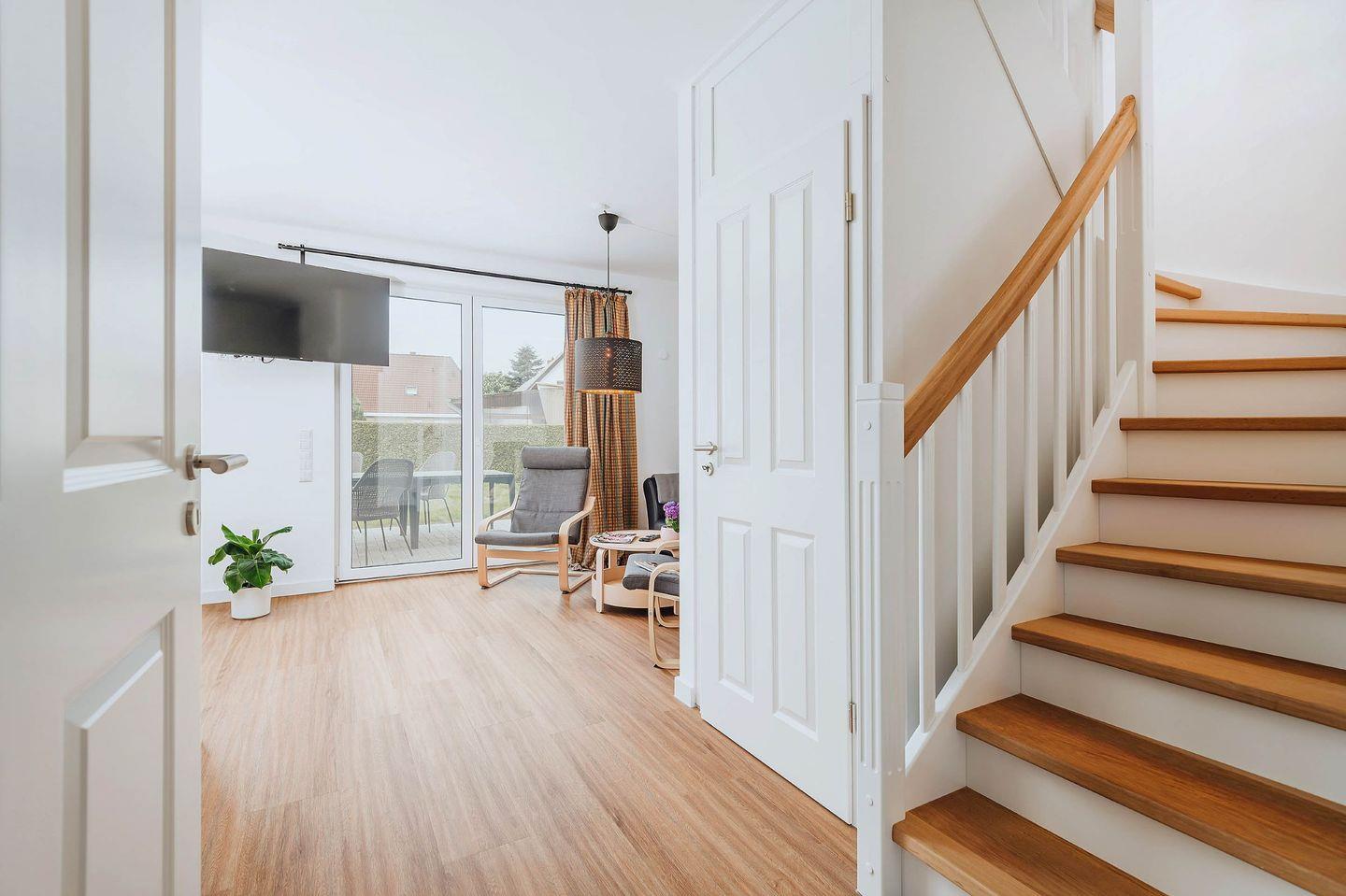 Eine modern eingerichtete und gut ausgestattete Doppelhaushälfte, Baujahr 2023, liegt direkt am Nationalpark Vorpommersche Boddenlandschaft. Das Herz des Hauses ist ein sehr großzügiger Wohnraum mit Essbereich und Leseecke, mit Sat-TV und einer komplett ausgestatteten Einbauküche.