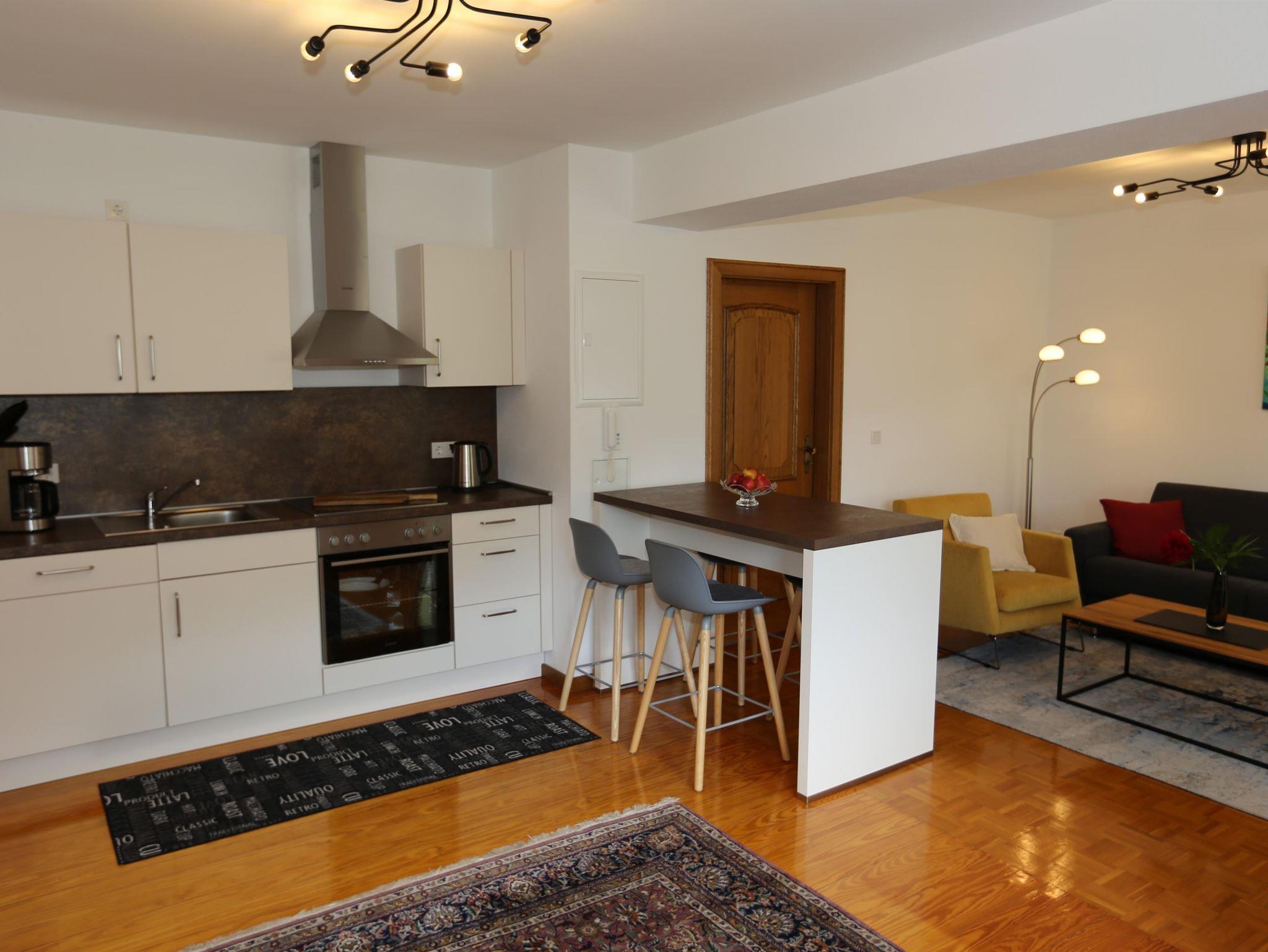 Koch- und Wohnbereich ist durch einen Hochtisch mit 4 Barhockern getrennt, der zum gemeinsamen Kochen mit einem guten Glas