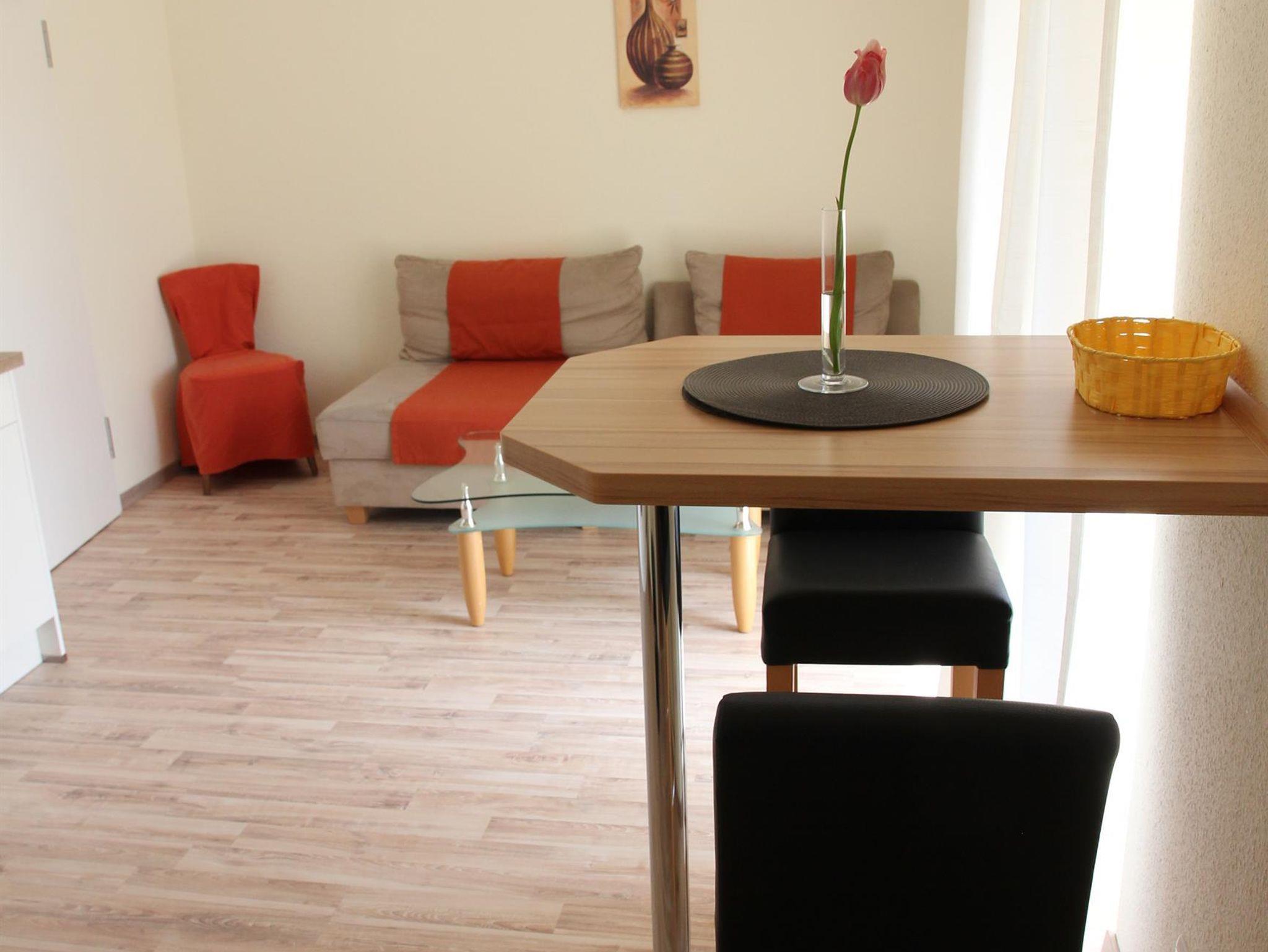 Die Ferienwohnung verfügt über ein seperates Schlafzimmer und einen Balkon mit Gartenblick.
