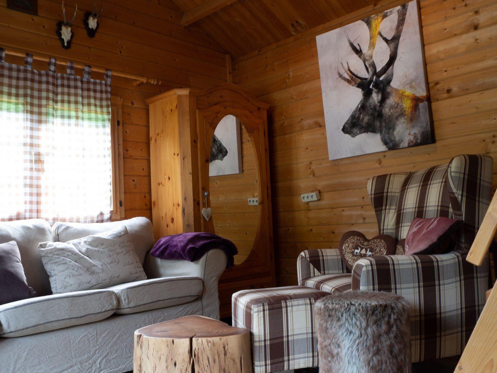 Unsere Jagdhütte ist ca. 25 m² groß und für max. 4 Personen ausgelegt. Zentraler Bereich ist der urgemütliche Wohnraum mit Sitzecke, Flat-TV und Gas-Ofen. Kaffee- und Teezubereitung vorhanden. Minibar (nicht inklusive). Gemütliches Schlafzimmer (Bett 1,80 x 2,00 m), frisch bezogenen Betten. Der Traum aller Kinder ist hier die große gesicherte Schlafgalerie, die wie ein Ausgucksposten über dem Apartment trohnt. Tageslicht-Bad mit Dusche und WC, Handtücher, Toilettenartikel und Fön. Die Veranda vor dem Haus lädt zum Verweilen und Relaxen ein.