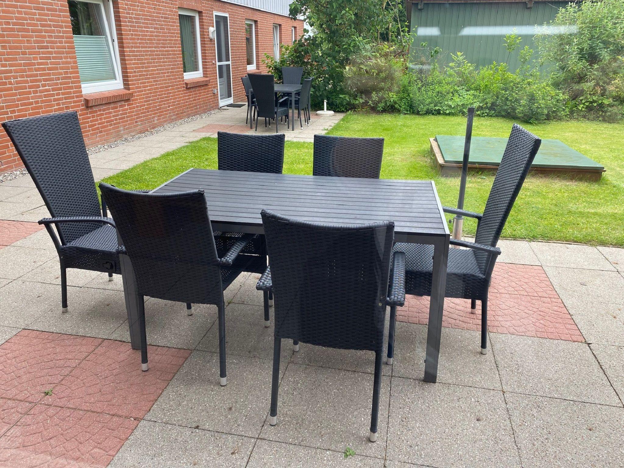 Die zur Ferienwohnung gehörende Terrasse mit Tisch und Stühlen sowie Gartenliege bietet erholsame Stunden in unserer ruhigen Hofumgebung.