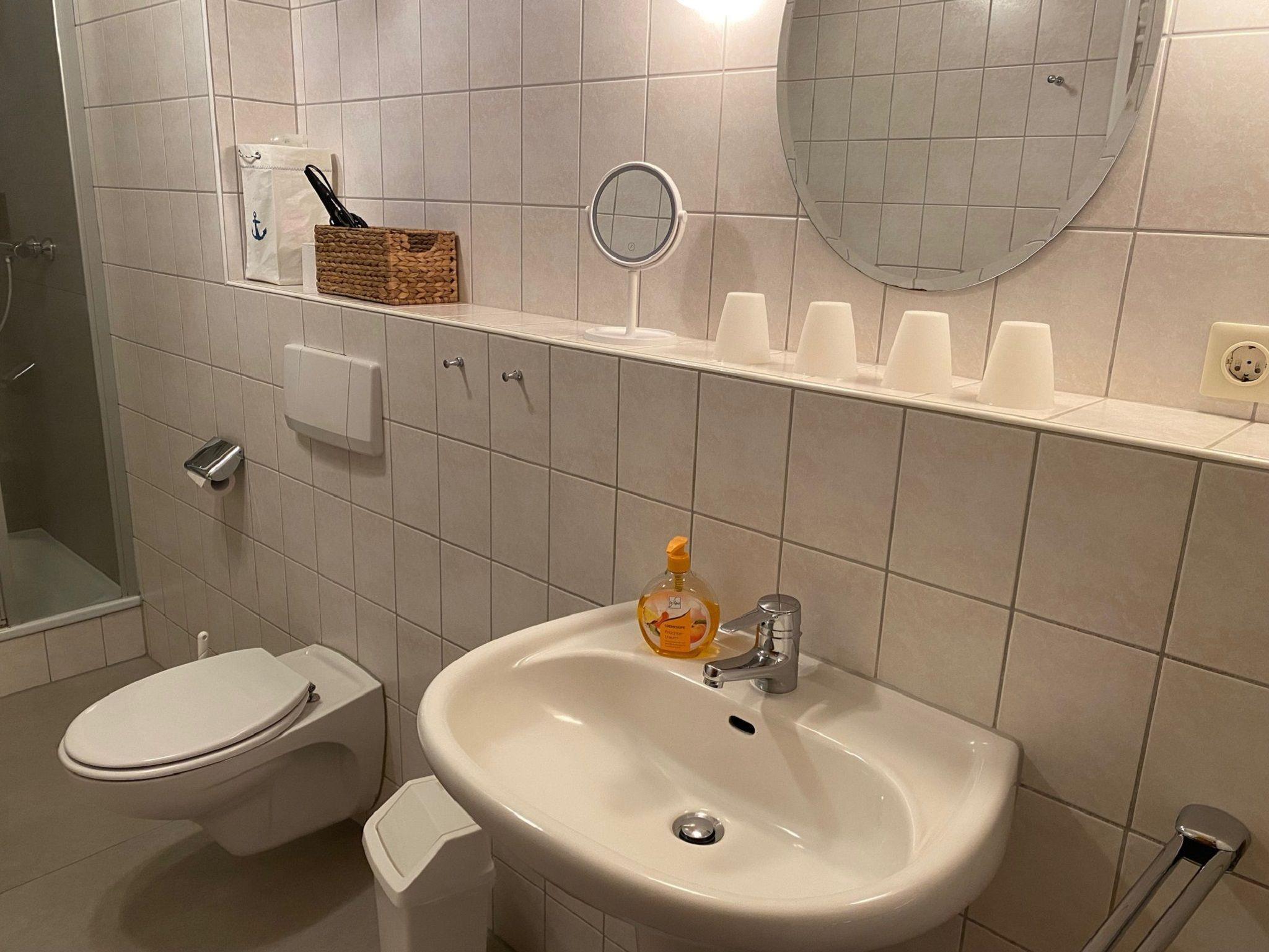 In dem großen und modernen Badezimmer mit WC befindet sich eine geräumige Duschkabine.