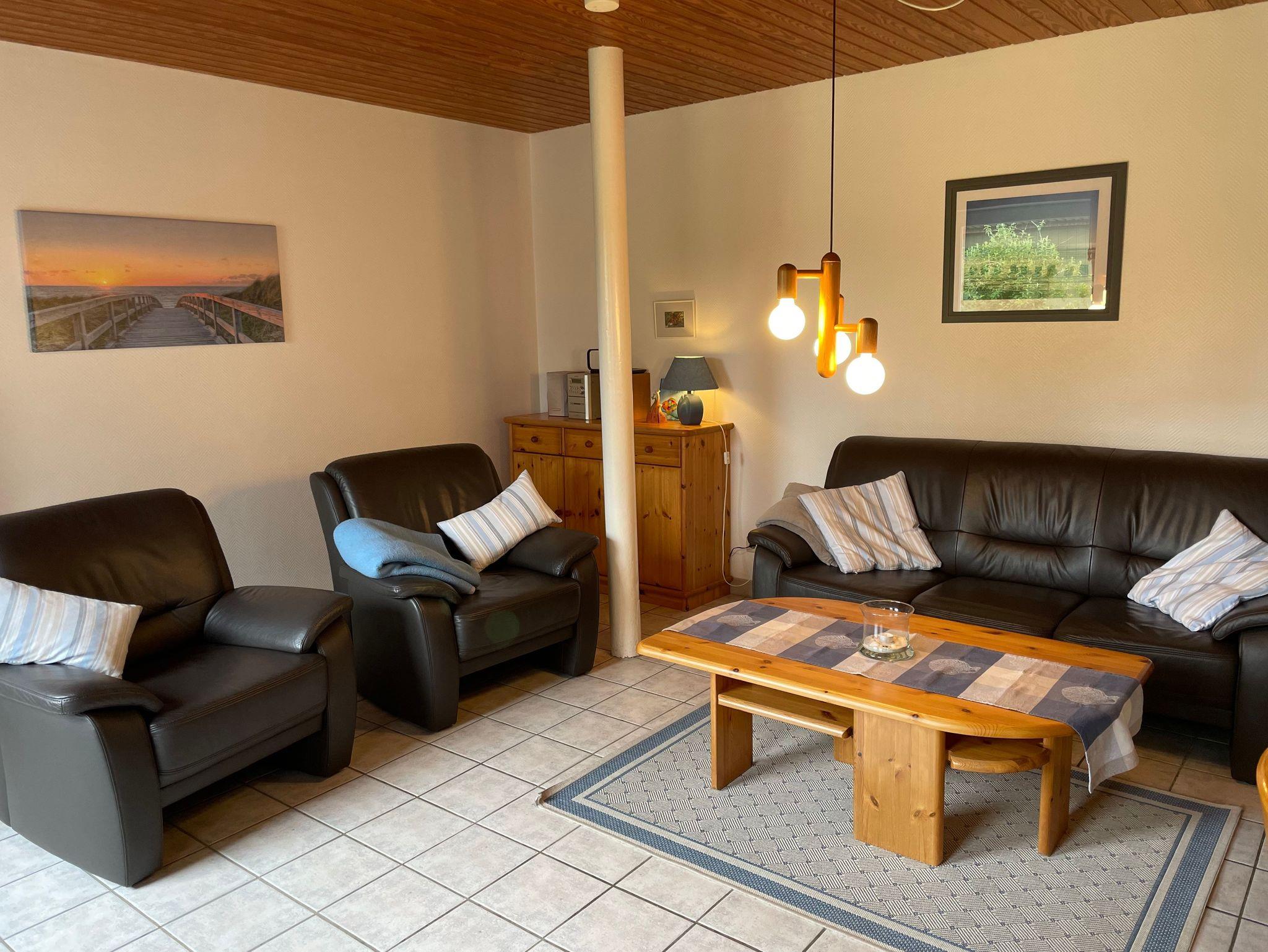 Das große Wohnzimmer ist mit einer gemütlichen Sitzgruppe, Fernseher, DVD-Player und Stereo-Anlage ausgestattet. Die integrierte Küche ist komfortabel und großzügig ausgestattet (E-Herd, Kühlschrank, Spülmaschine, Mikrowelle, Kaffeemaschine). Ein Essbereich mit Tisch und Stühlen ist ebenso integriert.