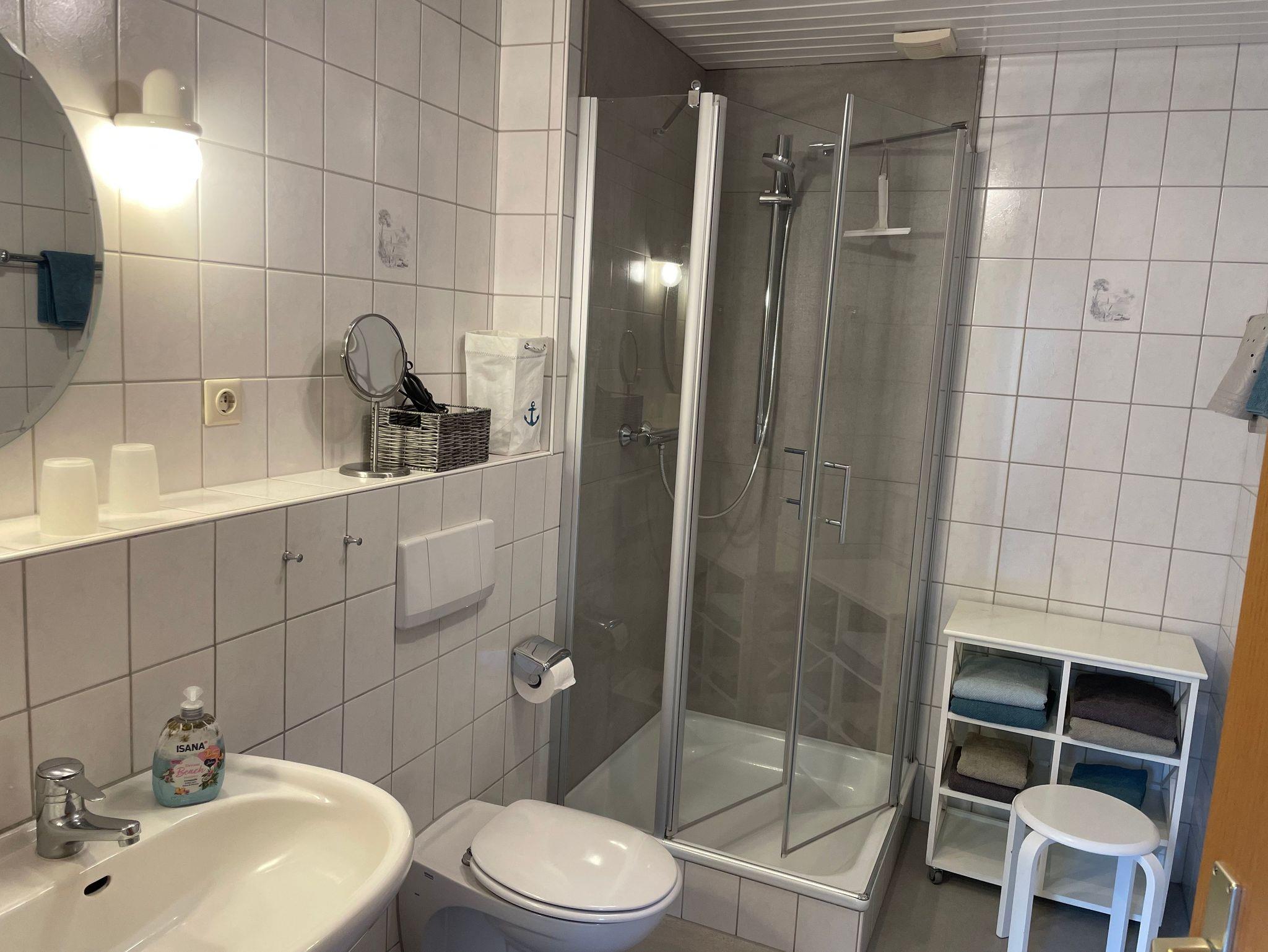 Das moderne Badezimmer mit WC ist mit einer geräumigen Duschkabine ausgestattet.