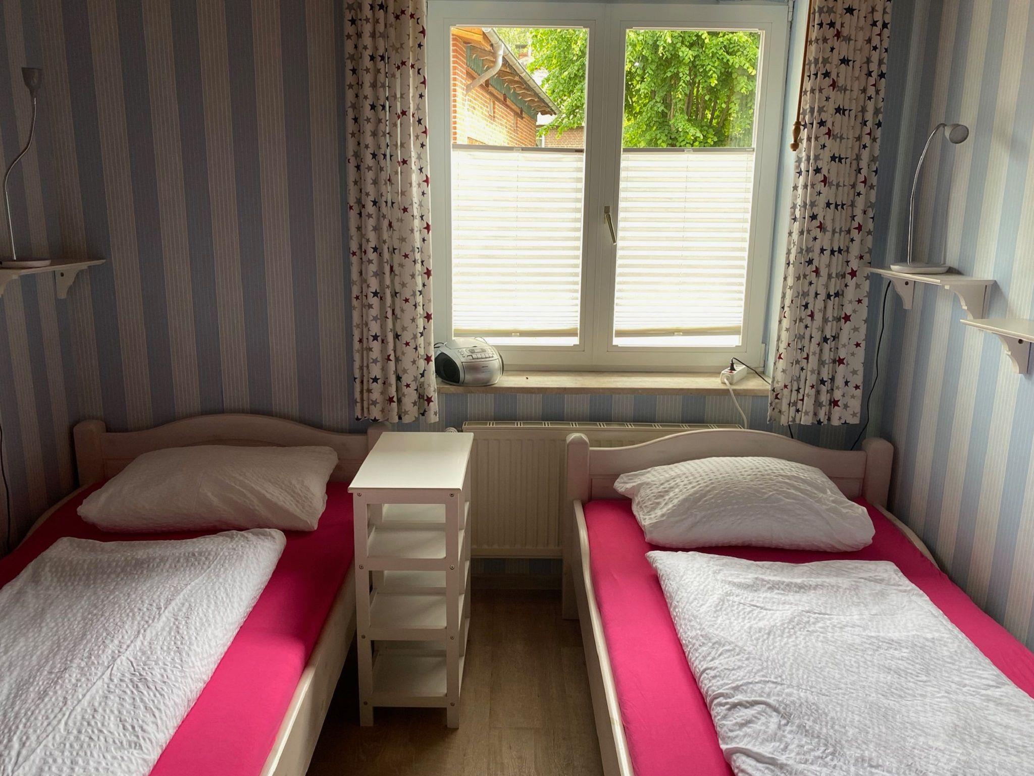 Das Kinderzimmer ist geräumig. Hier stehen zwei große Einzelbetten und ein Einbaukleiderschrank. Das Zimmer bietet ausreichend Platz zum Spielen. Von der Ferienwohnung aus geht es direkt auf die dazu gehörende Terrasse, die mit Tisch und Stühlen sowie Gartenliege erholsame Stunden in unserer ruhigen Hofumgebung bietet.