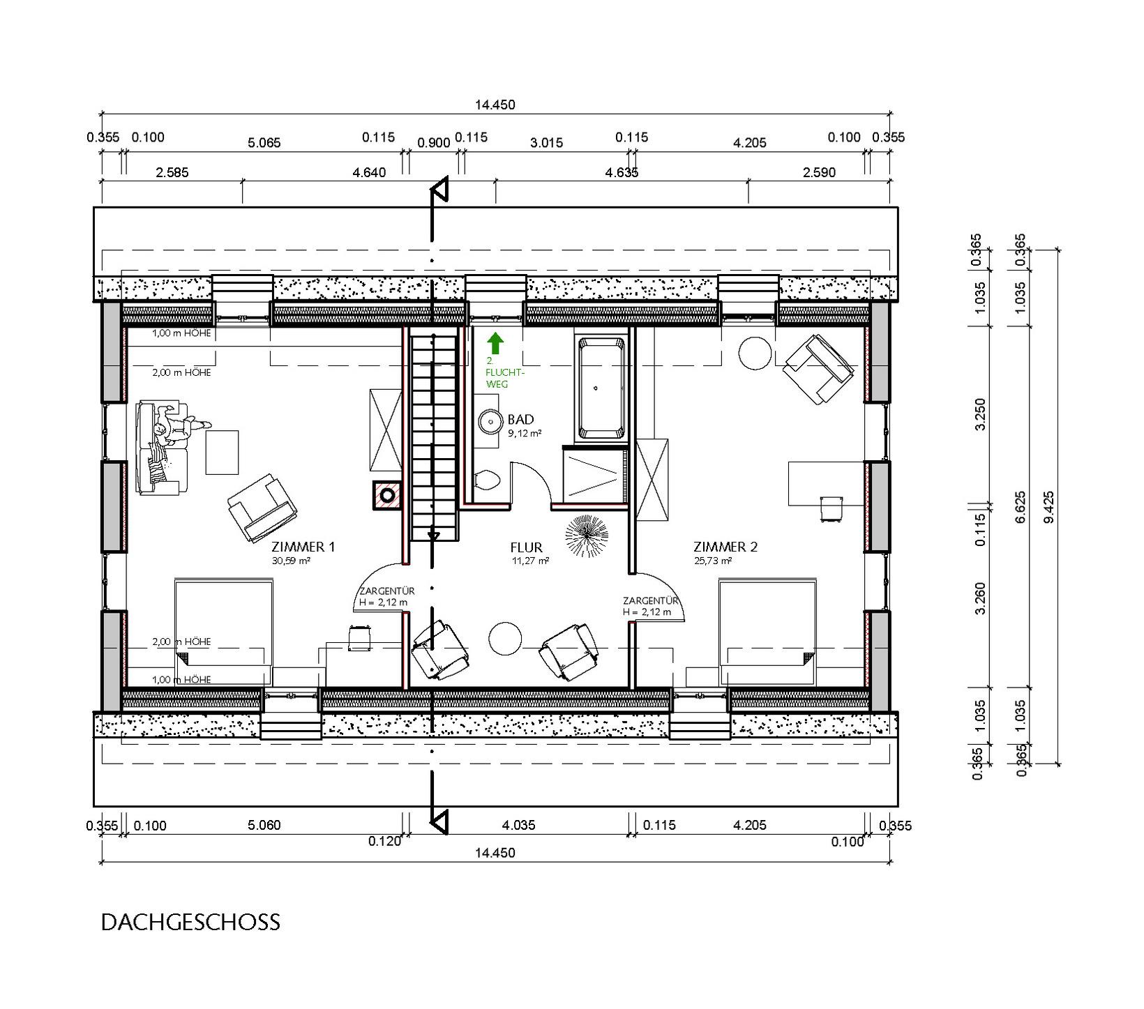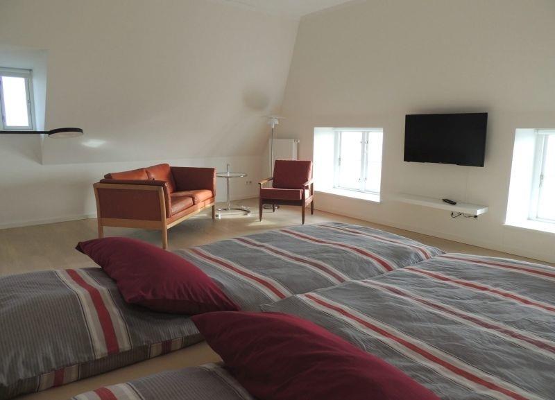 Im OBERGESCHOSS befinden sich zwei weitere Schlafzimmer (jeweils mit Doppelbetten 1,80 m x 2 m), beide mit Sitzecke und zusätzlichem Fernseher ausgestattet, sowie ein geräumiges Bad mit Dusche und Infrarot-Sauna.