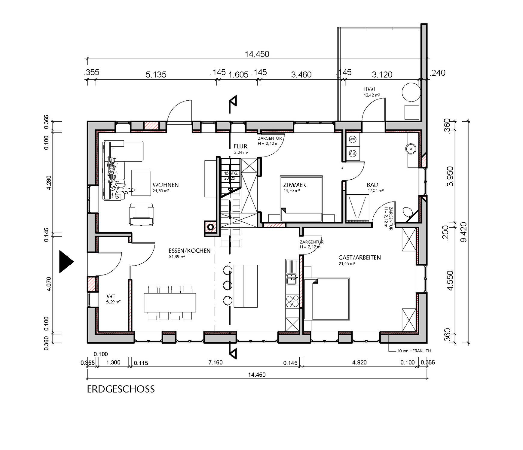 Im ERDGESCHOSS befinden sich eine offene moderne Küche mit Kücheninsel, Ess- und Wohnbereich, zwei Schlafzimmer, ein großzügiges Bad mit begehbarer Dusche. Beide Schlafzimmer haben direkten Badzugang. In einem steht ein Doppelbett (2 m x 2 m) mit elektrisch verstellbaren Lattenrosten, im anderen ein französisches Bett (1,40 m x 2 m).