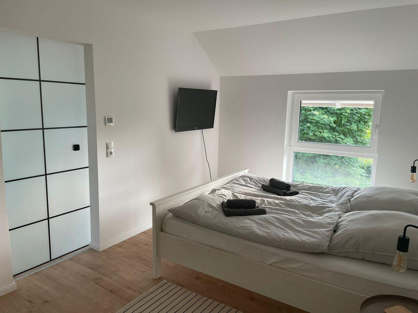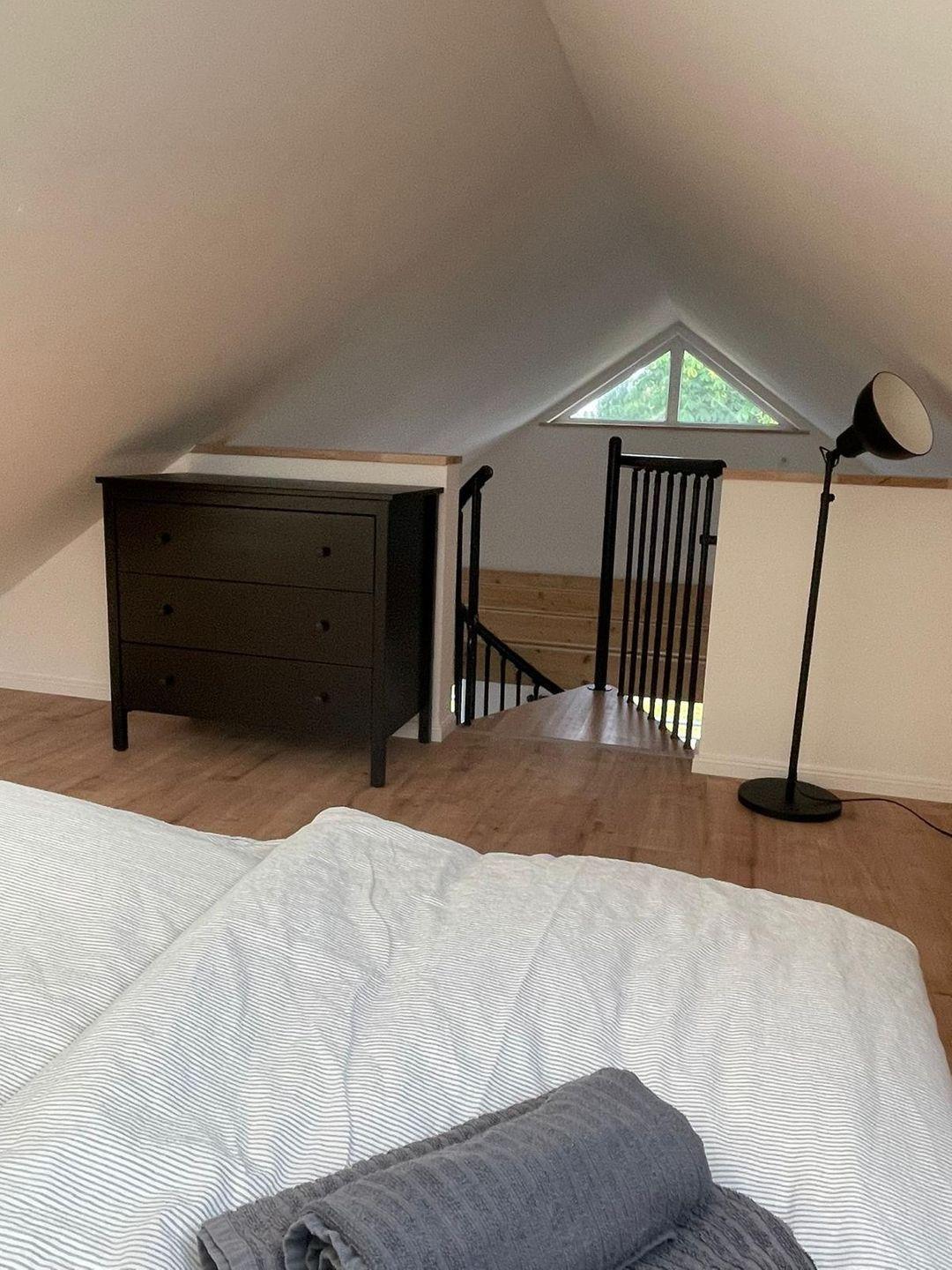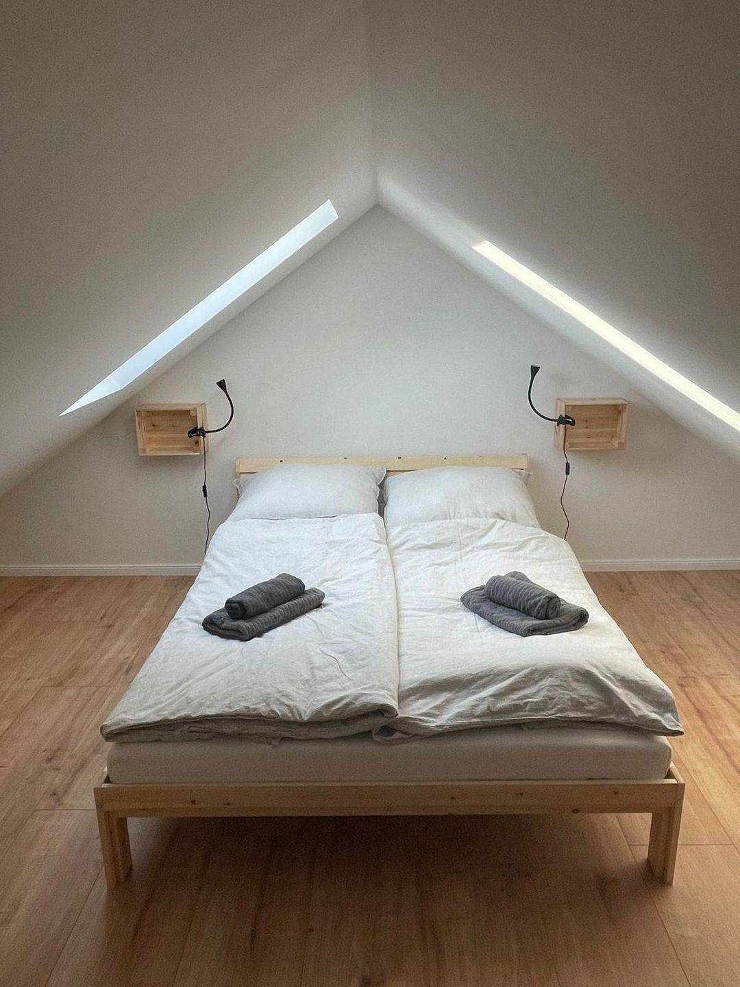 Das moderne und offene Wohnkonzept bietet Platz für 4 Personen und lädt zum entspannen ein. Der große Wohn- und Essbereich kann für einen gemütlichen Spieleabend, ein leckeres Abendessen oder einfach zum verweilen genutzt werden. Das Schlafzimmer bietet neben einem großen Bett (160x200) einen Fernseher und genügend Strauraum für die Kleidung. Über eine Wendeltreppe gelangen Sie in den offenen Dachstuhl und die dort verbaute Schlaf-Hems (140x200), welche sich hervorragend als Rückzugsort für die Kleinen eignet. In der Hems findet sich ein Doppelbett und genügend Platz zum Spielen. Selbstverständlich kann der Raum auch als Schlafplatz für Erwachsene genutzt werden. Wäschepakete (Bettbezüge + Handtücher) sind optional gegen Gebühr dazu buchbar.
