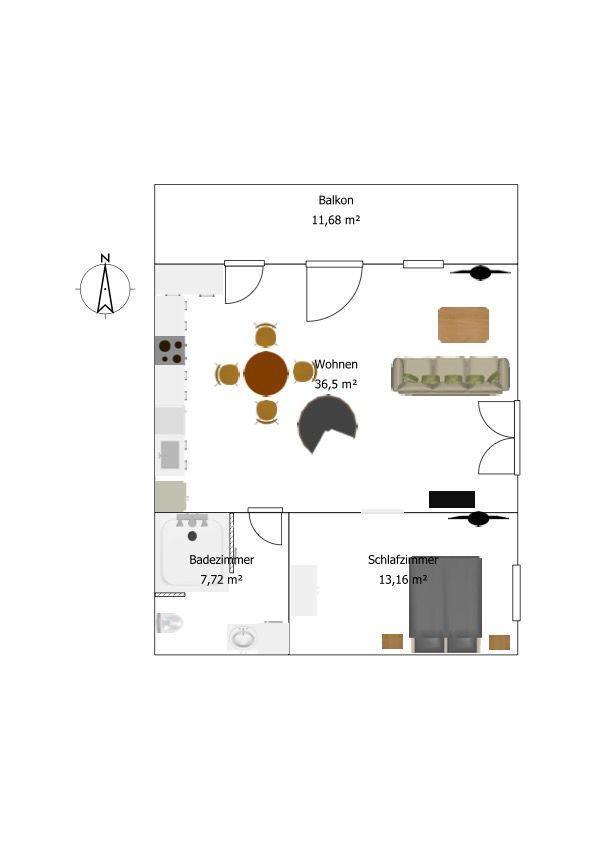 Die Küche bietet eine Geschirrspülmaschine, Umluftherd, Cerankochfeld und eine große Arbeitsfläche. Aus der Küche heraus kann man direkt auf den Balkon gehen. Der Balkon bietet Platz zum Essen und zum Sonnen.