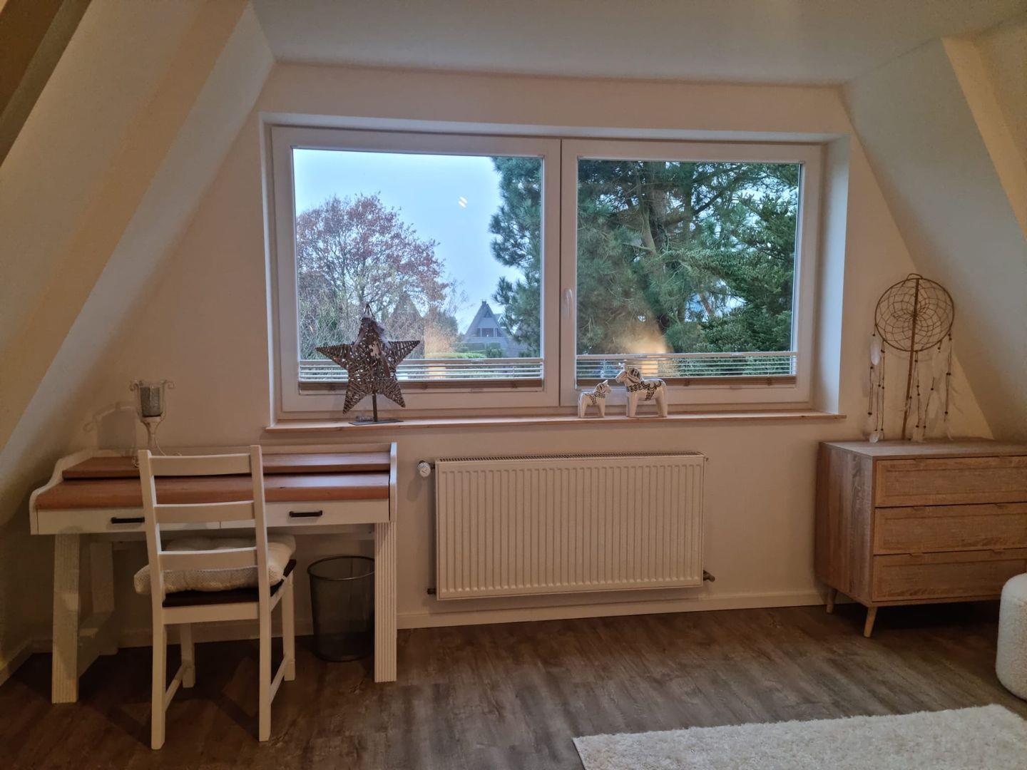 Das Nurdachhaus VIKING befindet sich im ruhigen Ortsteil Burg, nur 2 min. fußläufig vom langen Badestrand „Klein Westerland“ entfernt. Aus einem Schlafraum im Obergeschoss können Sie