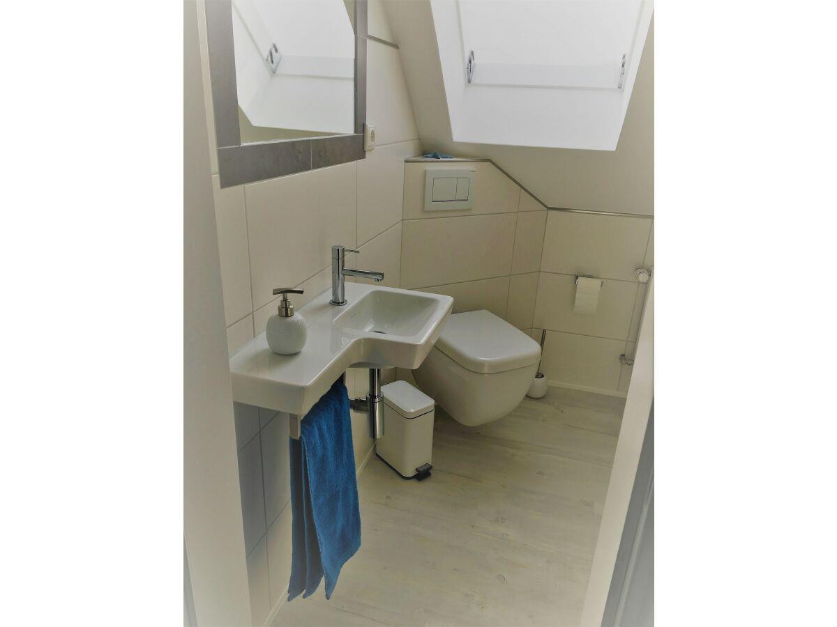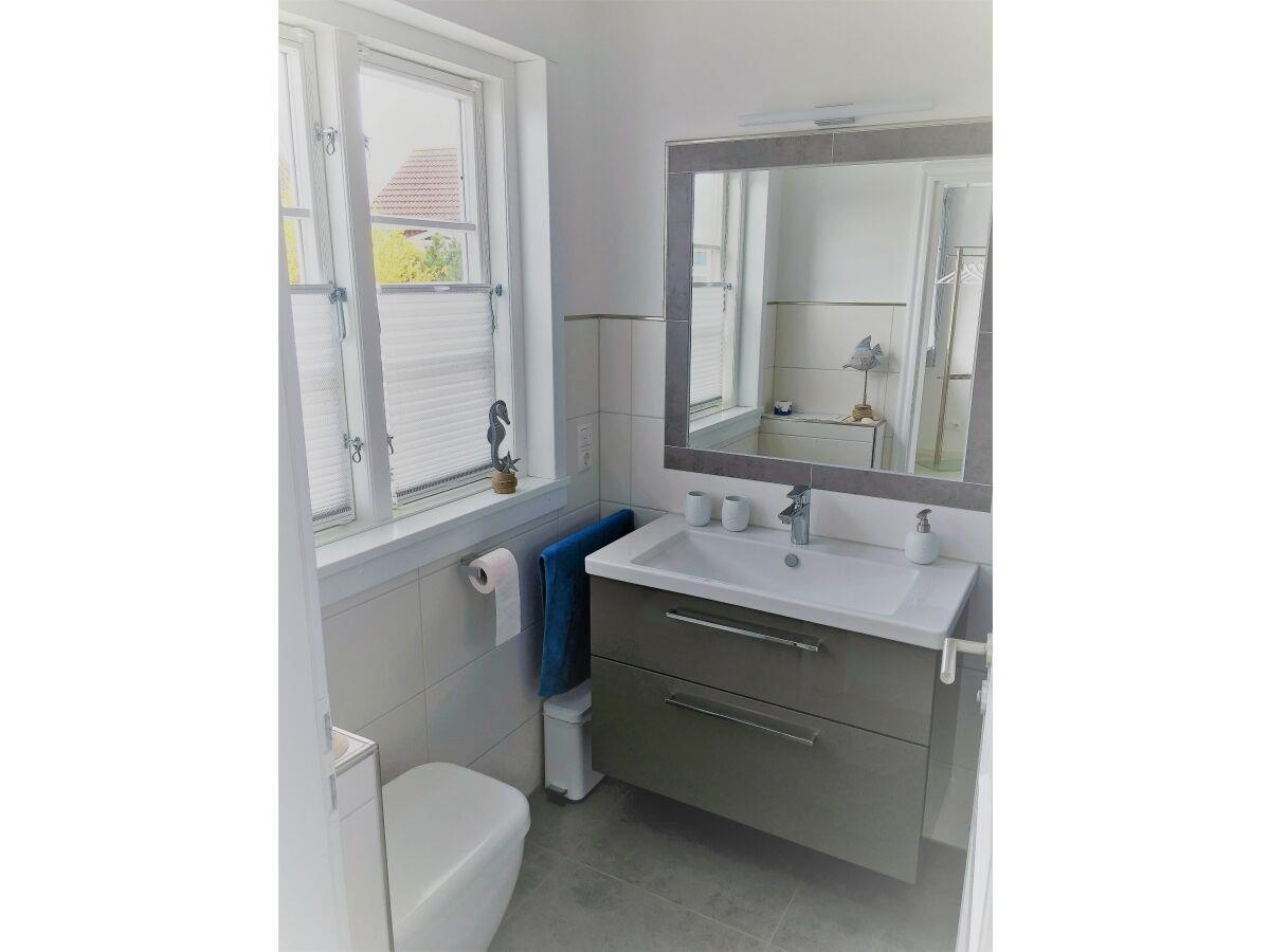 Im großzügigen Eingangsbereich liegt das geschmackvolle Badezimmer mit bodentiefer Dusche. Unter dem "Rainshower" erholen Sie sich von langen Spaziergängen am nahen Ostseestrand.
