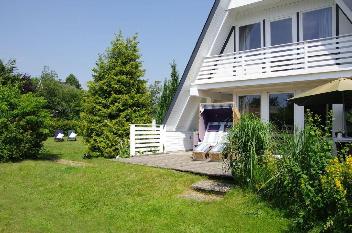Am Haus befindet sich eine Terrasse ausgestattet mit hochwertigen Sitzmöbeln und Tisch für vier Personen. Es gibt einen Ampelschirm, Gartengrill und zwei Liegen sind vorhanden.