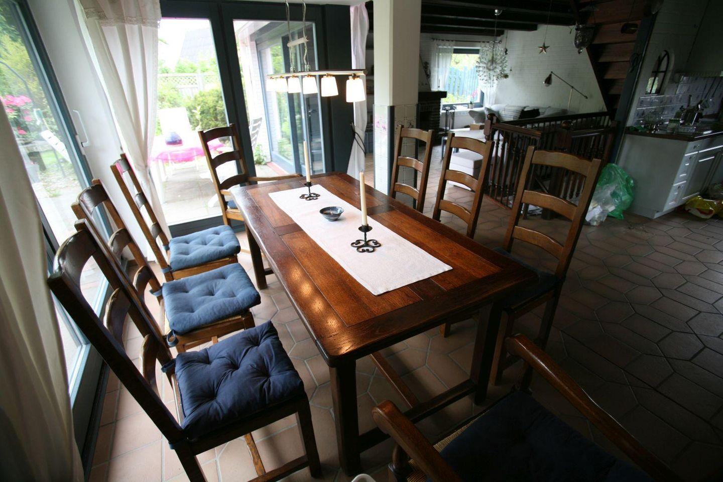 Der komfortable Essbereich ist mit einem großen Tisch aus Massivholz, an dem bis zu 10 Personen Platz finden, ausgestattet. Im angrenzenden Wohnbereich laden gemütliche Sofas (Zweisitzer und Dreisitzer) und ein moderner Skantherm-Kaminofen zum Verweilen ein. Ein großer Flachbild-TV, DVD, CD-Musikanlage und eine umfangreiche Hörbuch- und Büchersammlung unterhalten die Gäste, wenn das Wetter einmal nicht so mitspielt. Nicht nur an solchen Tagen steht im Erdgeschoss ein schöner Saunabereich mit großer Dusche zur Verfügung.