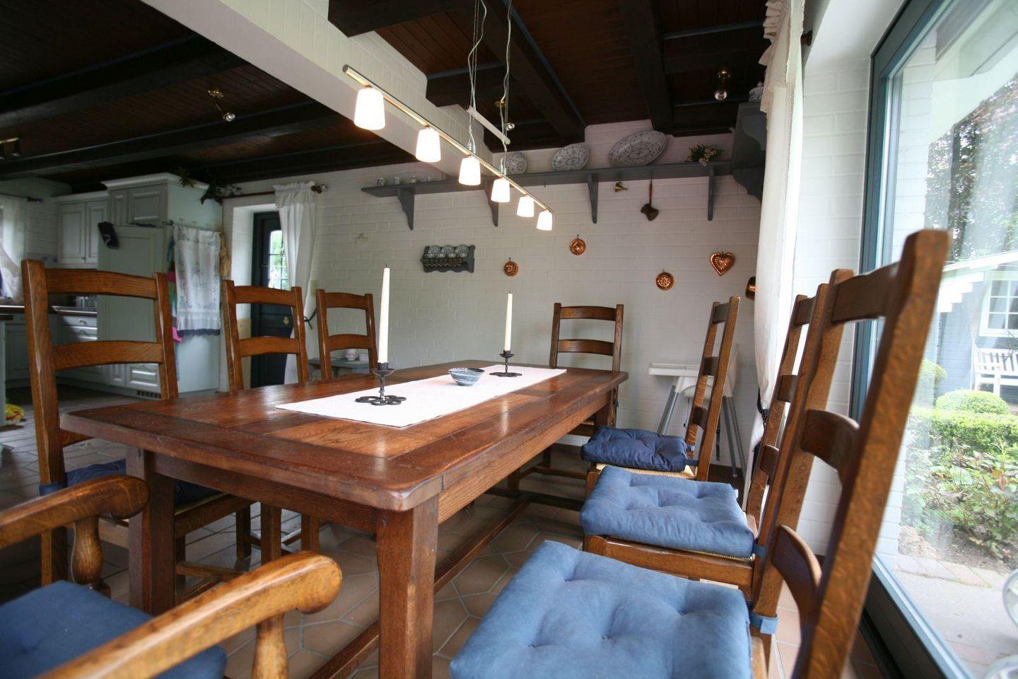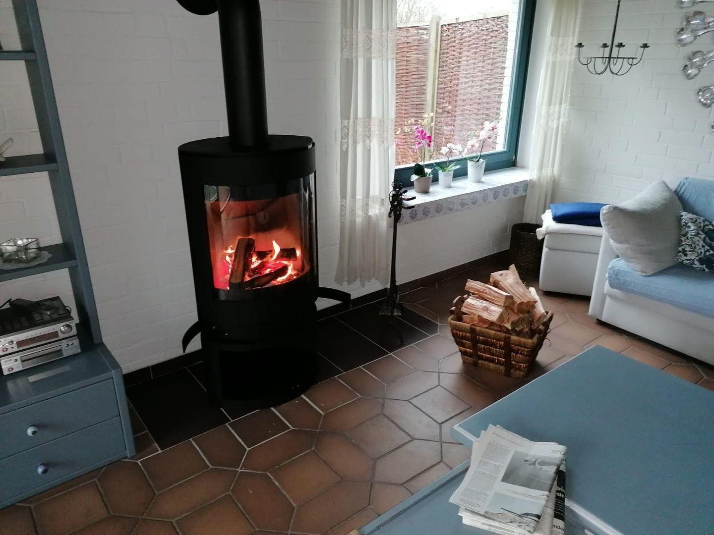 Im ersten Stock gelangt man in den lichtdurchfluteten Wohnbereich. Eine sehr gut ausgestattete Küchenzeile geht hier in den Ess- und Wohnbereich über. In der modernen Einbauküche stehen ein großer Geschirrspüler und Kühlschrank, Ceranfeld-Herd mit Ofen, Mikrowelle, Toaster, Kaffeemaschine, Wasserkocher und Eierkocher bereit. Diese Ebene ist zum Garten hin vollständig panoramaverglast, über eine so genannte Klönschnack-Tür an der Küche bzw. über eine Schiebetür kommt man vom Wohnzimmer direkt auf die Terrassen und in den Garten.