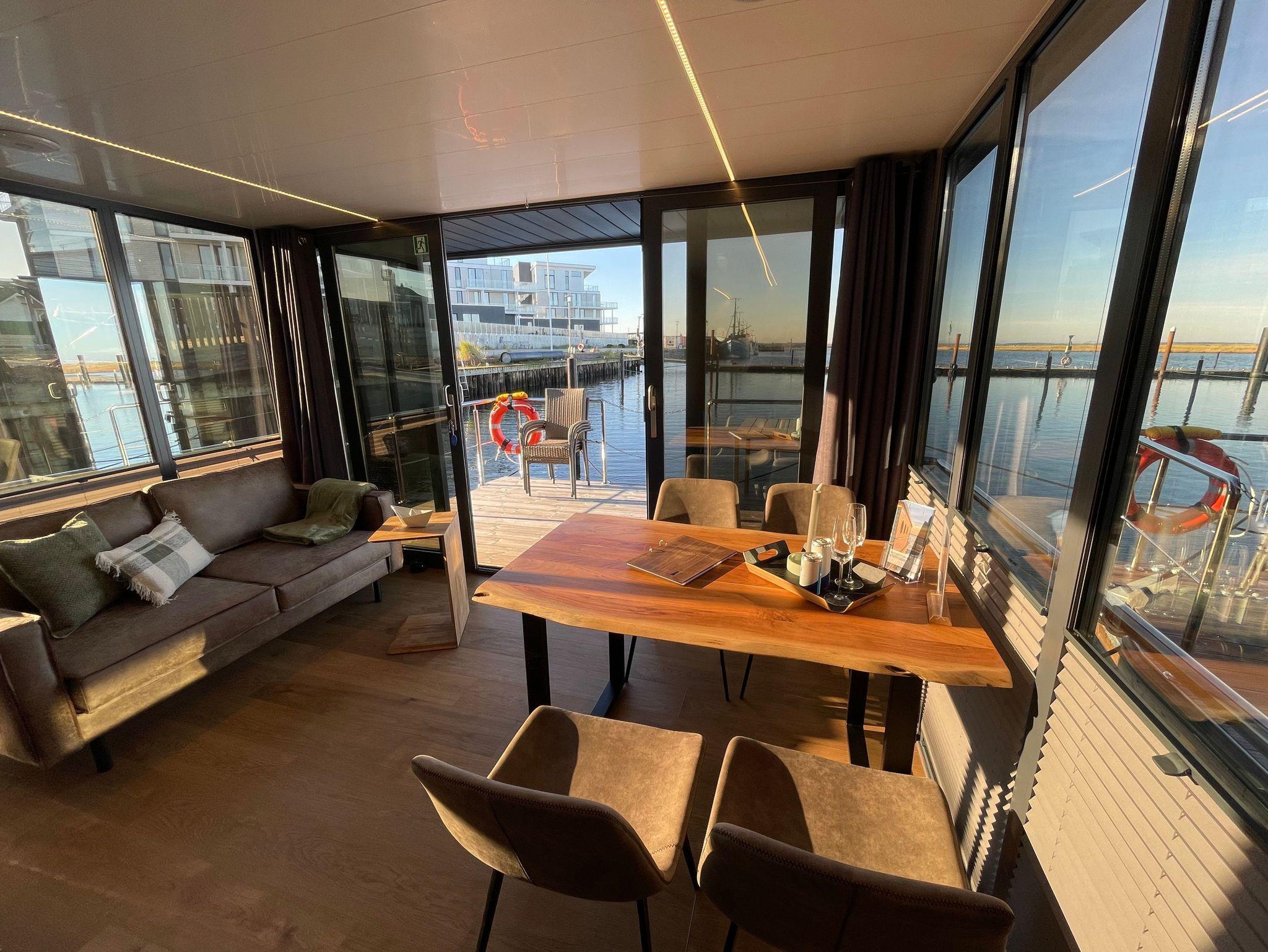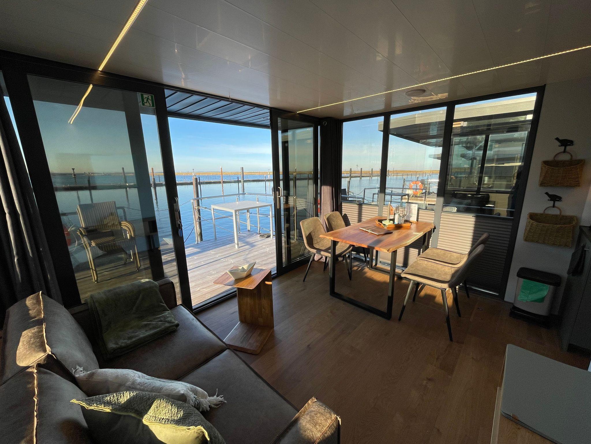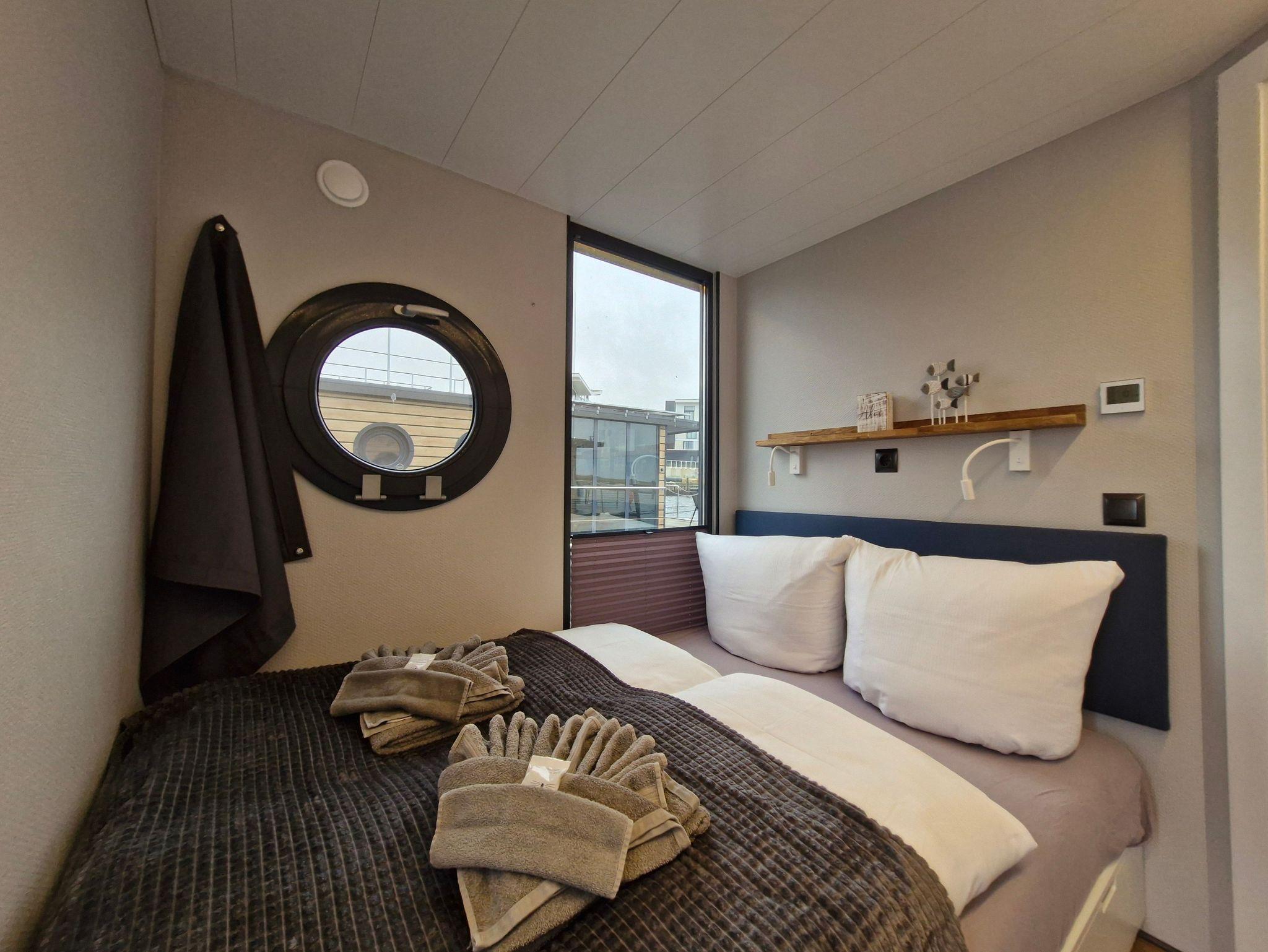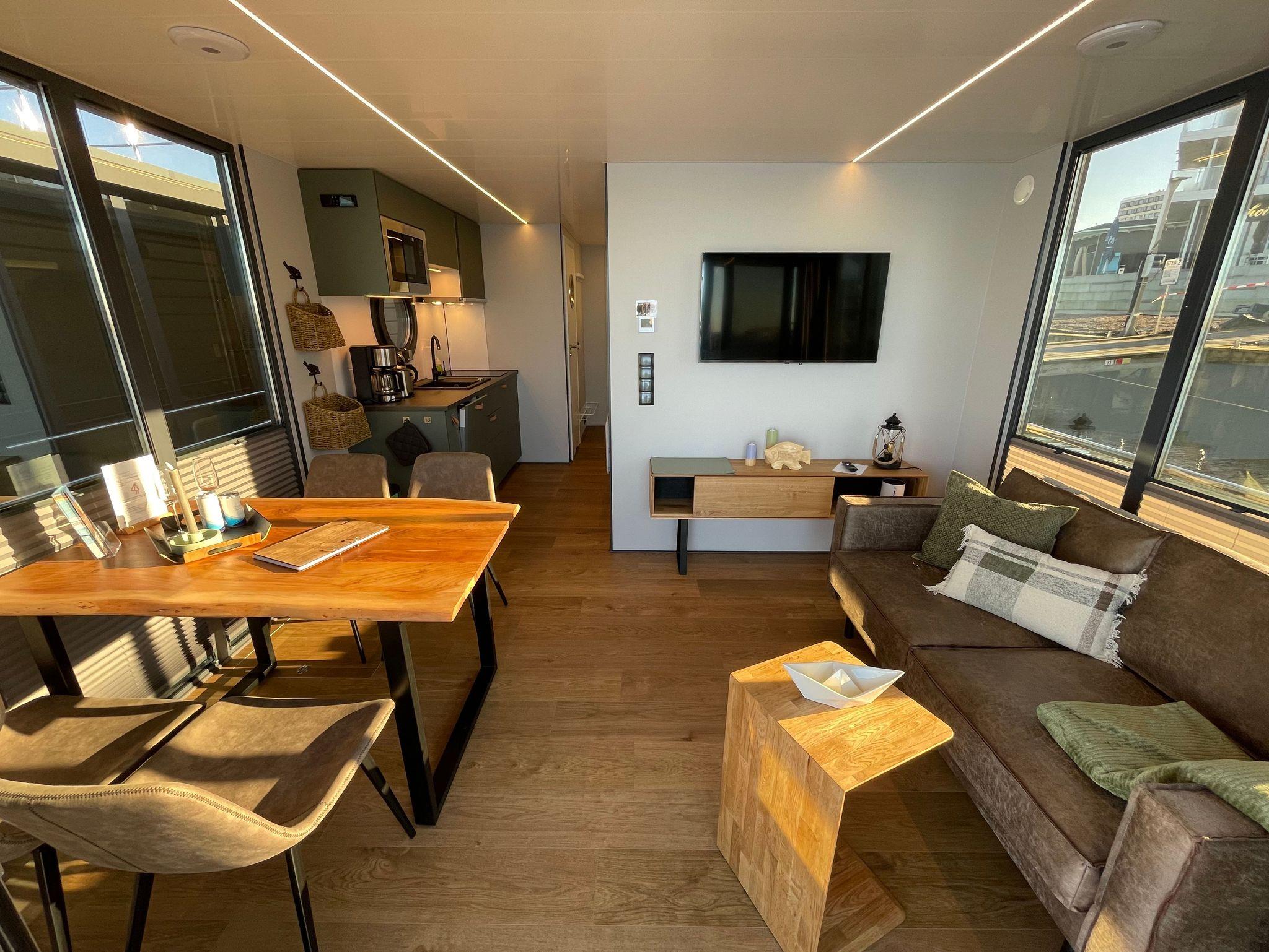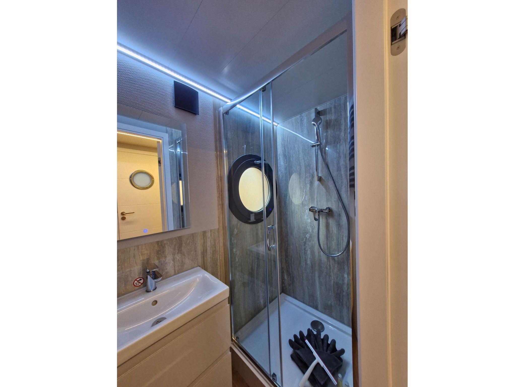 Im Inneren des Hausbootes finden Sie neben dem Wohnraum mit Fußbodenheizung für kalte Tage zwei Schlafräume mit je einem Doppelbett sowie ein modernes Duschbad. Genügend Stauraum finden Sie in den Schränken sowie in den Schubladen unter den Betten.