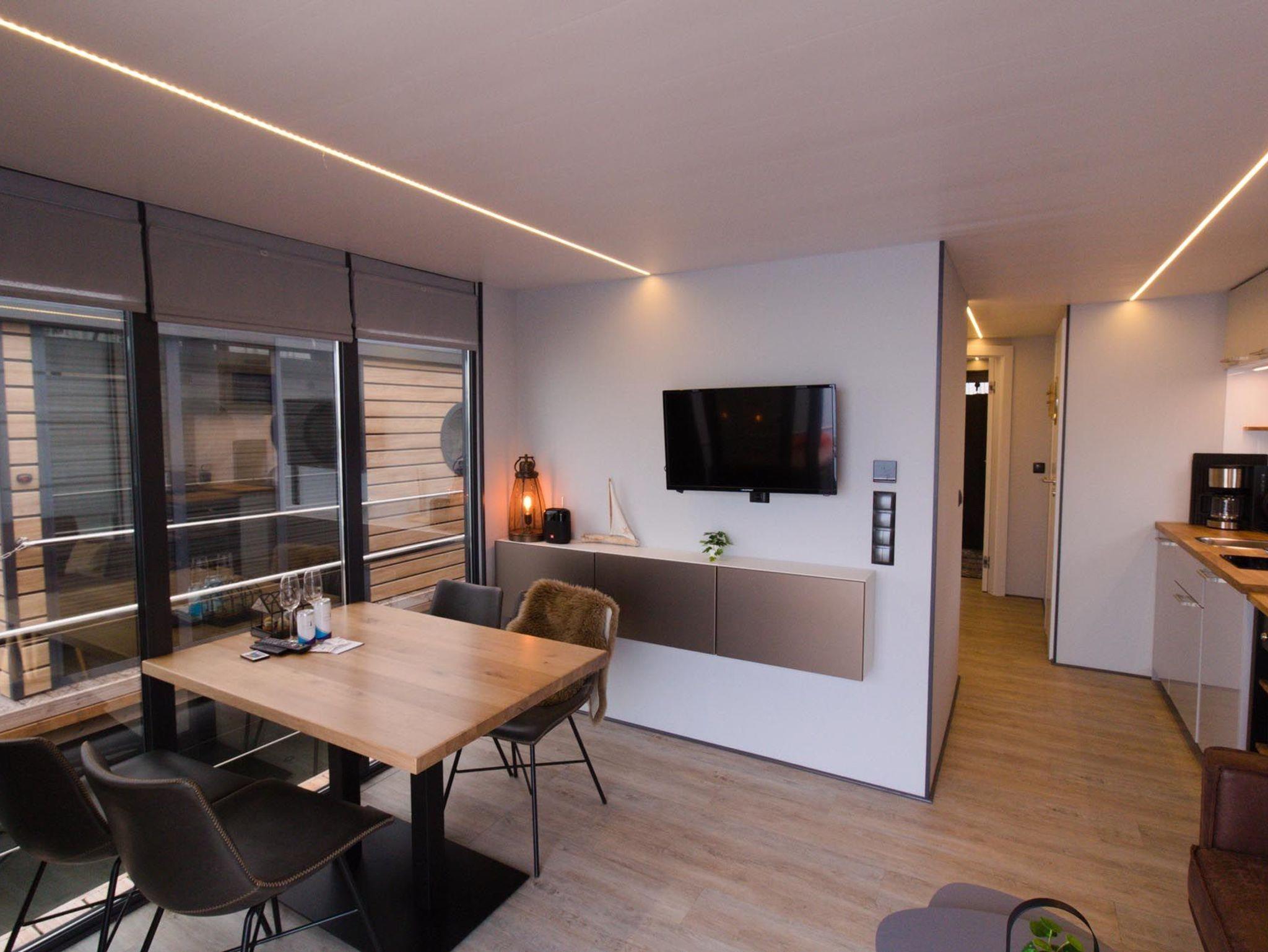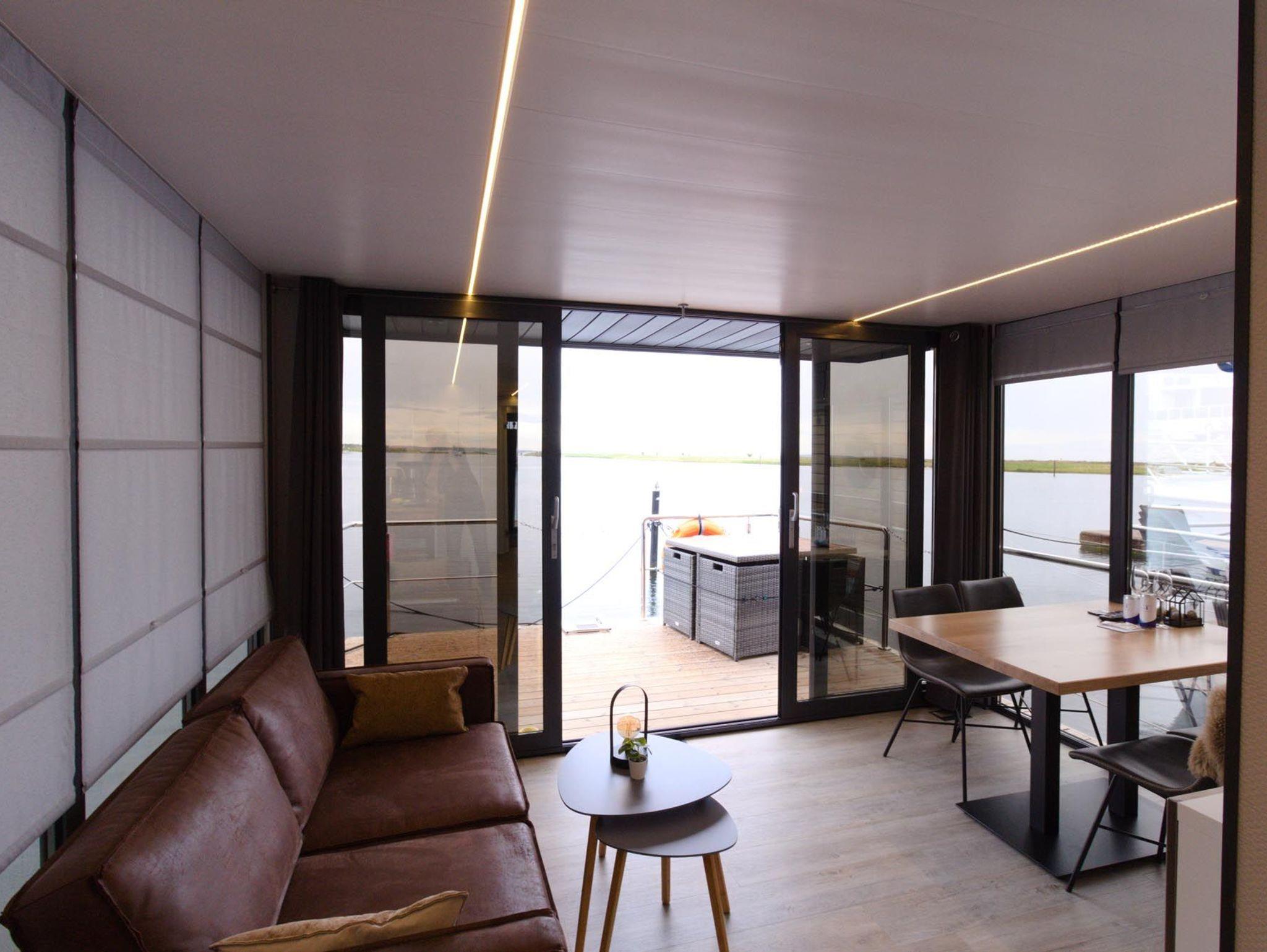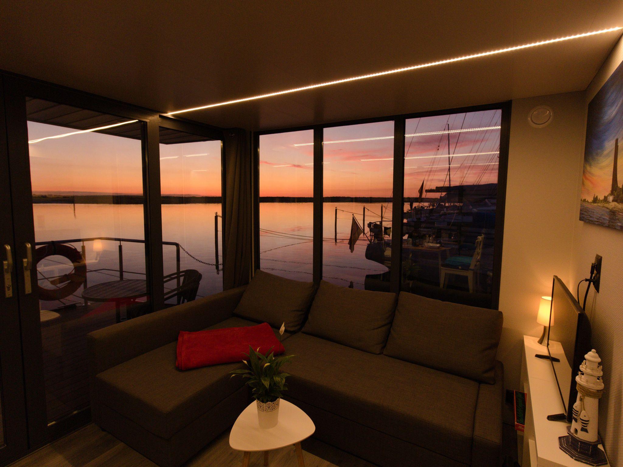 Im Inneren des Hausbootes finden Sie neben dem Wohnraum mit Fußbodenheizung für kalte Tage zwei Schlafräume mit je einem Doppelbett sowie ein modernes Duschbad. Genügend Stauraum finden Sie in den Schränken sowie in den Schubladen unter den Betten.