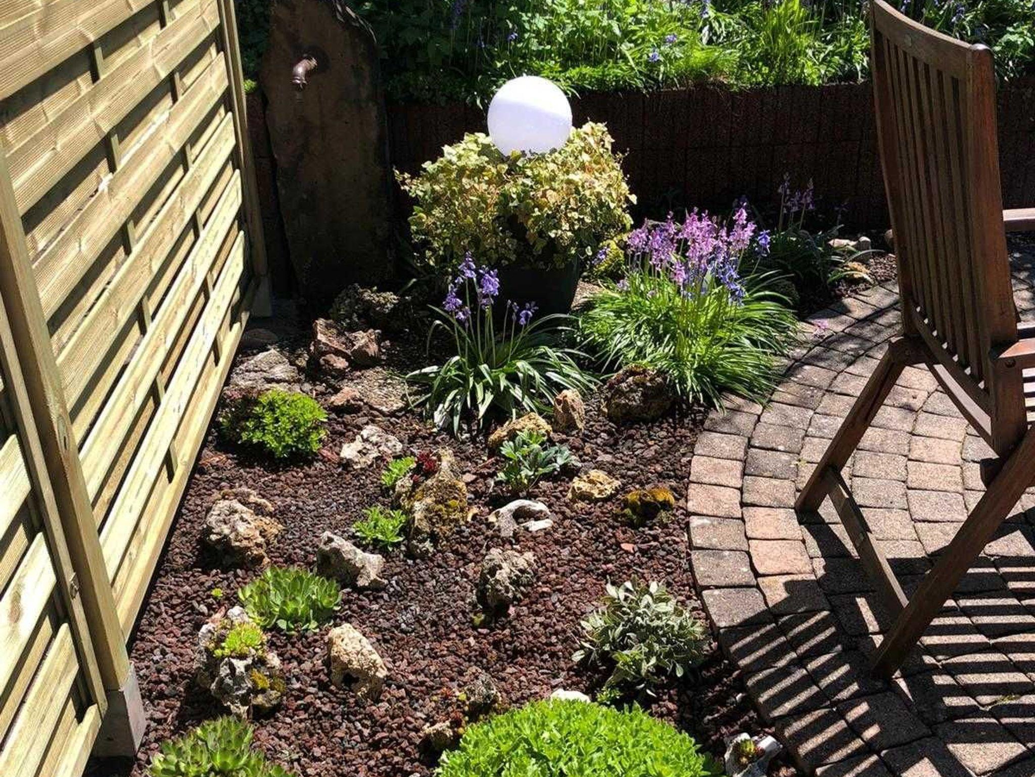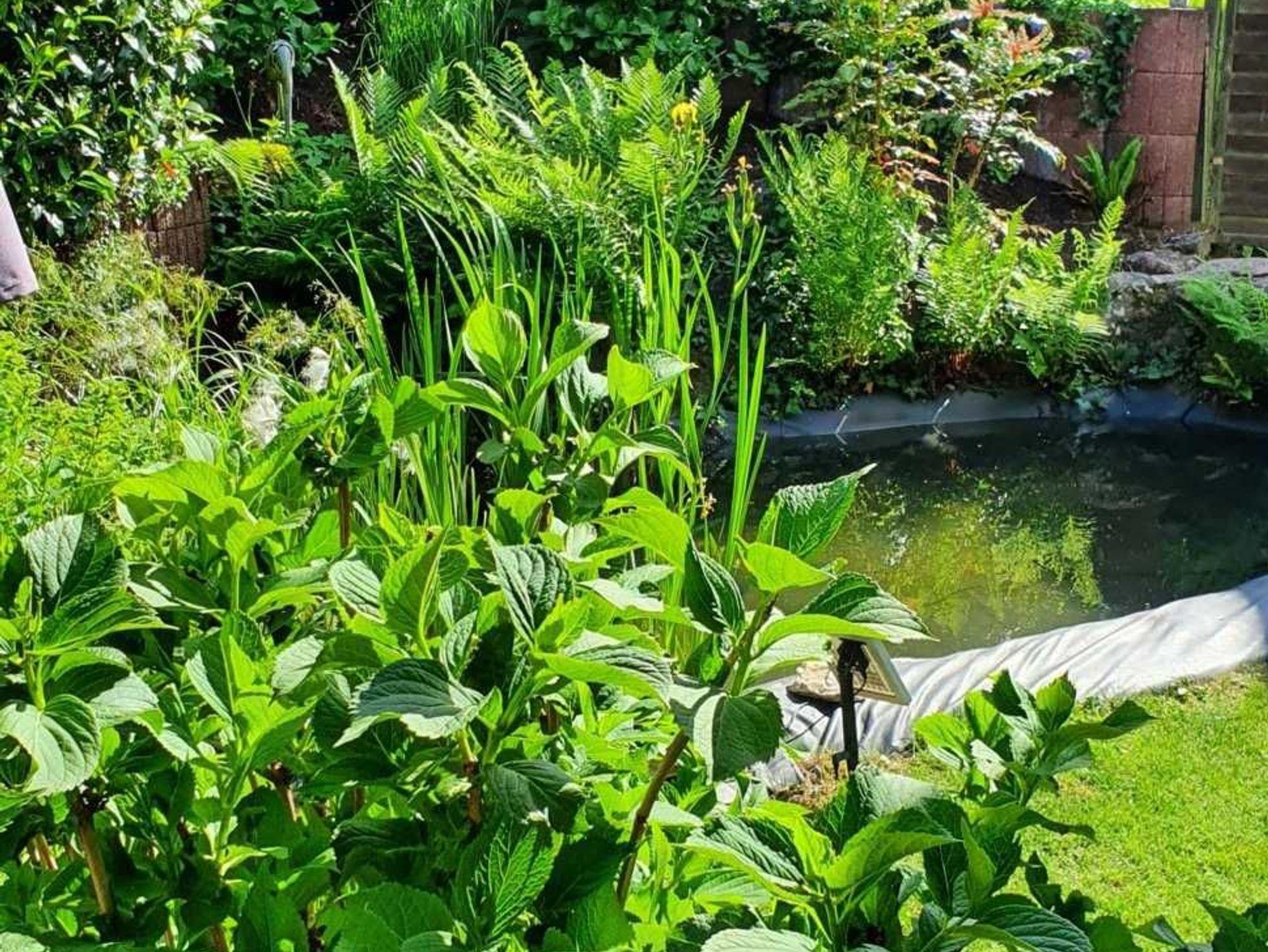 Großes Anwesen mit Terrasse. Im Garten gibt es eine Liegewiese mit Sonnenliegen, einen Teich mit Pflanzen und einen Gasgrill mit Grillmöglichkeit.
