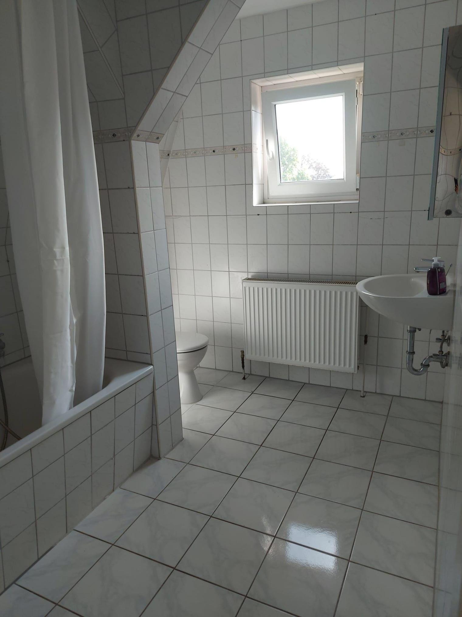 Das Badezimmer ist mit einer Badewanne, einem Badschrank, Waschmaschine sowie einem Wäscheständer ausgestattet.
