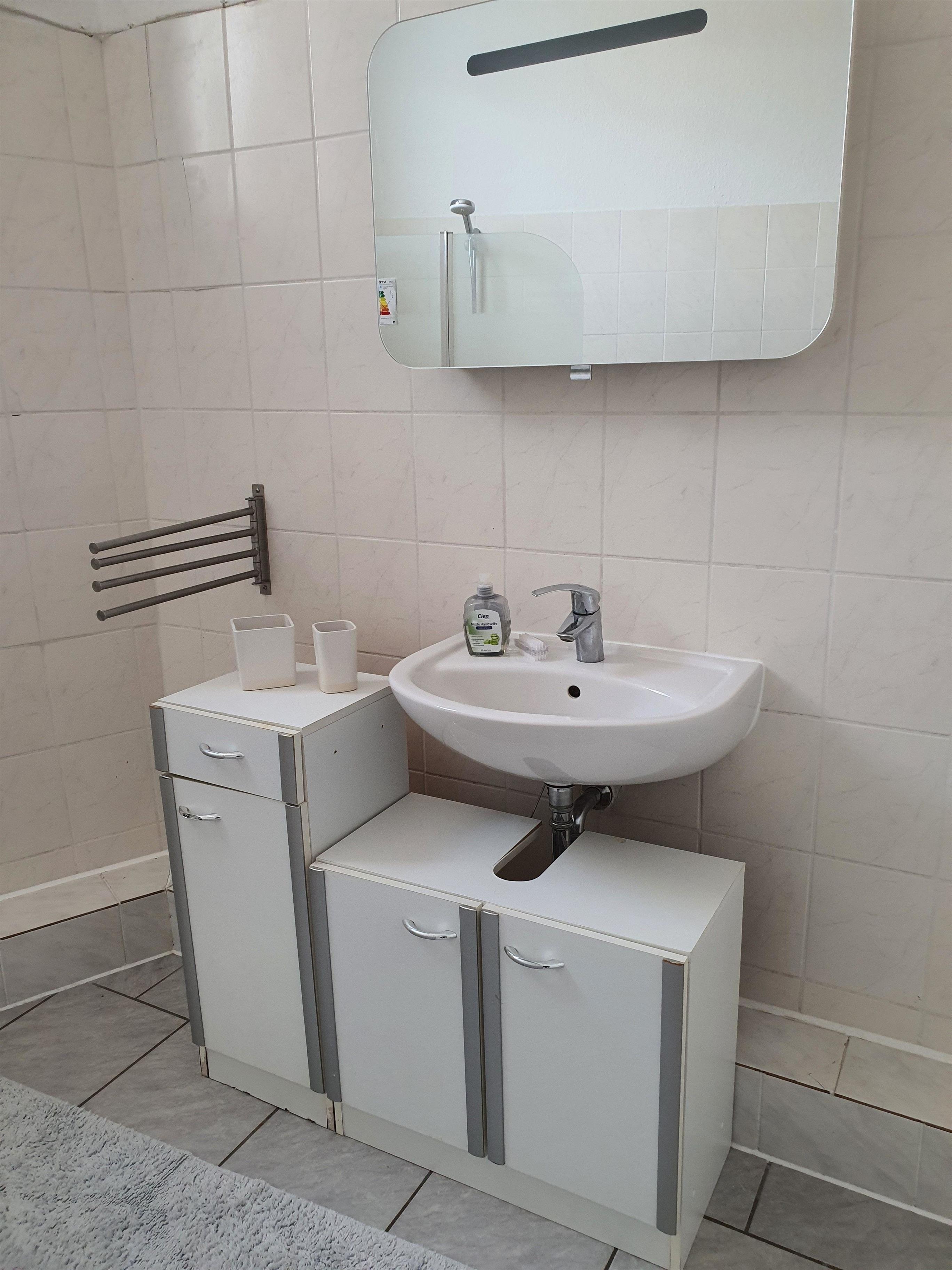 Das geräumige Badezimmer ist mit einer Badewanne, WC, einem Badschrank ausgestattet.