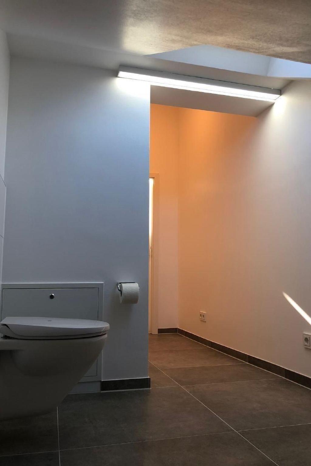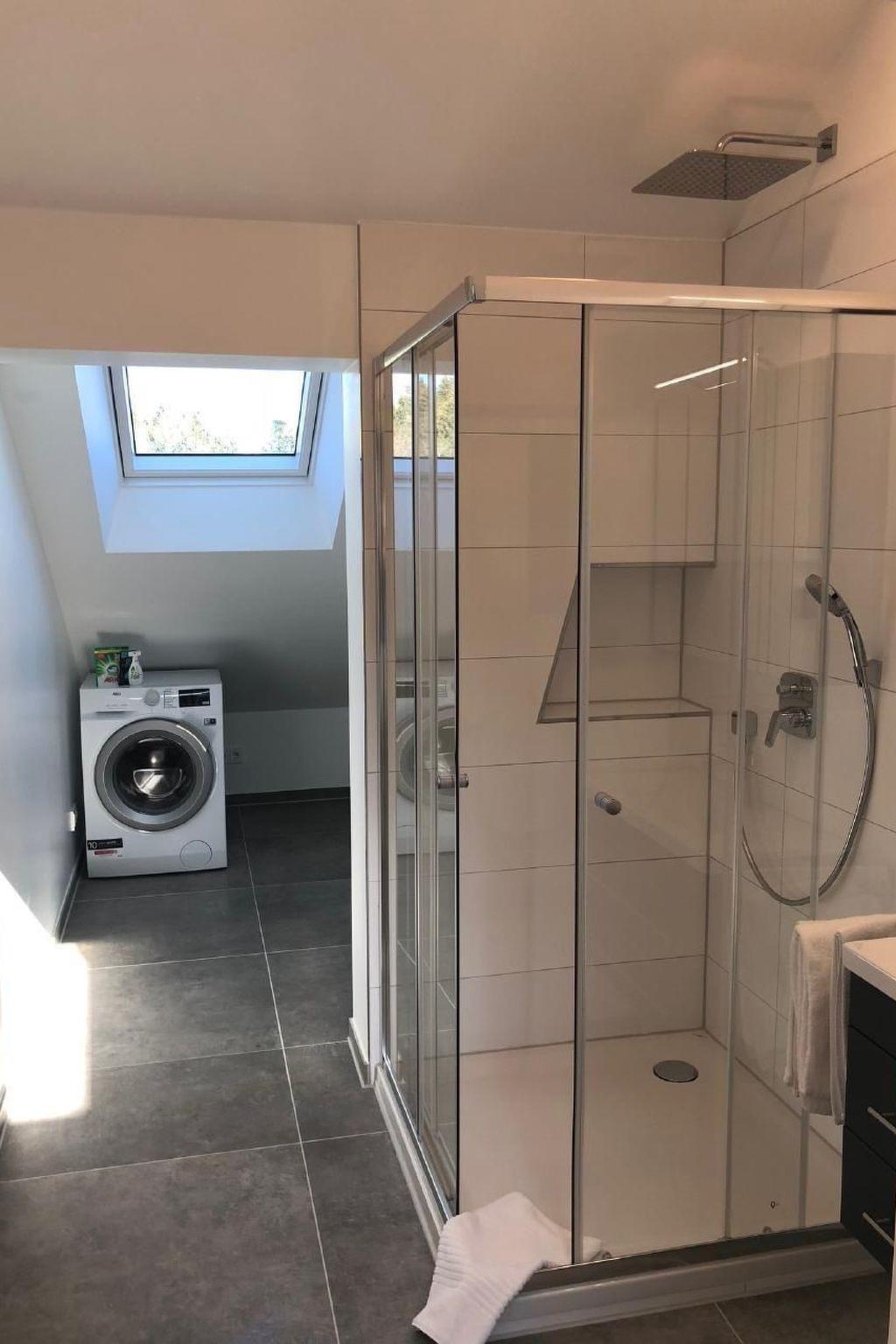 The spacious daylight bathroom impresses with a generous shower, sink, and toilet. Here, a washing machine is also at your disposal, allowing you to fully enjoy your stay.