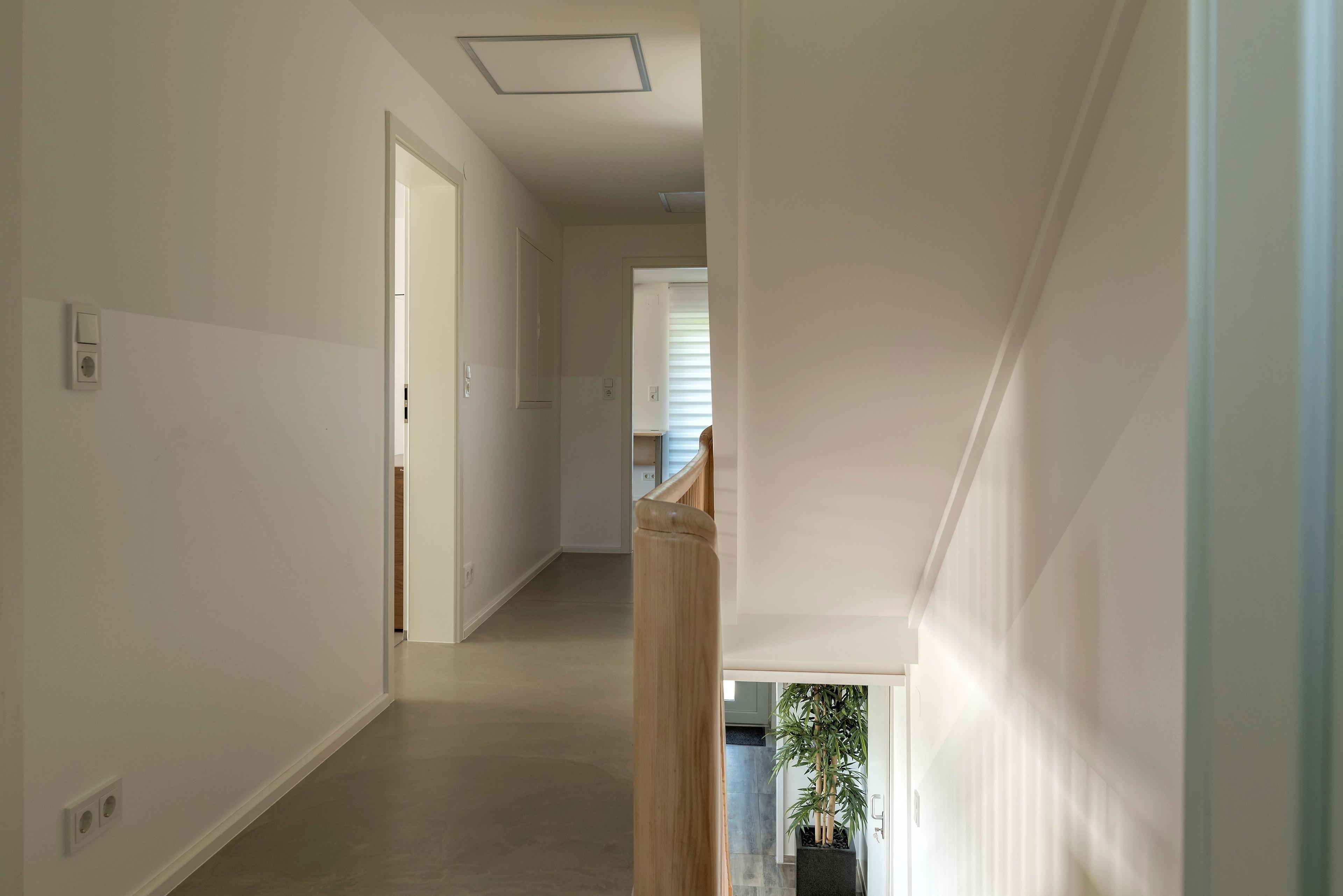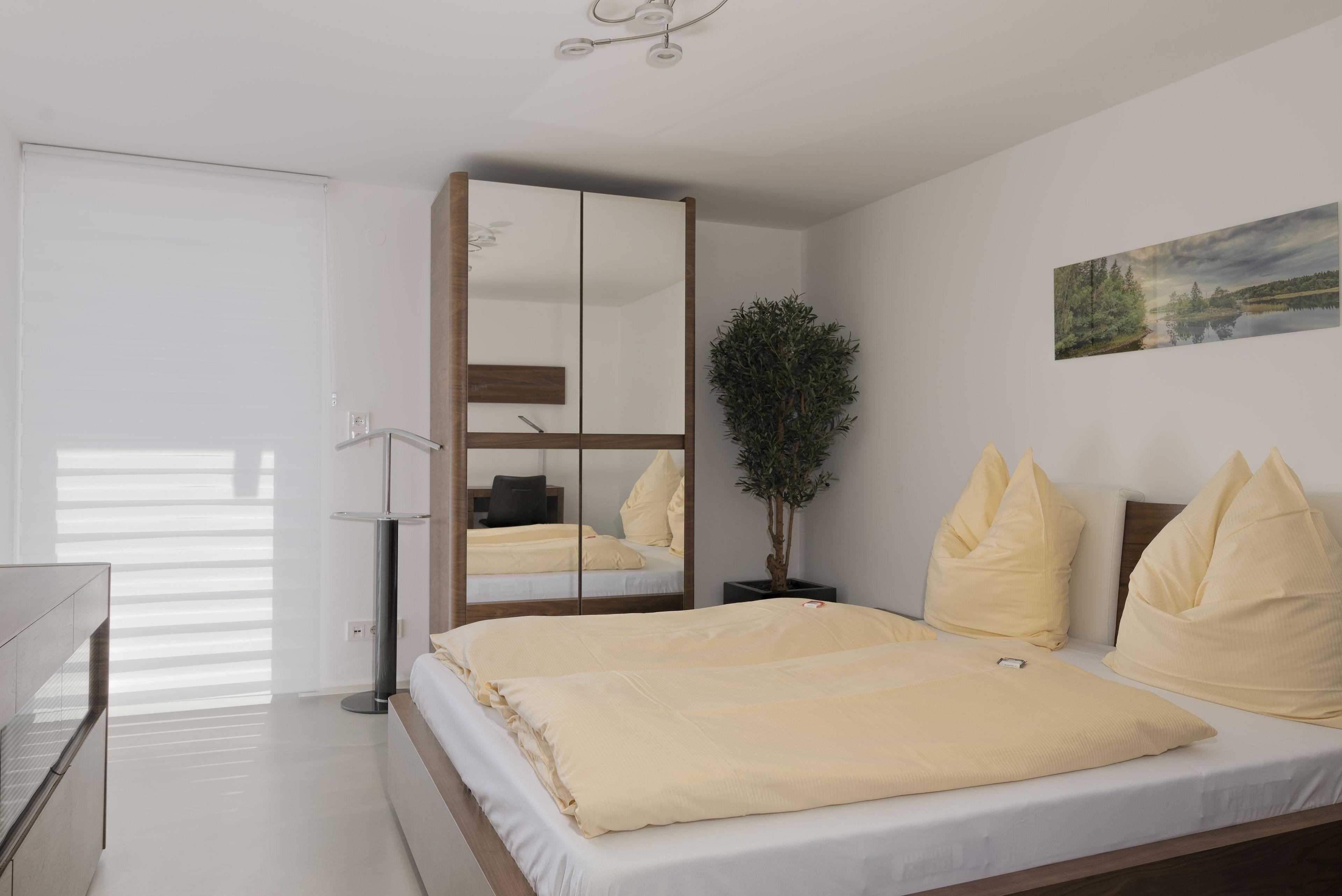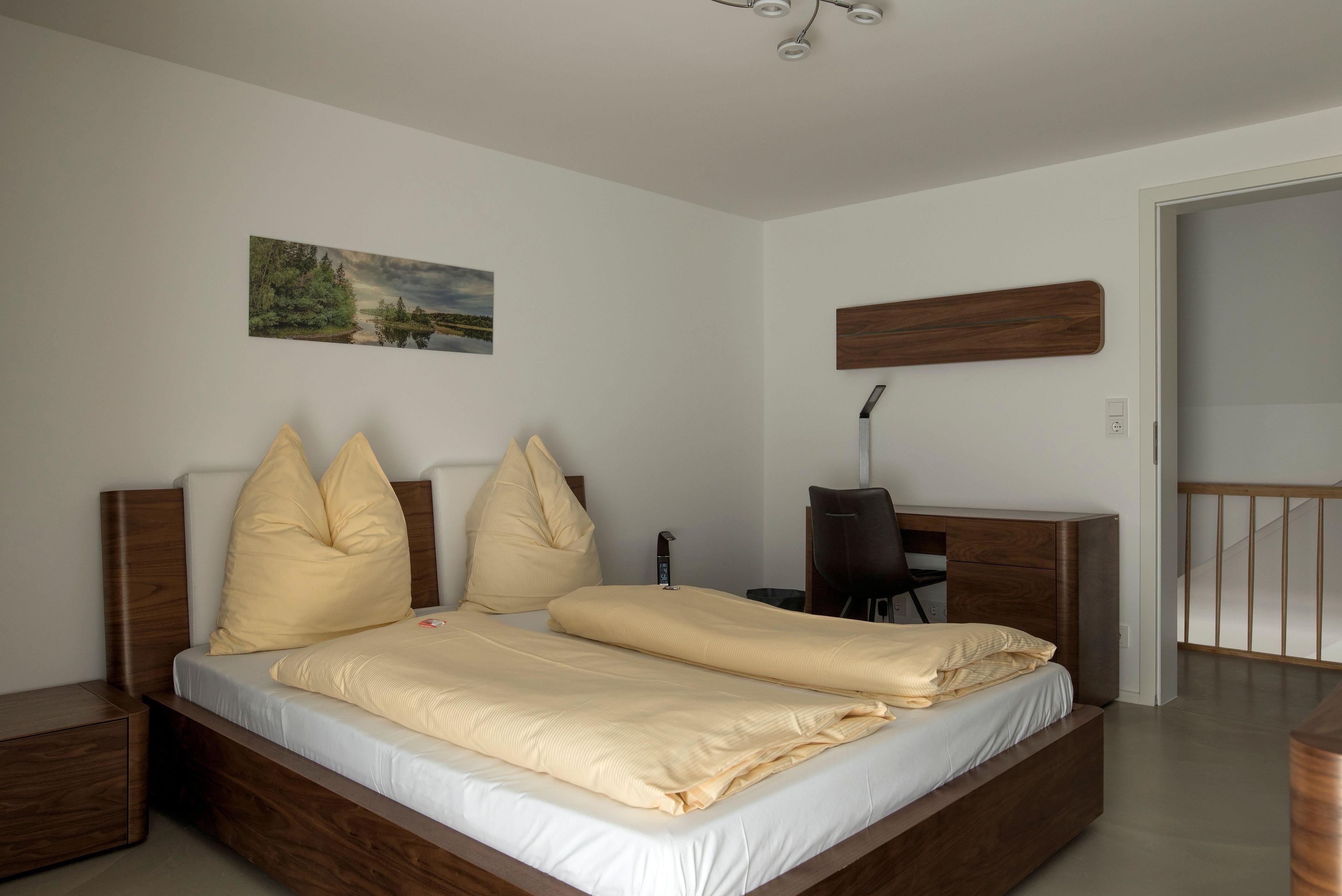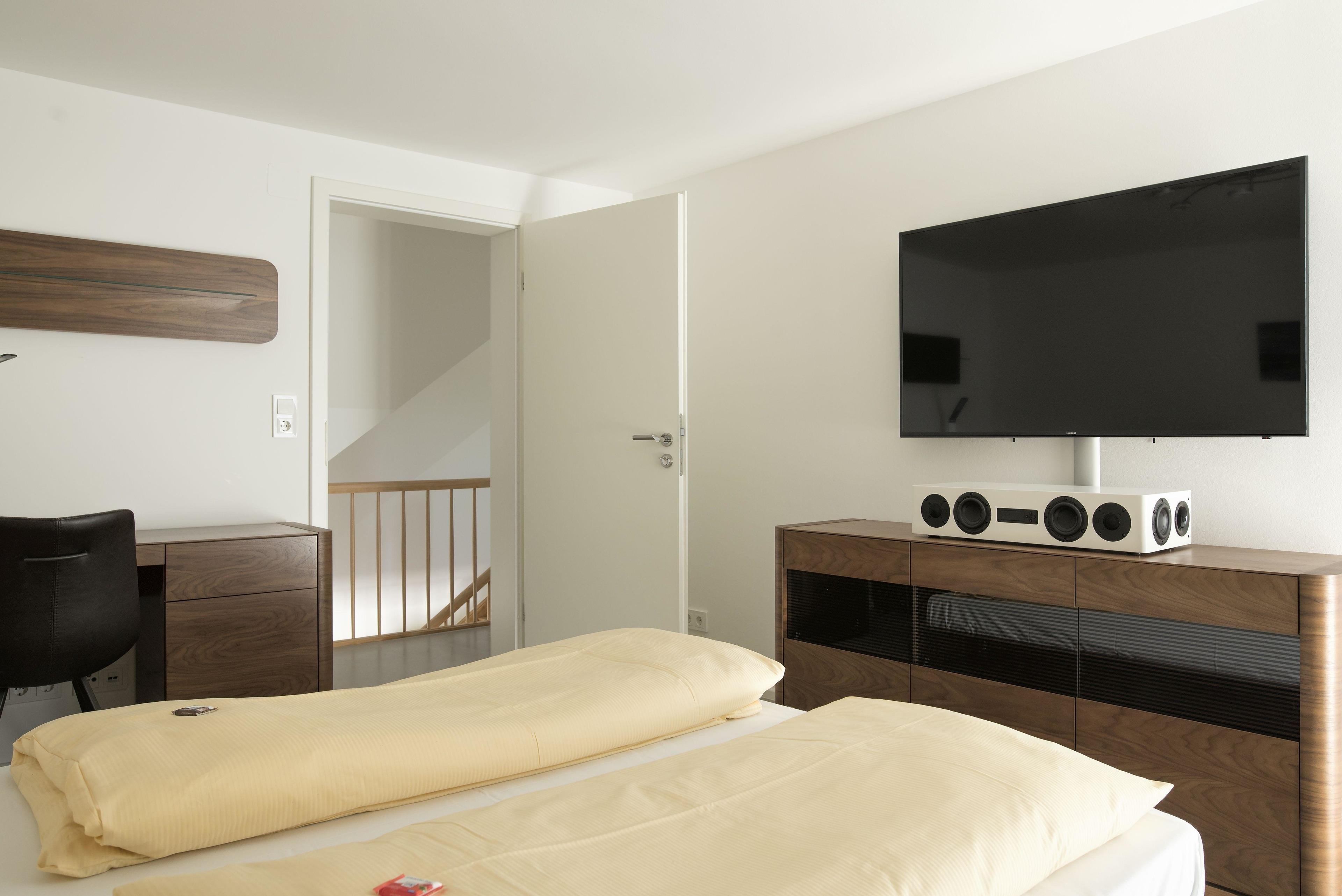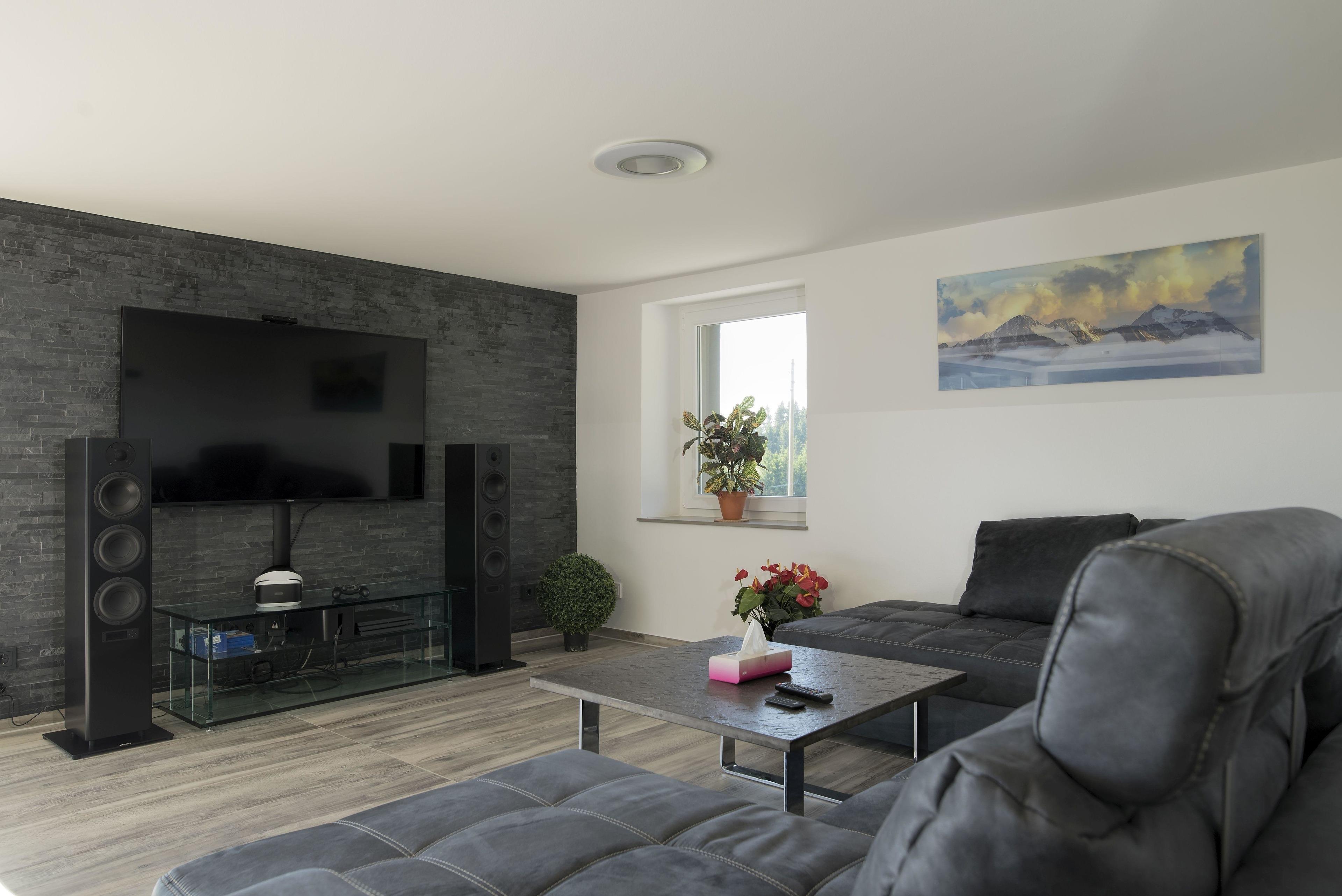 Die Wohnung erstreckt sich über zwei Etagen, wobei sich die 3 Schlafzimmer im 1. Stock befinden. Zwei der Zimmer sind etwa 16m2 groß und verfügen jeweils über ein Doppelbett, einen Kleiderschrank, elektrische Rollläden und SAT-TV. Das etwas größere Zimmer (ca. 26m2) bietet neben der Grundausstattung der anderen Zimmer auch eine Schlafcouch. Der offene Wohn-/Ess-/Kochbereich nimmt das Erdgeschoss ein. Die bequeme Couch im Wohnzimmer kann als Schlafgelegenheit für 2 weitere Gäste genutzt werden. Vor dem Panoramafenster befindet sich ein großer Esstisch mit Blick auf die Berge. Die Küche ist voll ausgestattet mit Backofen, Induktionsherd und Mikrowelle. Ein Kaffeevollautomat ist mietbar. Das Bad im Erdgeschoss bietet eine ebenerdige Dusche, eine Badewanne und ein WC. Im 1. Stock gibt es zusätzlich ein WC mit Waschbecken. Die gesamte Wohnung verfügt über Fußbodenheizung für zusätzlichen Komfort.