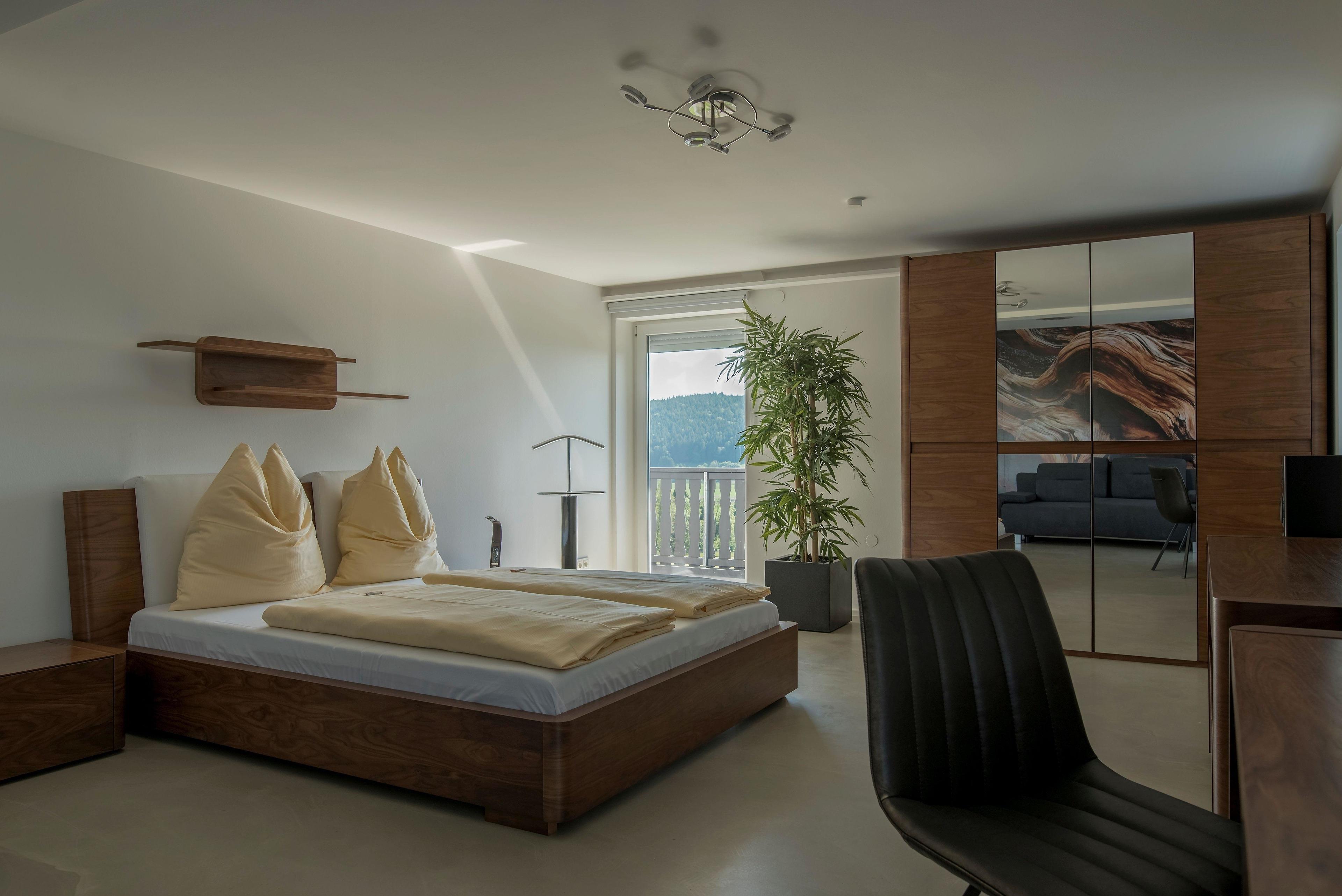Die Suite Panoramablick erstreckt sich über zwei Stockwerke und bietet mit ihren 3 Schlafzimmern sowie 2 Schlafcouches Platz für 6-10 Gäste. Genießen Sie den traumhaften Ausblick auf die umliegenden Wiesen, Berge und das Umland.