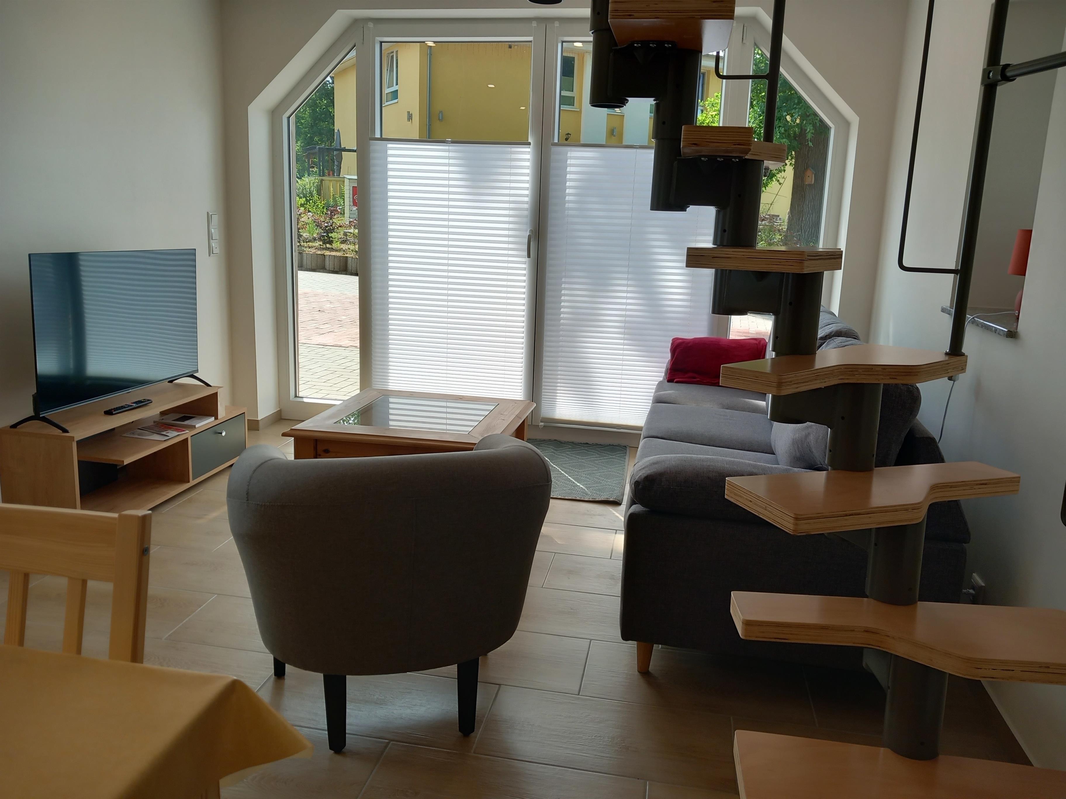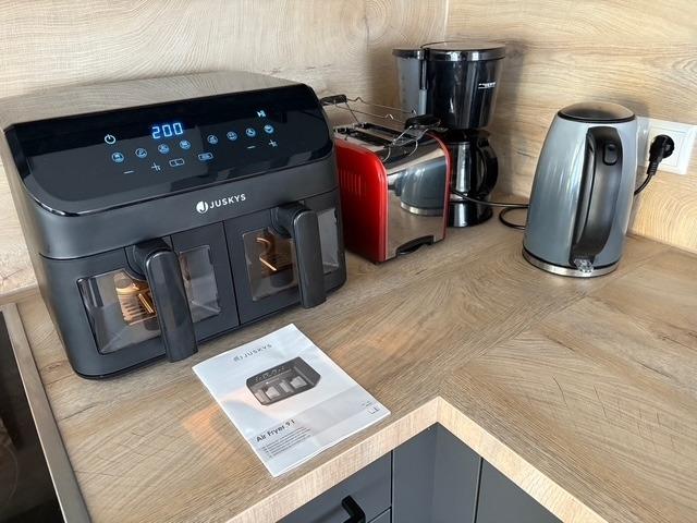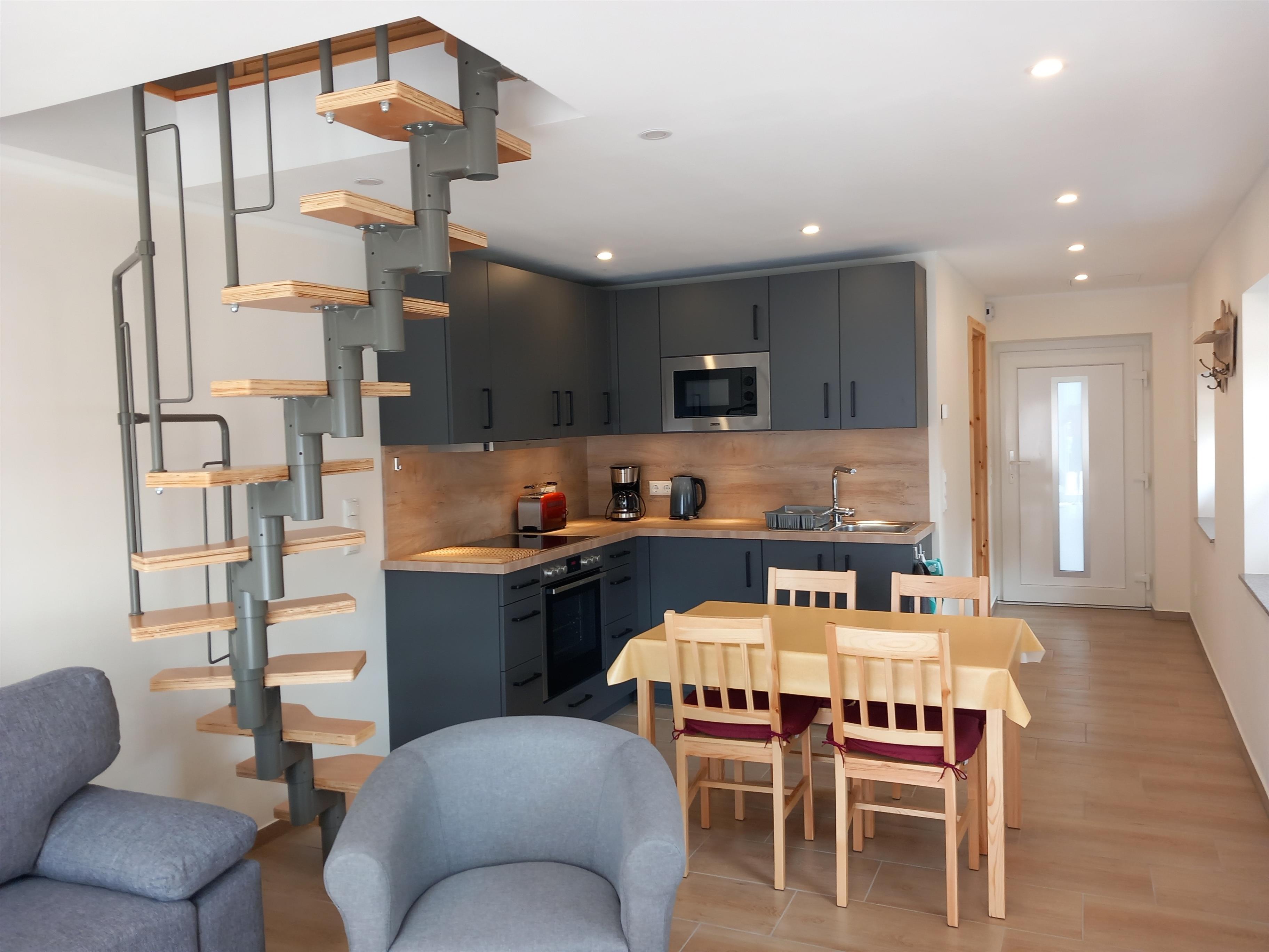 Das Erdgeschoss bietet einen hellen, offenen Wohnbereich und ein Badezimmer mit cremefarbenen Fliesen und Fußbodenheizung auf der gesamten Ebene. Eine Küche im Esszimmerbereich verfügt über eine Heißluftfritteuse mit zwei Kammern, einen Backofen, eine Mikrowelle, einen Kühlschrank, ein Kochfeld und ein Spülbecken. Zur Ausstattung im Erdgeschoss gehören eine Esstischgruppe für 4 Personen und eine bequeme Sofagruppe, sowie ein Fernseher.