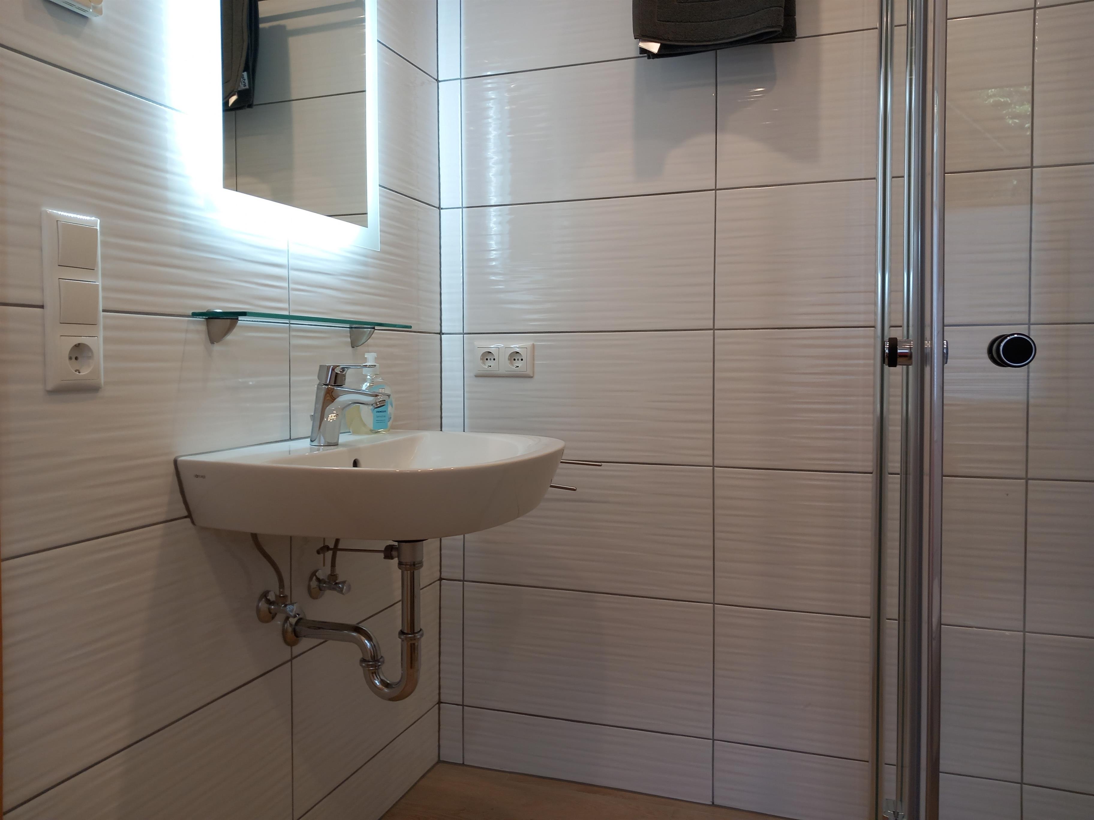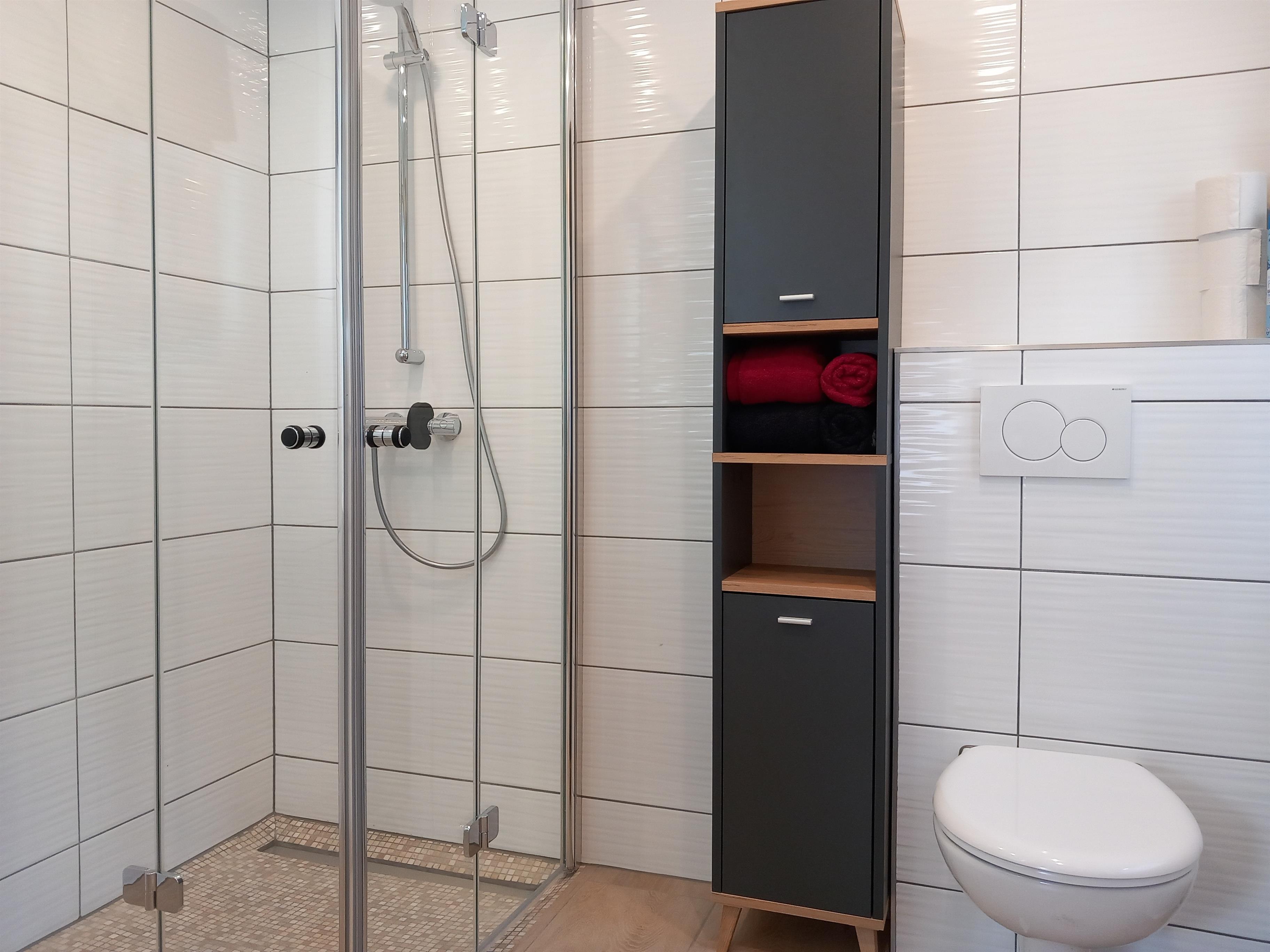 Das schöne Badezimmer harmoniert in hellen Farbtönen. Hier wurde eine barrierefreie Dusche integriert. Ein Badezimmerschrank sorgt für Ordnung der Reiseutensilien.