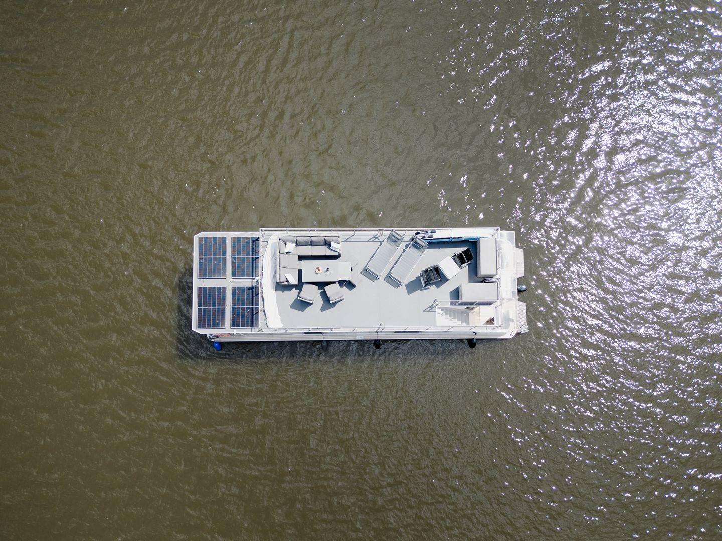 Hausboot Lubodne – modernes Ponton-Hausboot (14,44?m) für 2–6 Personen, 2 Kabinen, führerscheinfrei, Baujahr 2023 (Refit), Bug- & Heckstrahlruder, Terrasse, Klimaanlage, Heizung, TV, Dusche, Außenborder 60 PS, Marina Buchholz, Müritz.