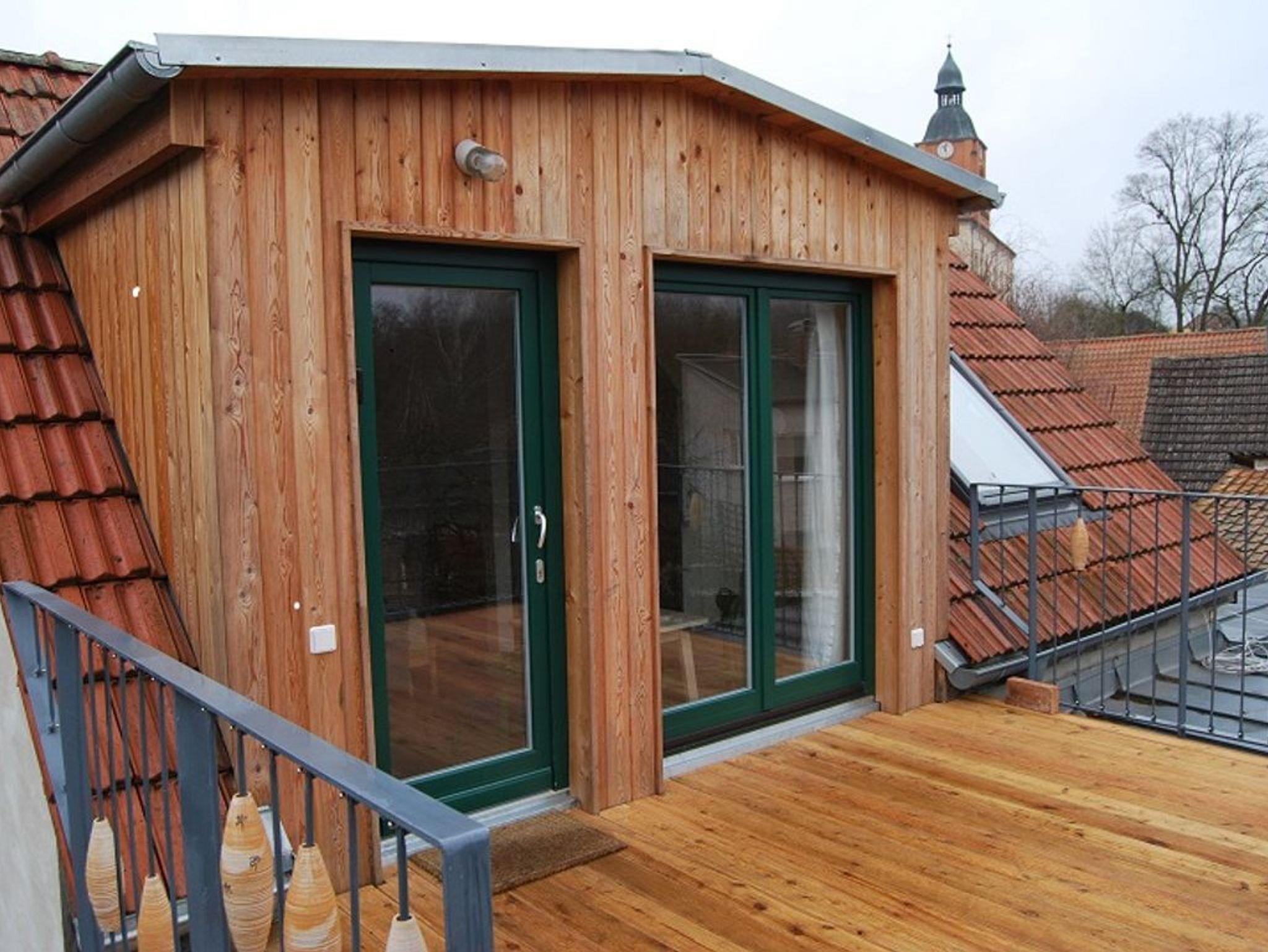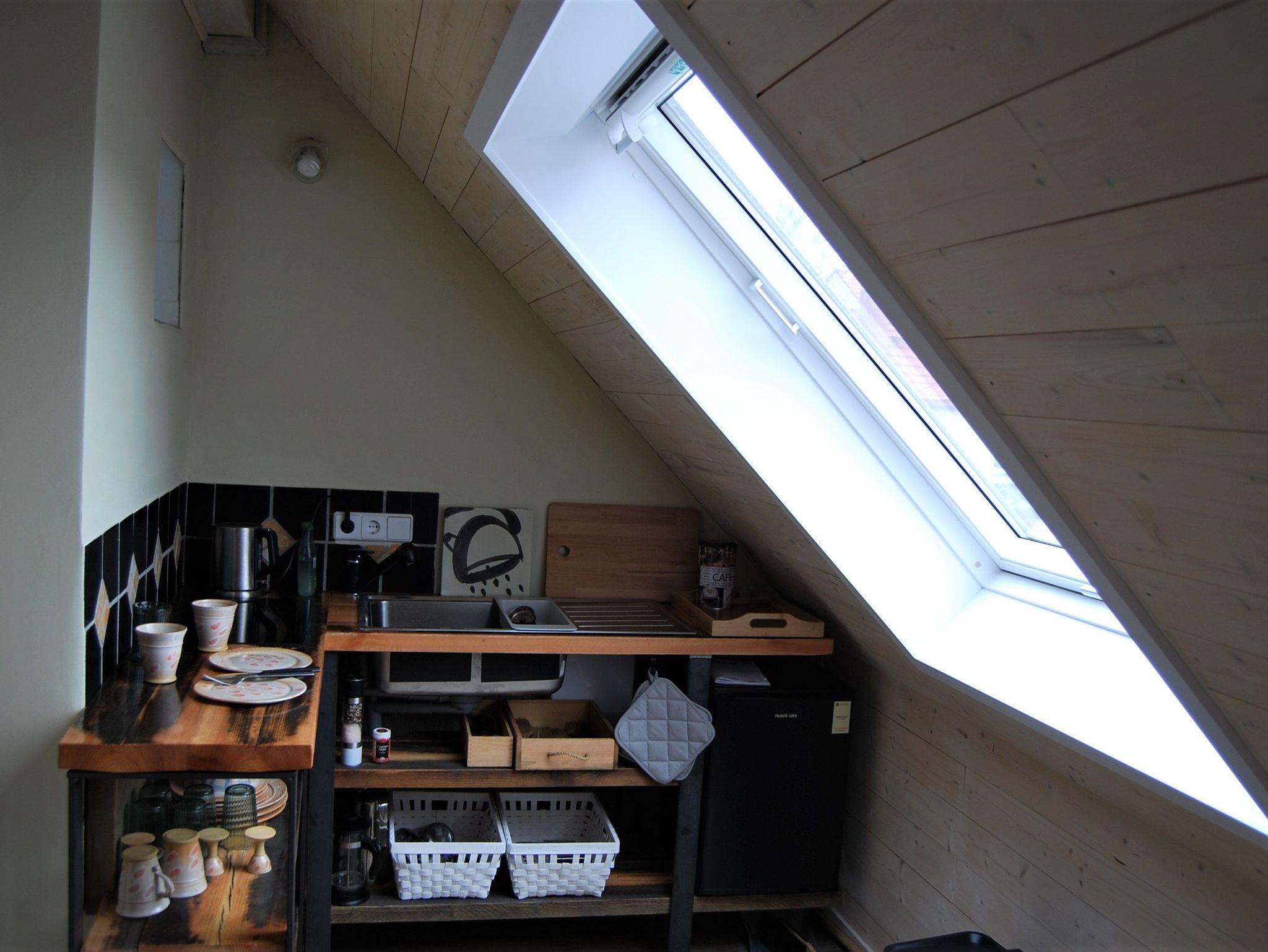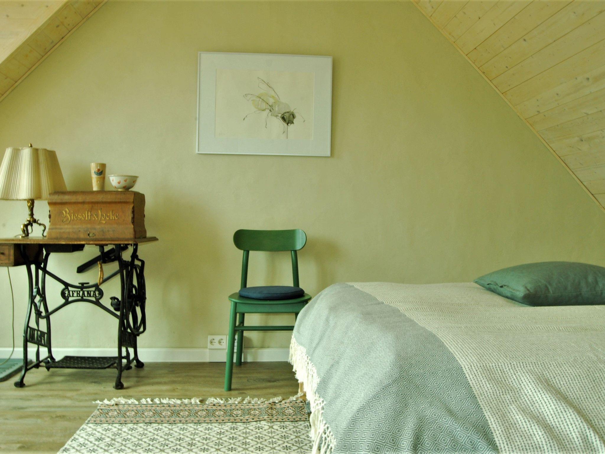 Die lichte Ferienwohnung unterm Dach ist ein kombinierter Schlaf- und Wohnraum mit integriertem Küchenbereich. Sie ist für 2 Personen ausgelegt, kann aber nach Absprache für eine 3. Person mit einem Schlafsessel aufgebettet werden (15 EUR/Nacht). Küchenaustattung und Möbel, auch für die großzügige Terrasse, sind ausreichend vorhanden. Vom kleinen Essplatz, aber auch vom Bett aus, haben Sie einen wunderbaren Blick in den Garten. Ein Internetzugang ist möglich. Fernseher kann auf Anfrage ebenfalls gestellt werden. Bettwäsche und Handtücher sind inklusive. Die Wohnung verfügt über ein kleines Bad mit Dusche und eigenem Fenster. Der PKW-Stellplatz am Haus kann genutzt werden. Wenn es etwas kühler wird und Sie möchten, dass die Heizung eingeschaltet wird kommen 5 Euro /Ü Heizungskosten dazu.