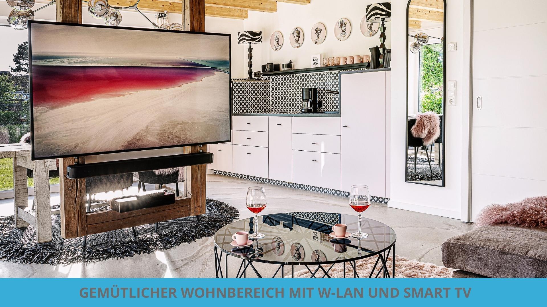 Im Wohnzimmer lädt das grosse Schlafsofa mit einer Liegefäche von 1,60x2,00m zu gemütlichen Stunden ein. Oder doch lieber Kochen und Klönen in der wunderbaren Küche mit Blick aus den bodentiefen Fenstern dieses tollen Neubaus in den Garten?