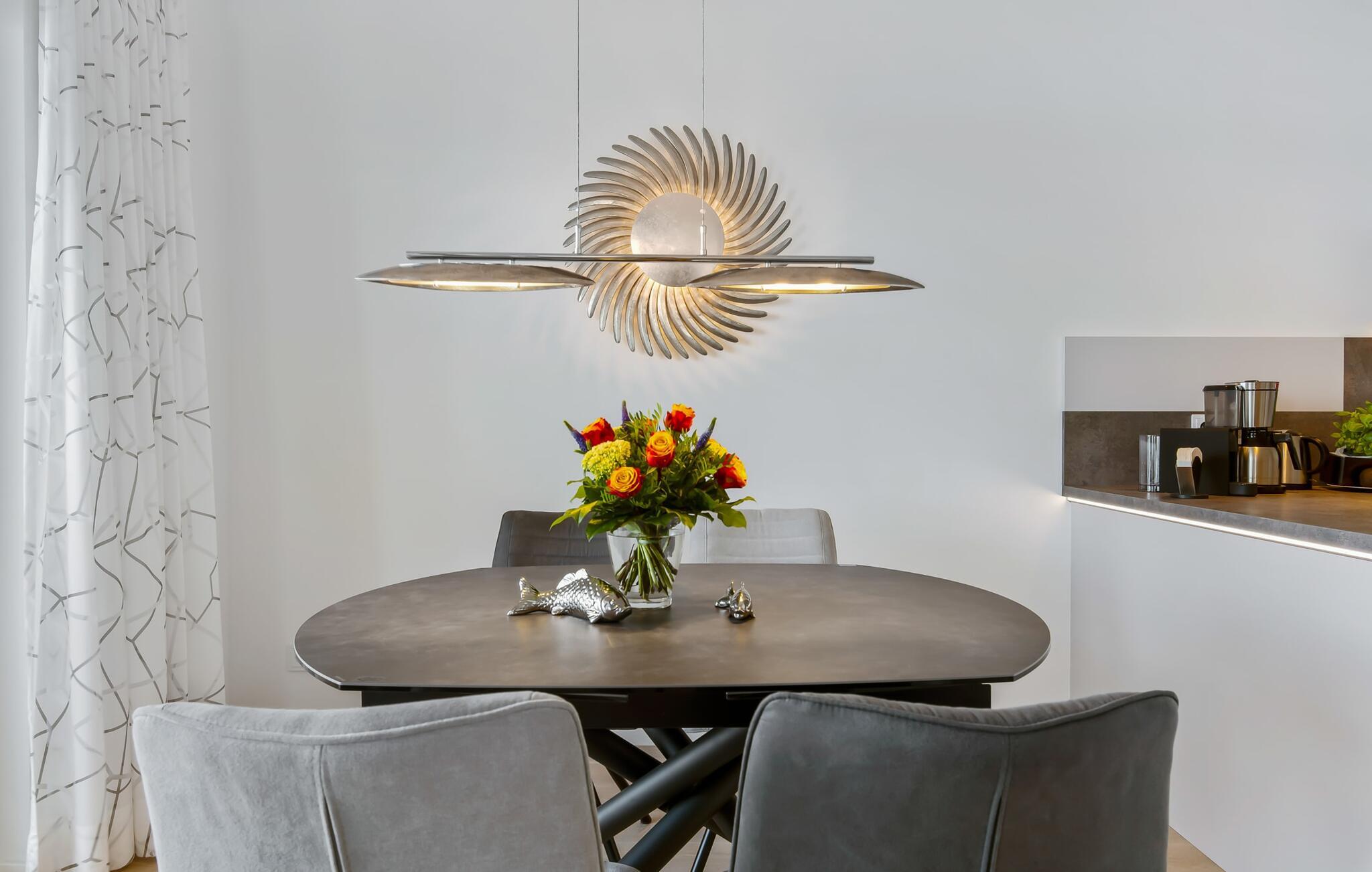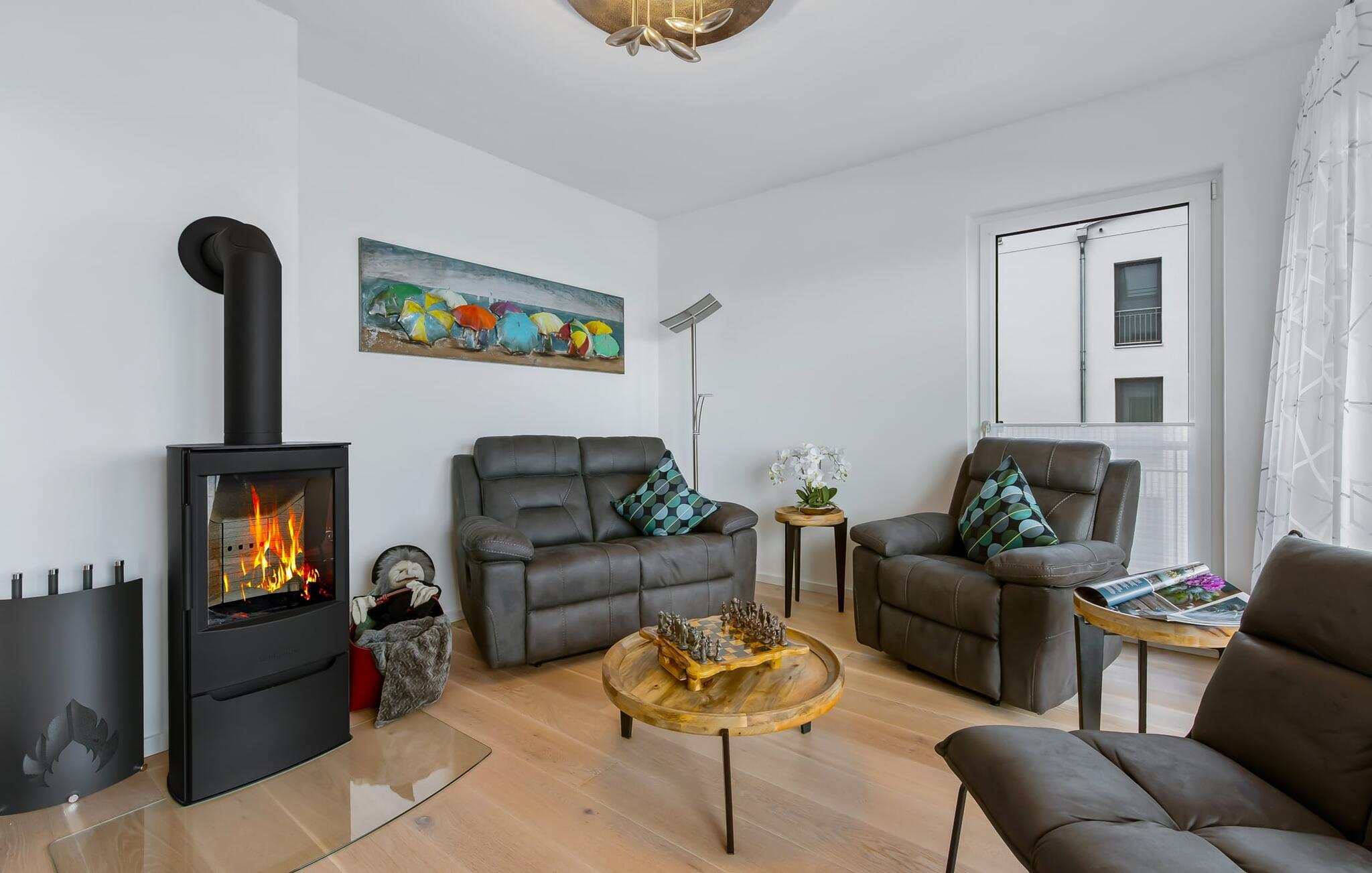Hele lejligheden har ægte parketgulve og gulvvarme. Den lyse og rummelige opholds- og spisestue med pejs udstråler elegance og varme. Delikate farver og lækre kvalitetsmøbler som en manuelt justerbar dobbeltsofa eller en elektrisk justerbar afslapningsstol fuldender udstyret.