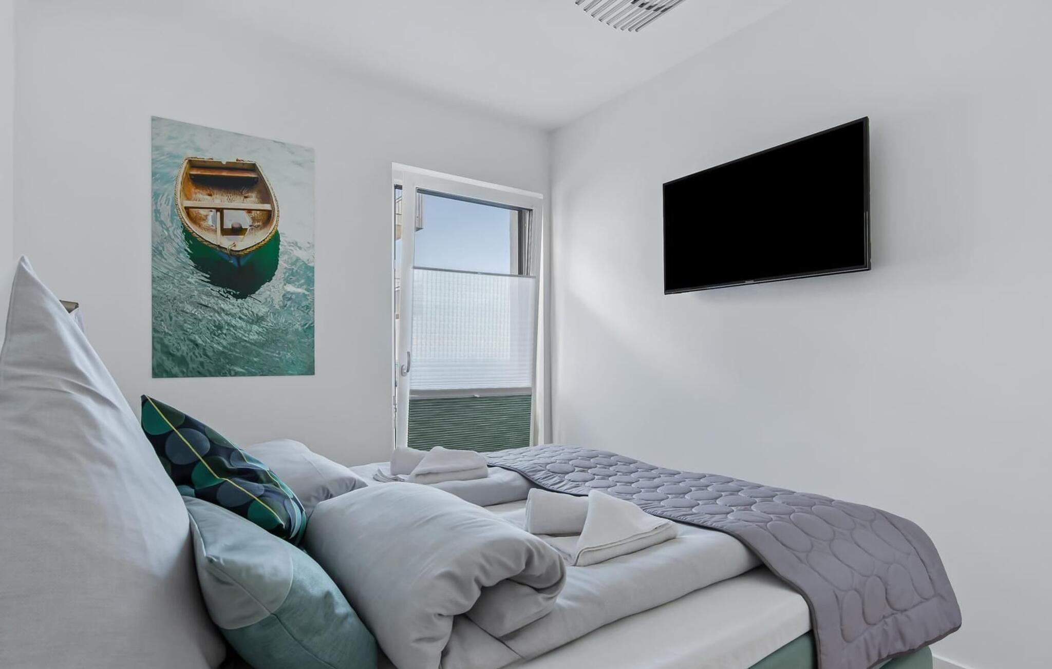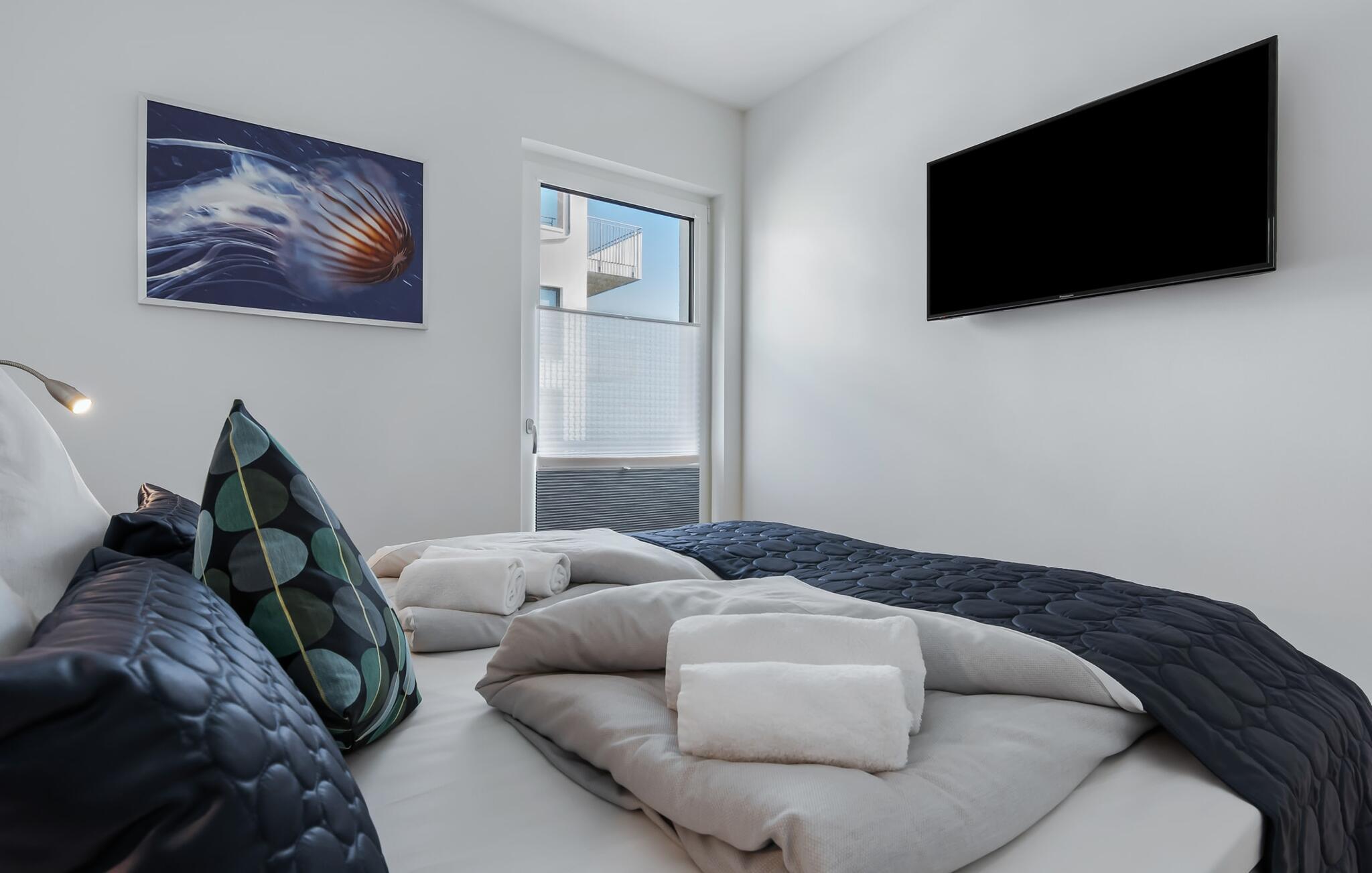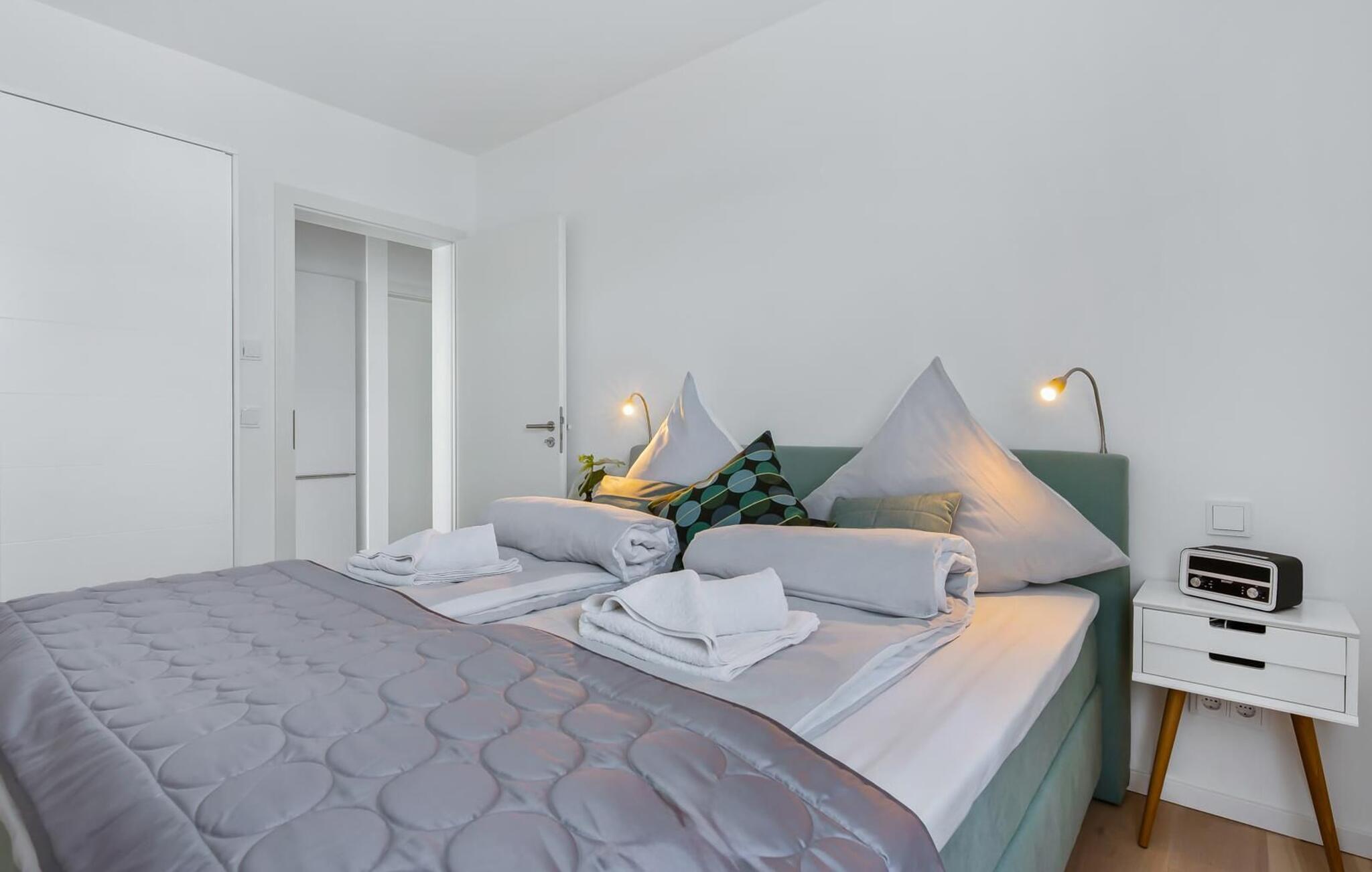 Luksusen ved Buhne 17 fortsætter i de to soveværelser, som hver er indrettet med en dobbelt boxmadras. Vinduerne har desuden mørklagte plisségardiner og insektbeskyttelse. Uforstyrret og afslappet søvn er garanteret.