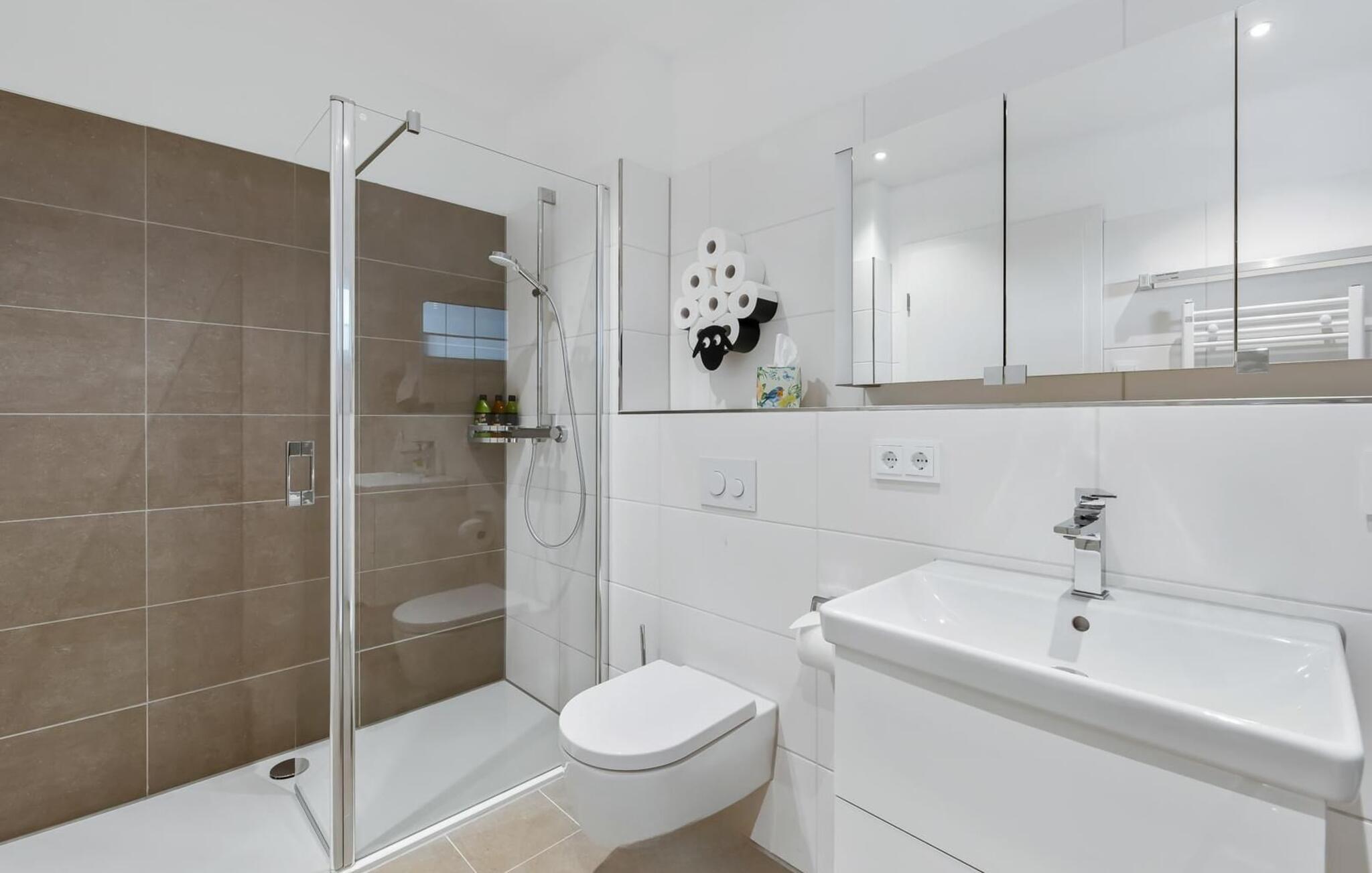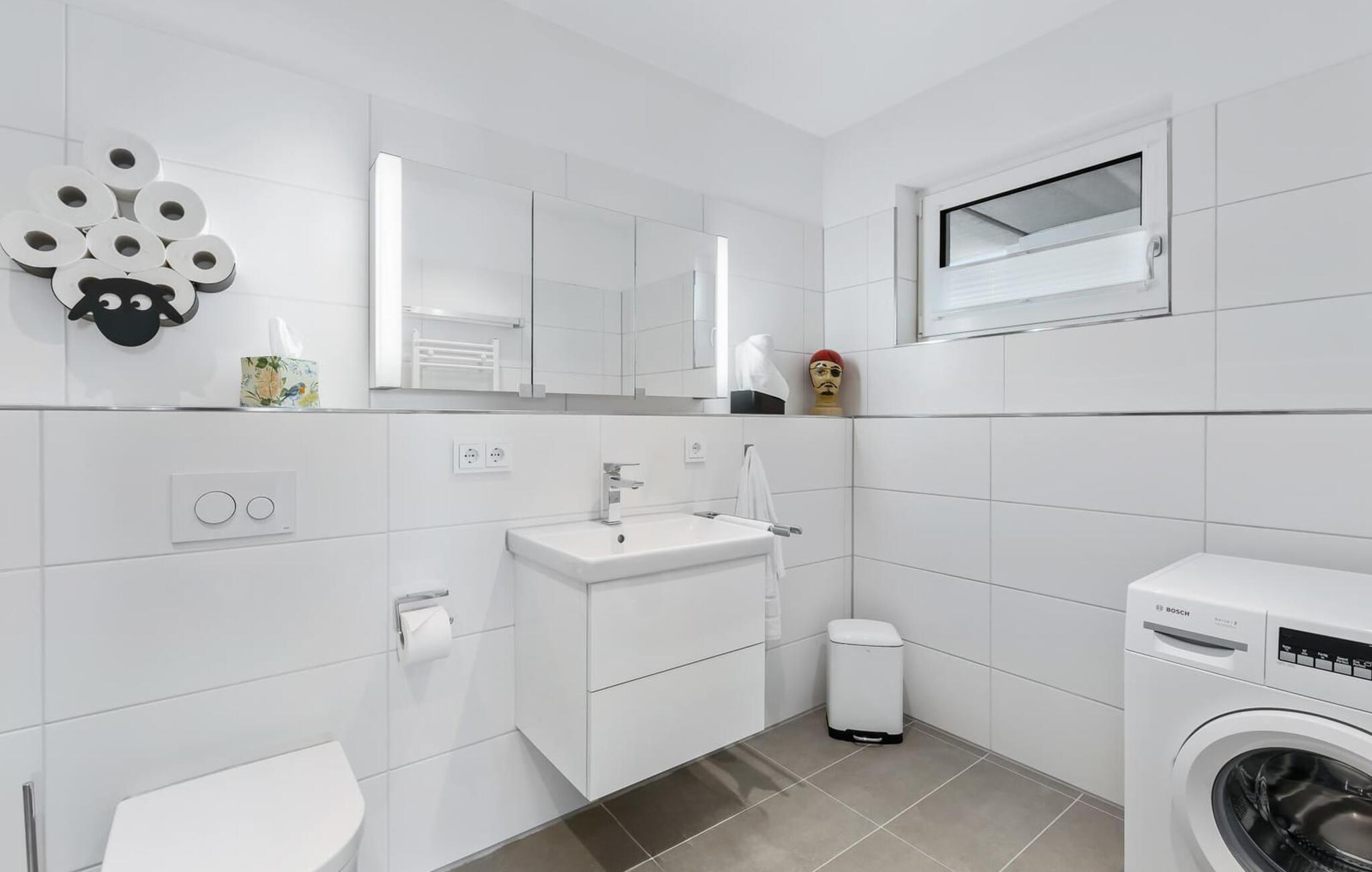 Når I kommer ind på badeværelset, bliver I forkælet med en ekstra stor bruseniche til at begynde en vellykket feriedag, og til jeres vasketøj er der vaskemaskine og en udtrækbar væghængt tørresnor fra Leifheit samt en tørrestativ til terrassen.