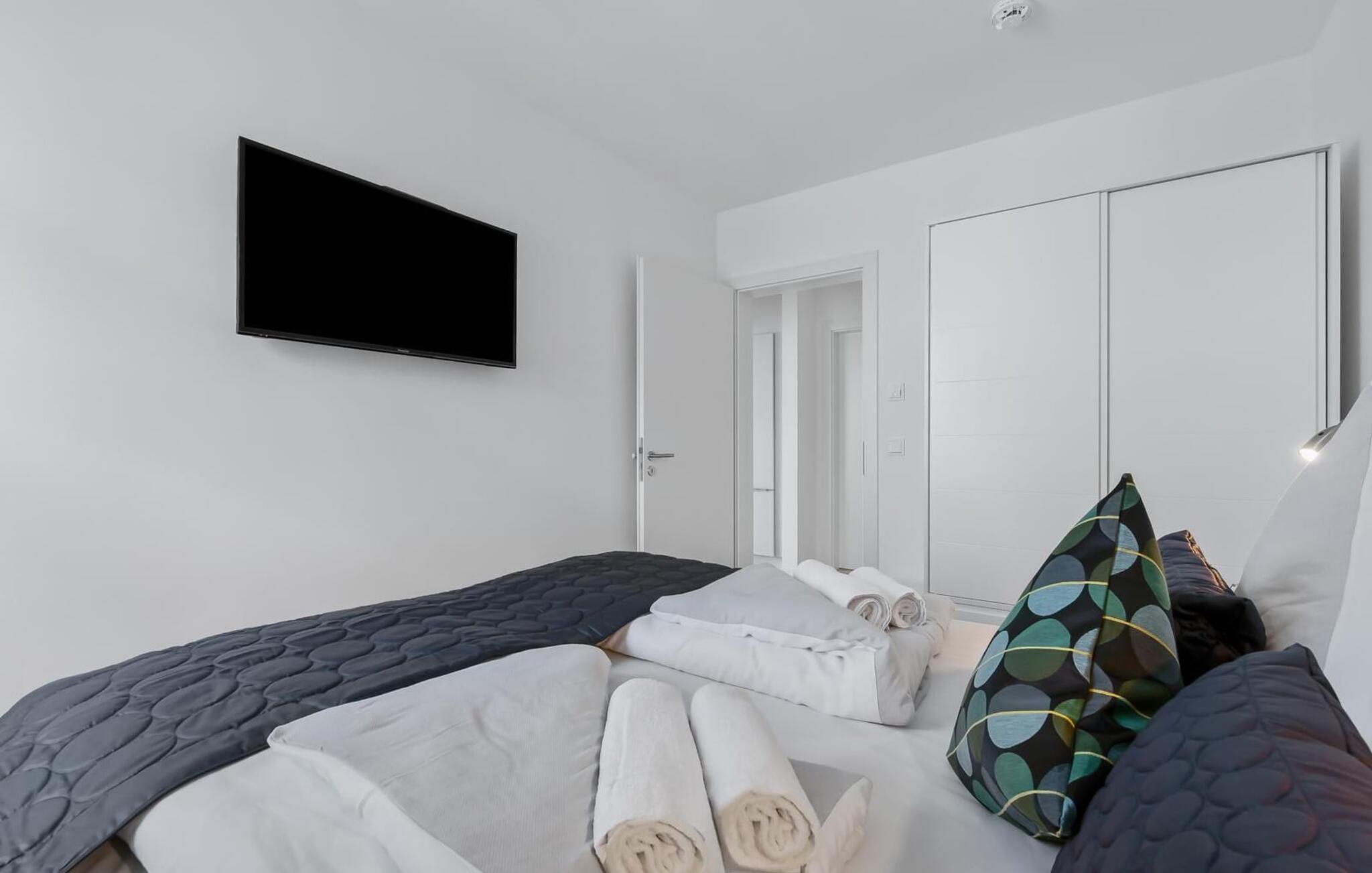Alt dette kan nydes foran det utrolige panorama af Østersøen. Det er et imponerende og utroligt vandskue, der tilbydes jer her 24 timer i døgnet. Hvis vejret ikke tillader jer at sidde på altanen, kan I også nyde skuet fra jeres sofa takket være gulv til loft-vinduerne. Har I brug for musikalsk akkompagnement, er der radio og fjernsyn i stuen og begge soveværelser.