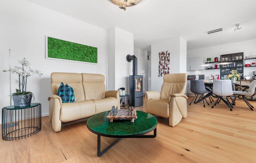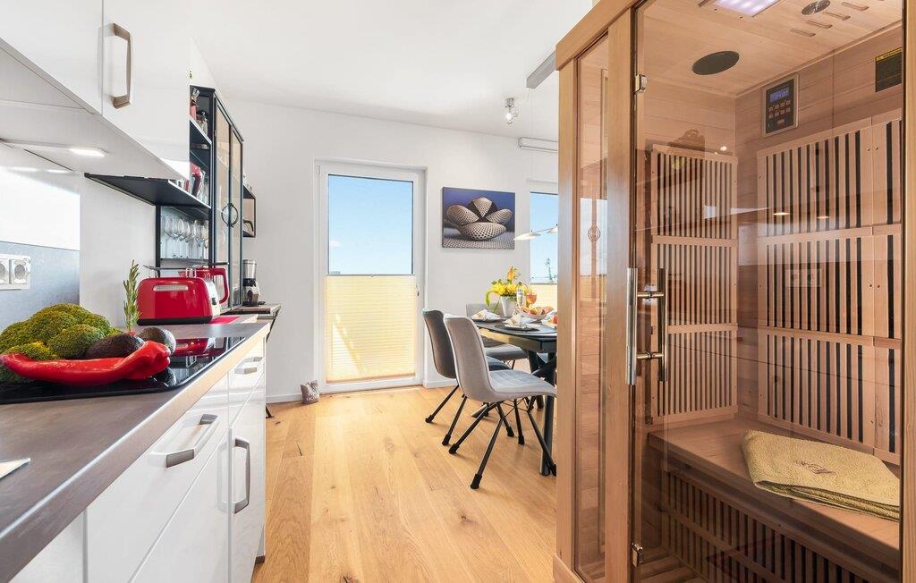 Træd ind i en moderne lejlighed af meget høj kvalitet indrettet med sans for detaljer med uhindret udsigt over Østersøen på 1. sal i et lejlighedshus på strandpromenaden. Uanset om I er en familie med børn, på ferie med venner eller holder en pause for to, byder Buhne 7” jer varmt velkommen og ønsker jer en uforglemmelig ferie lige fra starten. Nyd morgensolen, mens I spiser morgenmad sammen på den sydvendte terrasse med havudsigt og en strandstol og afslut aftenen efter en skøn dag på den vestvendte terrasse med et glas vin og hyggelige samtaler, mens solen går ned. Når det er køligt eller blæsende, kan I drømme jer ved pejsen i stuen, putte jer i de afslappende stole, se jeres yndlings-tv-program, oplev legene sammen, nyde massagestolen eller slappe af i den infrarøde sauna (varmekabinen). I kan også drømme vidunderligt i de to soveværelser, som hver er udstyret med en komfortabel boxmadras (180 cm x 200 cm), topper, ekstra hygiejnisk sengetøj, læselamper, rummeligt klædeskab, plisségardiner, fladt. skærm og glidende insektskærm. Fra begge soveværelser er der udgang til den møblerede vestvendte terrasse. Højhastigheds-WiFi er gratis, og tv'erne leverer streamingtjenester såsom Netflix, Magenta Home LMagentaTV Smart osv. På badeværelset finder I en stor bruseniche med klapsæde, toilet, håndvask med underskab, stort spejlskab, kosmetikspejl, hårtørrer, håndklæderadiator, vaskemaskine og en udtrækbar væghængt tørretumbler. Der er også et insektnet på badeværelsesvinduet. Det omfattende køkkenudstyr imponerer med alt, hvad man kan ønske sig i et moderne køkken. Til de yngre gæster er der en høj stol, specialservice/bestik og en trinskammel på badeværelset. Hele lejligheden er udstyret med ægte træparket, gulvvarme og persienner. Vinduerne i stuen kan også mørklægges med et elektrisk rullegardin med fjernbetjening. Der er plads i den underjordiske parkeringsplads til jeres bil. Derfra kan I tage elevatoren direkte til jeres opholdsområde. Cykler kan opbevares sikkert i den aflåselige cykelkælder ved siden af den underjordiske parkeringsplads. Hvis køkkenet forbliver koldt, byder den italienske restaurant på havnen på en omfattende, lækker menu med mad og is. Populære cocktails, kaffe, kage og en udstilling med lokale kunstnere venter på jer i kunstbaren. EDEKA, der også ligger ved havnen, er velassorteret til jeres indkøb. Her er også en bistro med et udvalg af retter til den lille appetit og et velassorteret bageri. Bemærk venligst: OstseeResort Olpenitz er meget populært, og der bygges fortsat i parken. Ikke desto mindre kan I se frem til en 5-stjernet standard og et førsteklasses ophold. Byggeaktiviteterne kommer ikke til at forstyrre jer på ferien, og derfor gives der ikke yderligere afslag i prisen.