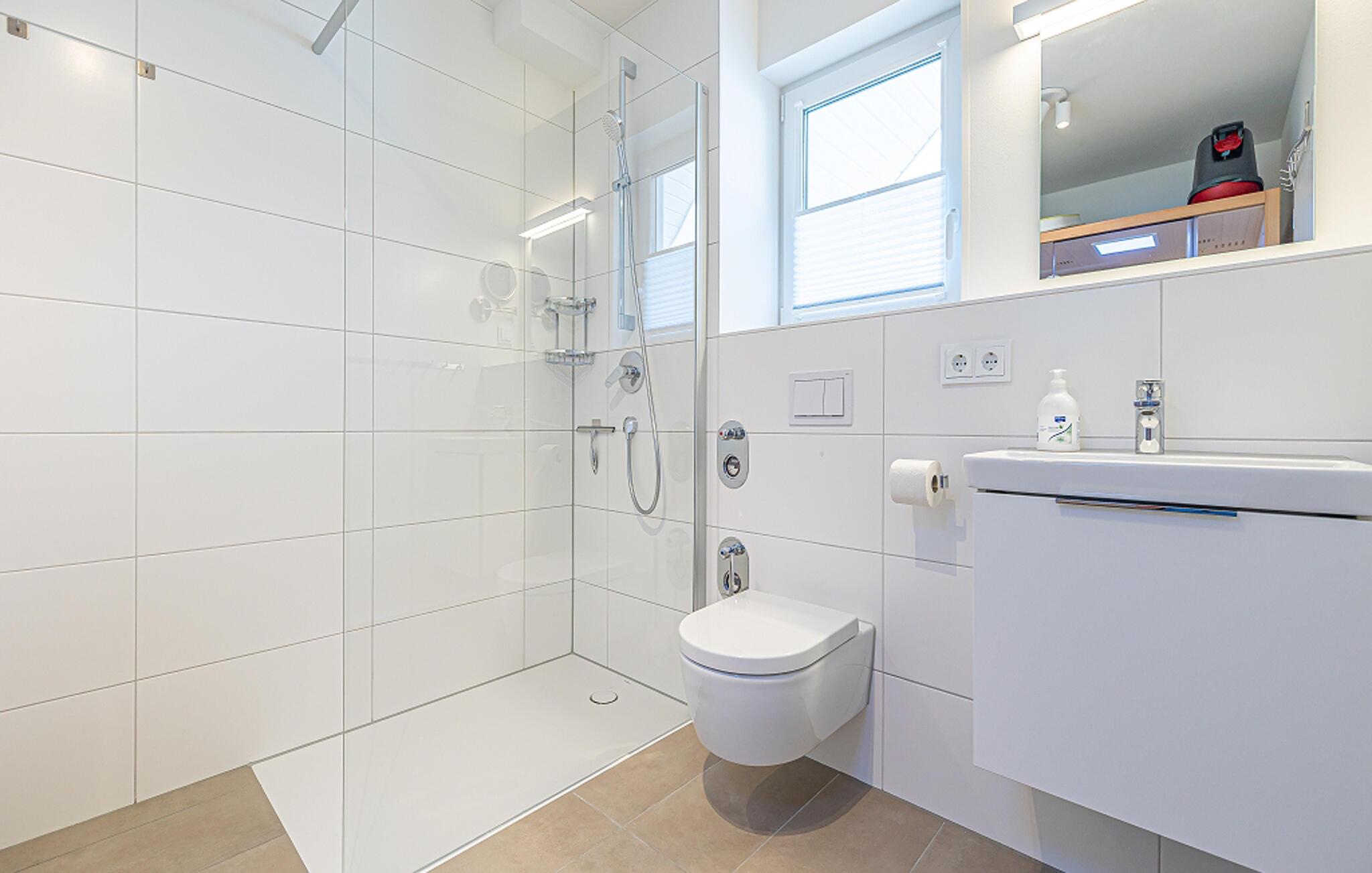 Det luksuriøse badeværelse er udstyret med bruseniche og infrarød sauna (varmekabine). Her kan I slappe af efter en lang dag på stranden og lægge hverdagen bag jer. Det smagfulde og højkvalitets interiør fuldender ferielejlighedens overordnede udseende og lader intet tilbage at ønske.