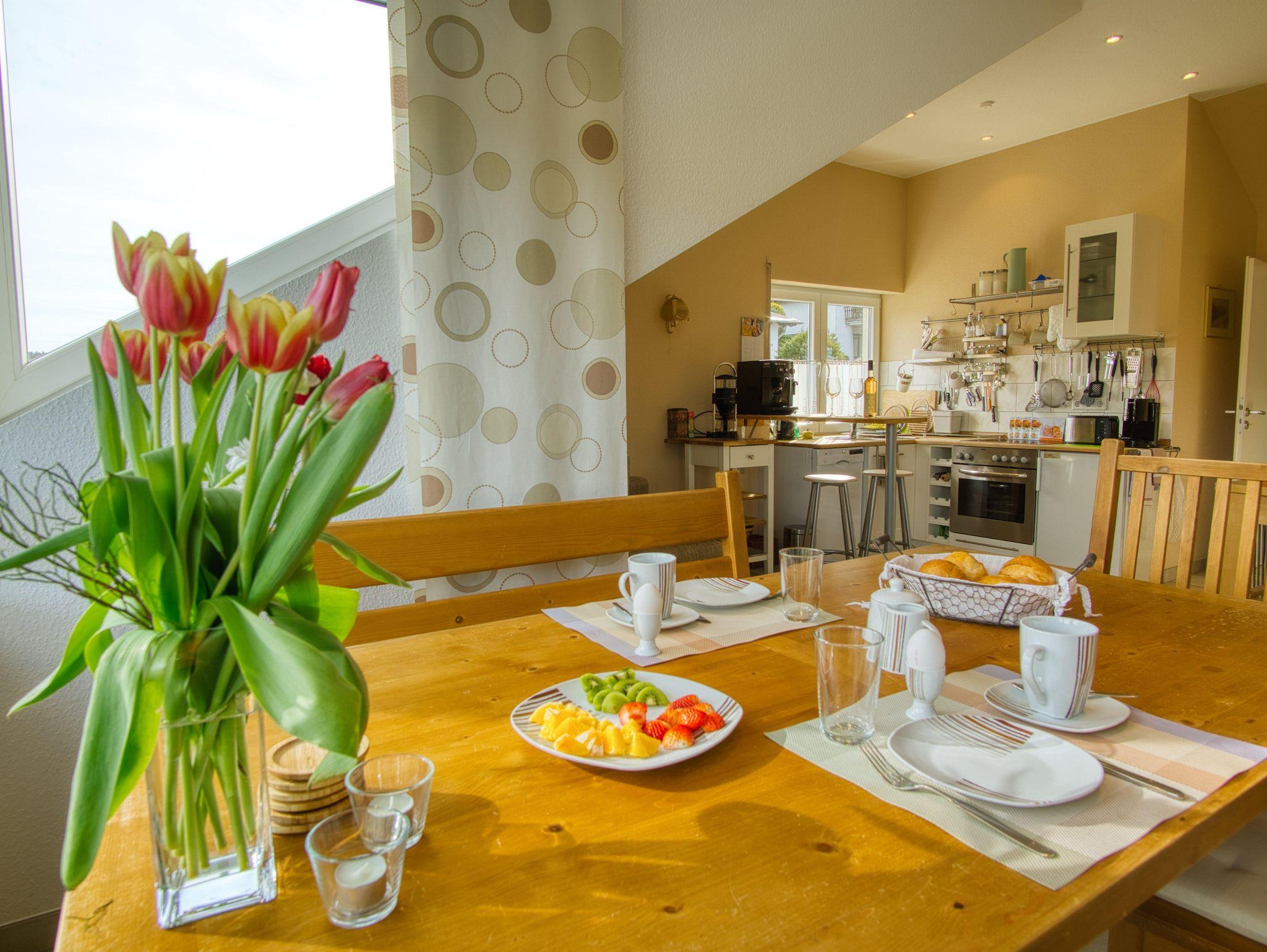 Neumöbilierte 5-Sterne-Wohnung mit toller Aussicht, Doppelzimmmer, Wohnzimmer mit Sofabett, Essecke, kl. Küche, Bad/WC und Sauna