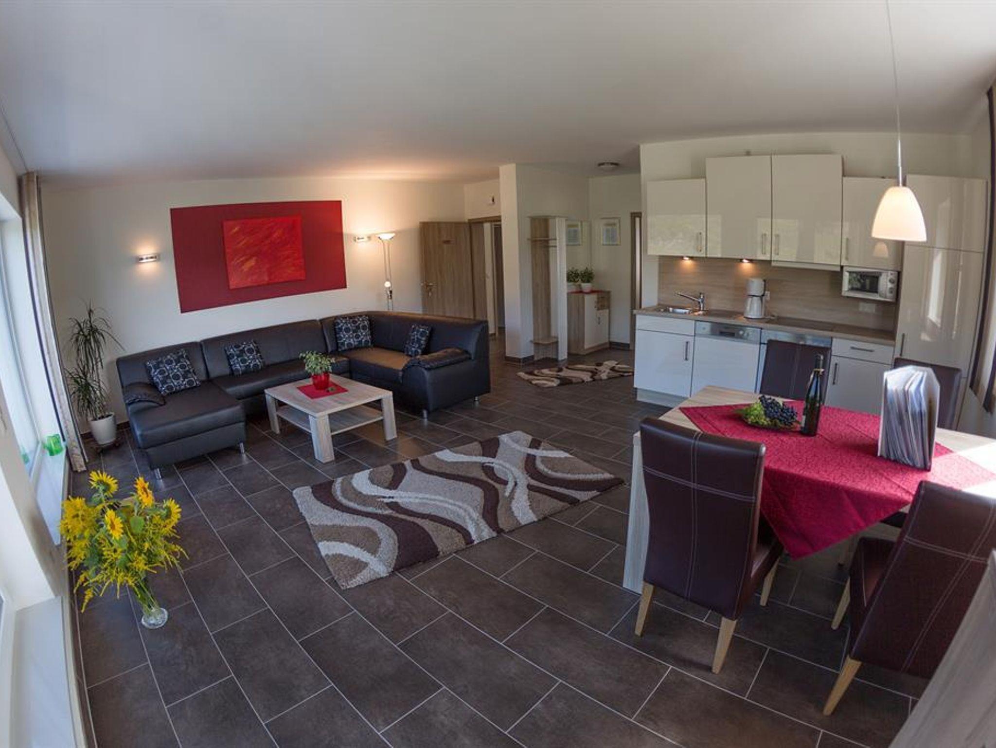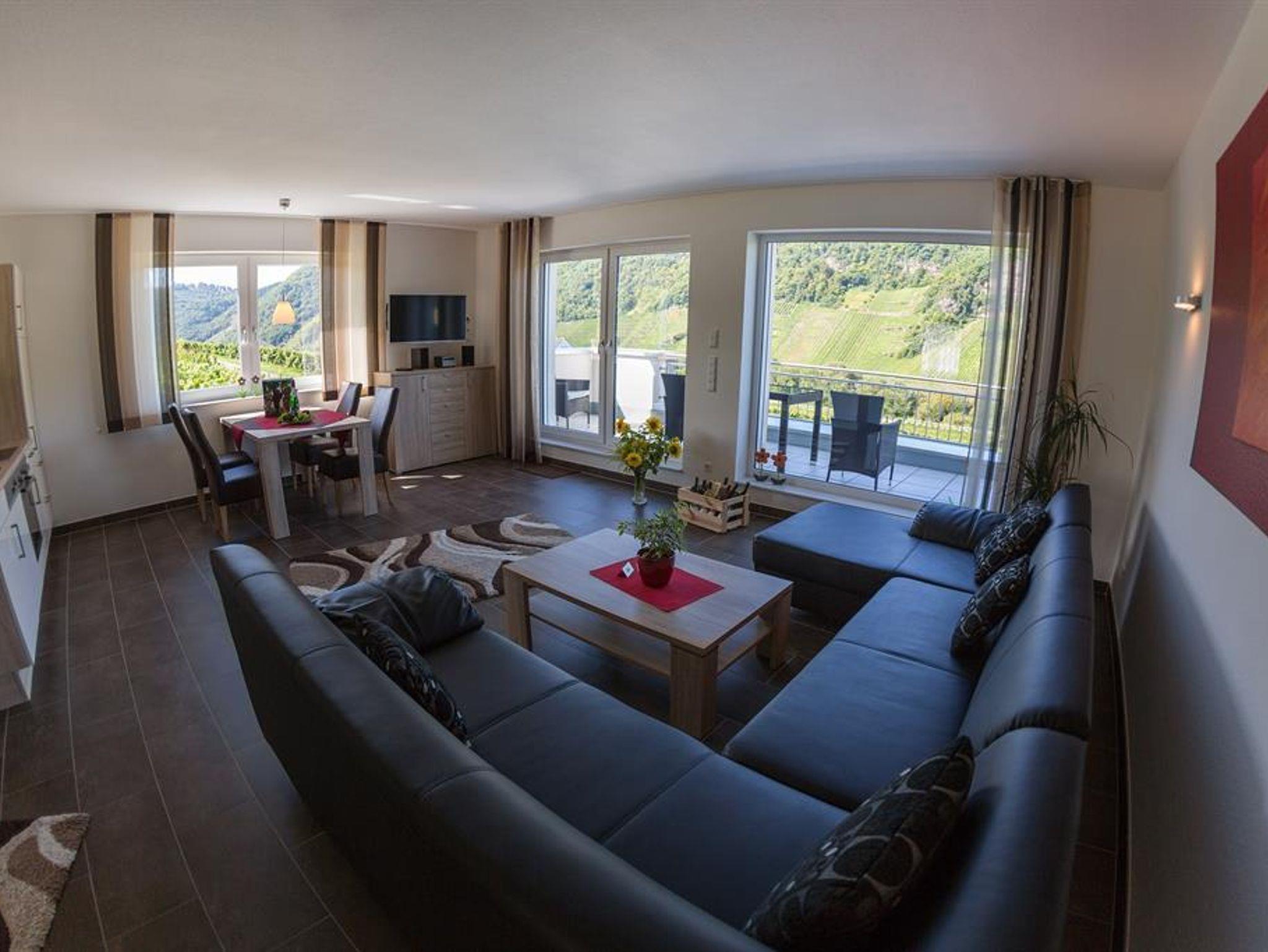Moderne, neue Komfortferienwohnung. 67m², große Panoramafenster mit unverbautem Ausblick auf die Mosel und Weinberge. Moderne Einbauküche, Flachbild-TV, Stereoanlage, Fußbodenheizung, ebenerdige Dusche und großer Balkon, sowie viele weitere Annehmlichkeiten.