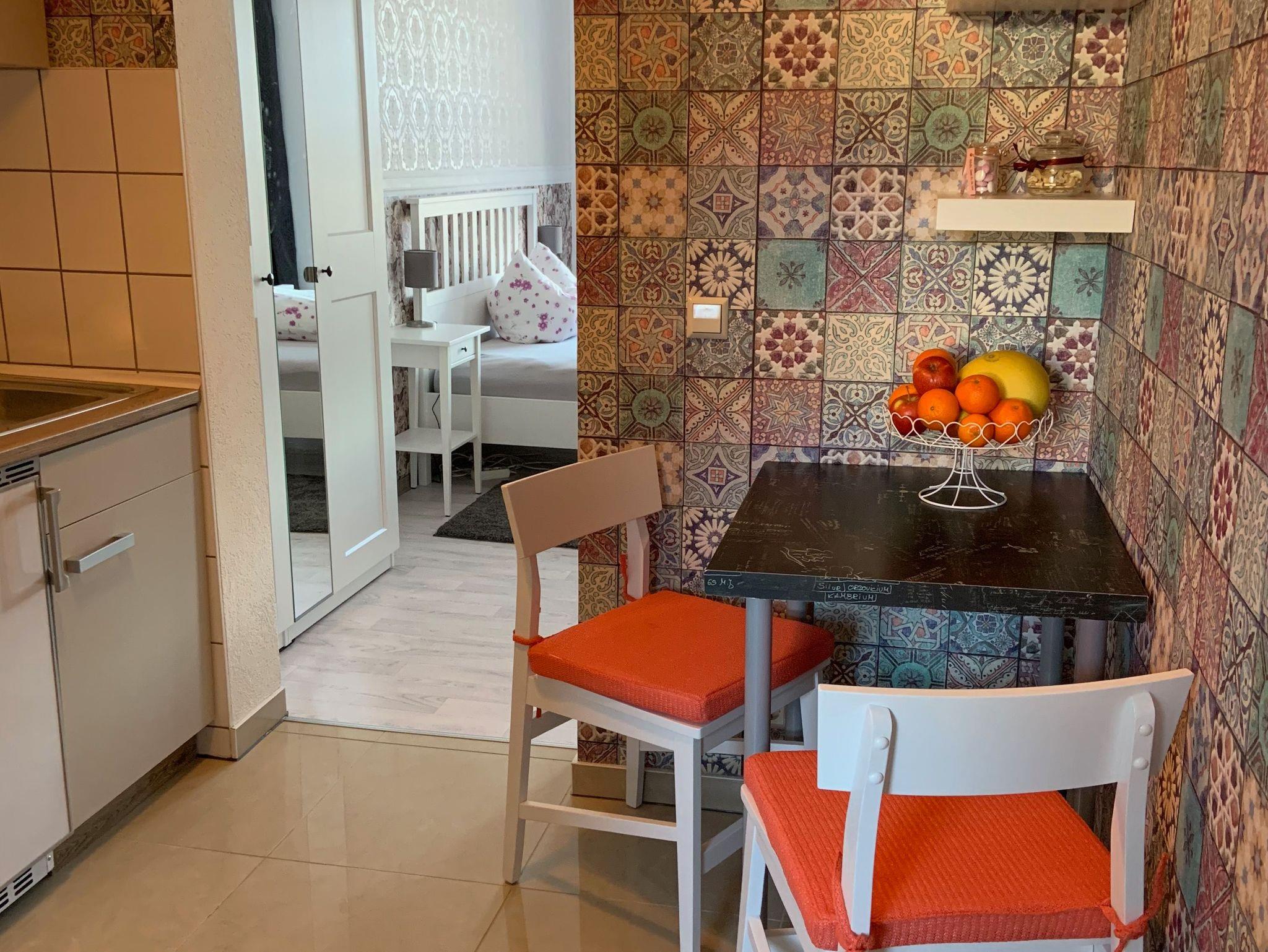 Die Küche bietet alle Annehmlichkeiten, um schnelle Köstlichkeiten zuzubereiten. Der Essbereich grenzt unmittelbar an und bieten Platz für zwei. Das Schlafzimmer Röschen ist ein Rückzugsort mit geschmackvoller Einrichtung, der für eine angenehme Nachtruhe sofort.